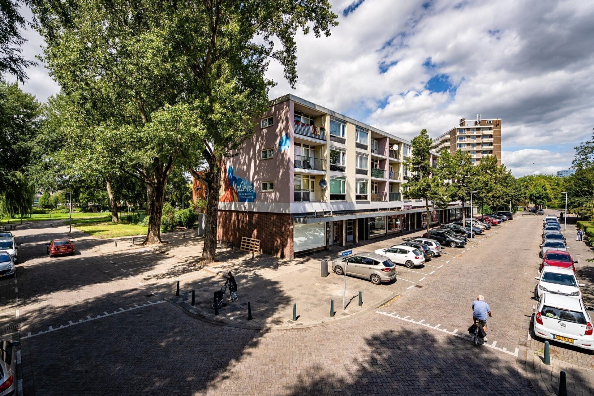 In de plint van het gebouw aan de Dumasstraat bevinden zich 8 winkelruimtes van ca. 70 m², Aan de achterzijde (Molièreweg) bevinden zich 9 bedrijfsruimtes van ca. 20 m² en 2 garages/opslagruimtes van elk ca. 20 m². De winkelruimtes aan de voorzijde zijn grotendeels gekoppeld aan de achtergelegen bedrijfsruimtes. Twee achtergelegen garages worden apart verhuurd en zijn dus niet gekoppeld.