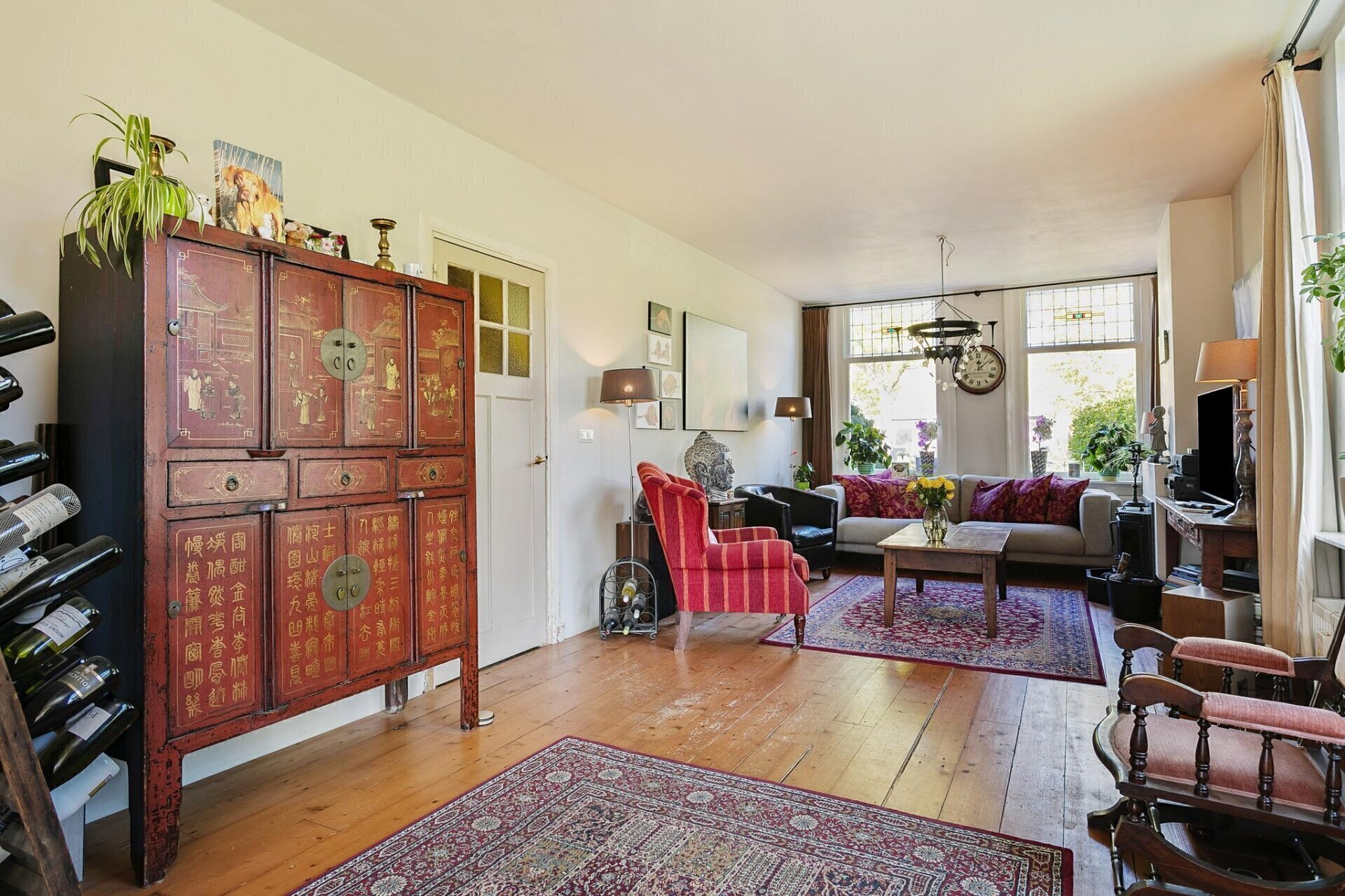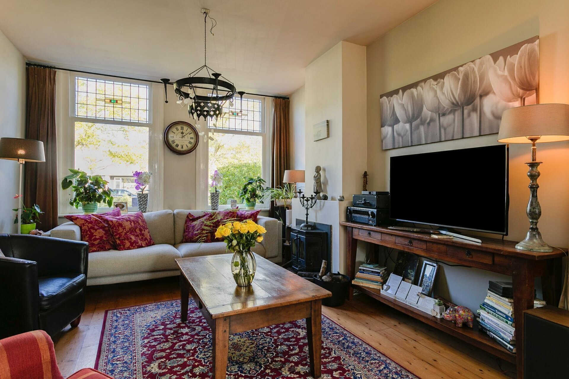 De royale woonkamer is voorzien van een houten afwerkvloer en een sfeervolle gezellige houtkachel. De raampartijen zijn grotendeels voorzien van dubbel glas en glas- in lood facetten. De ruimte wordt verwarmd door middel van radiatoren en vloerverwarming.