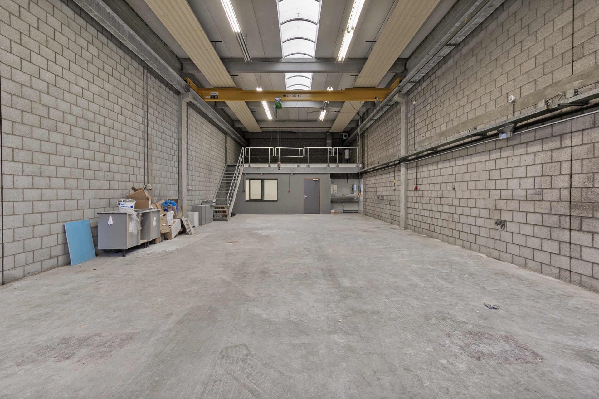Praktisch ingerichte bedrijfsruimte voorzien van een gekeurde bovenloopkraan met een draagvermogen van maximaal 1.000 kg, met twee eigen parkeerplaatsen voor de deur op afgesloten terrein.