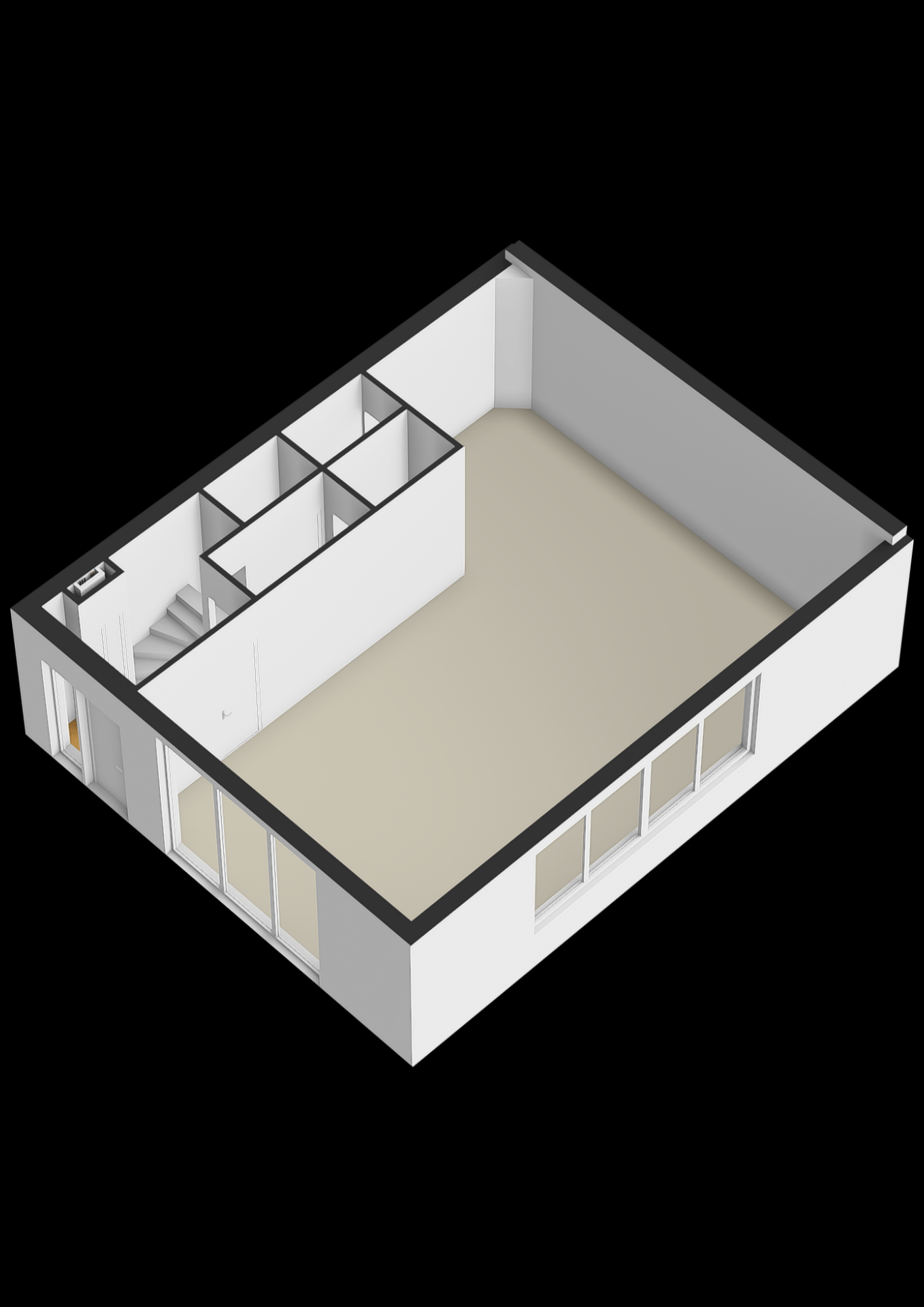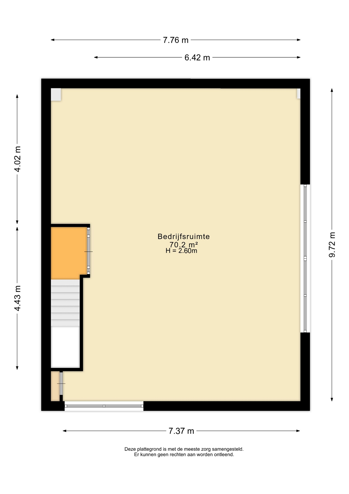 Bedrijfsruimte van circa 80 m² geschikt voor gebruik als kantoor, magazijn en/of werkplaats. De ruimte is vrij indeelbaar en voorzien van een entree, hal met toilet, open trap naar de verdieping en toegang tot de bedrijfsruimte.