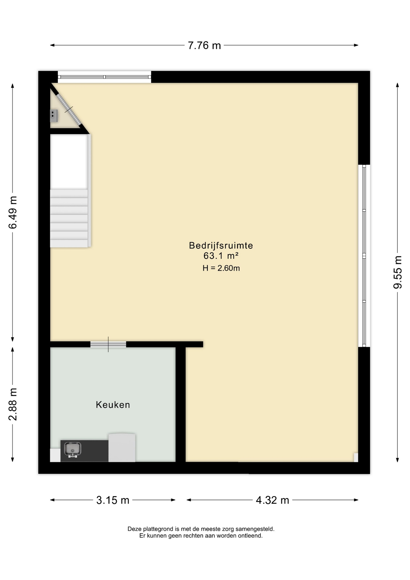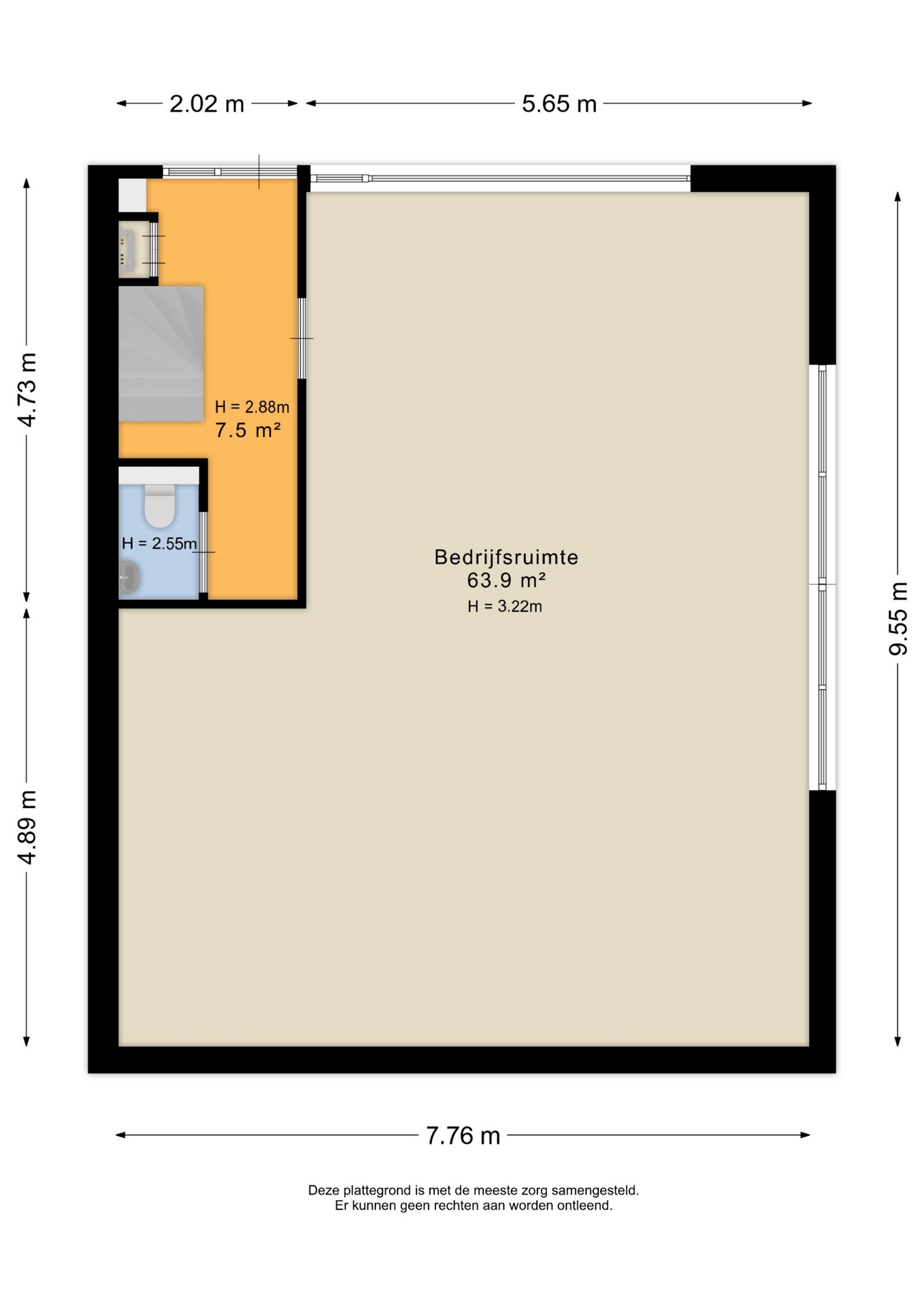 Bedrijfsruimte van circa 80 m² geschikt voor gebruik als magazijn en/of werkplaats. De ruimte is vrij indeelbaar en voorzien van een entree, hal met toilet, open trap naar de verdieping, toegang tot de bedrijfsruimte.