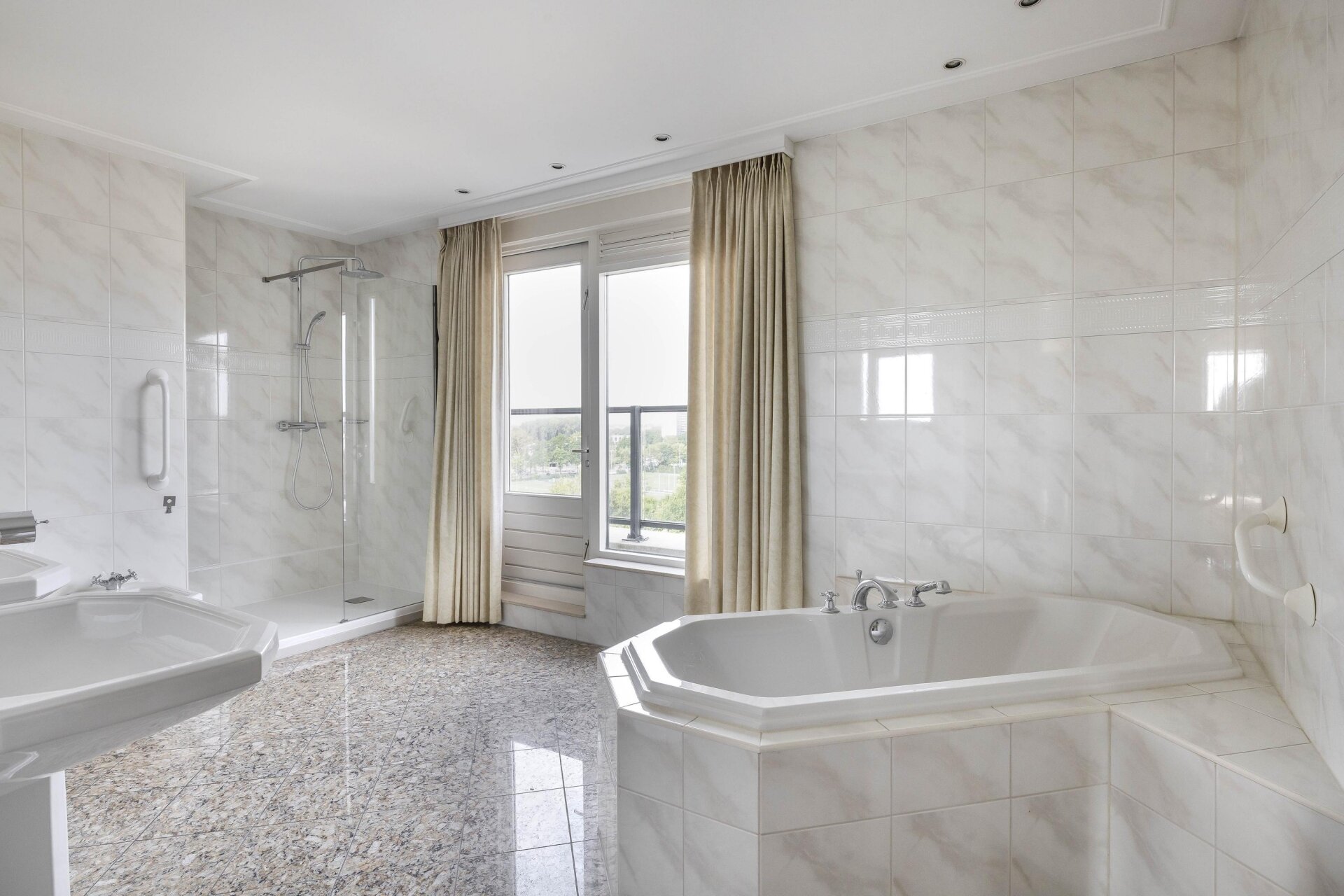 Wanneer u het penthouse betreedt, wordt u begroet door een ruime hal die toegang biedt tot een praktische vaste kast, een chic toilet, de royale woonkamer en de keuken. De keuken, uitgevoerd in een elegante U-opstelling, is uitgerust met hoogwaardige inbouwapparatuur en een praktische inpandige kast voor uw voorraad. De woonkamer vormt het kloppende hart van het appartement en is omringd door talloze raampartijen die zorgen voor een overvloed aan daglicht. Het gaat niet alleen om de ruimte, maar vooral om het sensationele uitzicht! Via verschillende schuifpuien heeft u toegang tot een prachtig dakterras, waar u optimaal kunt genieten van het buitenleven. De woonkamer biedt ook toegang tot twee sfeervolle slaapkamers, evenals een kantoorruimte die uiteraard ook als derde slaapkamer kan dienen. Beide slaapkamers zijn voorzien van een luxe badkamer ensuite, terwijl de master bedroom bovendien beschikt over een royale inloopkast en een aangrenzende wasruimte.