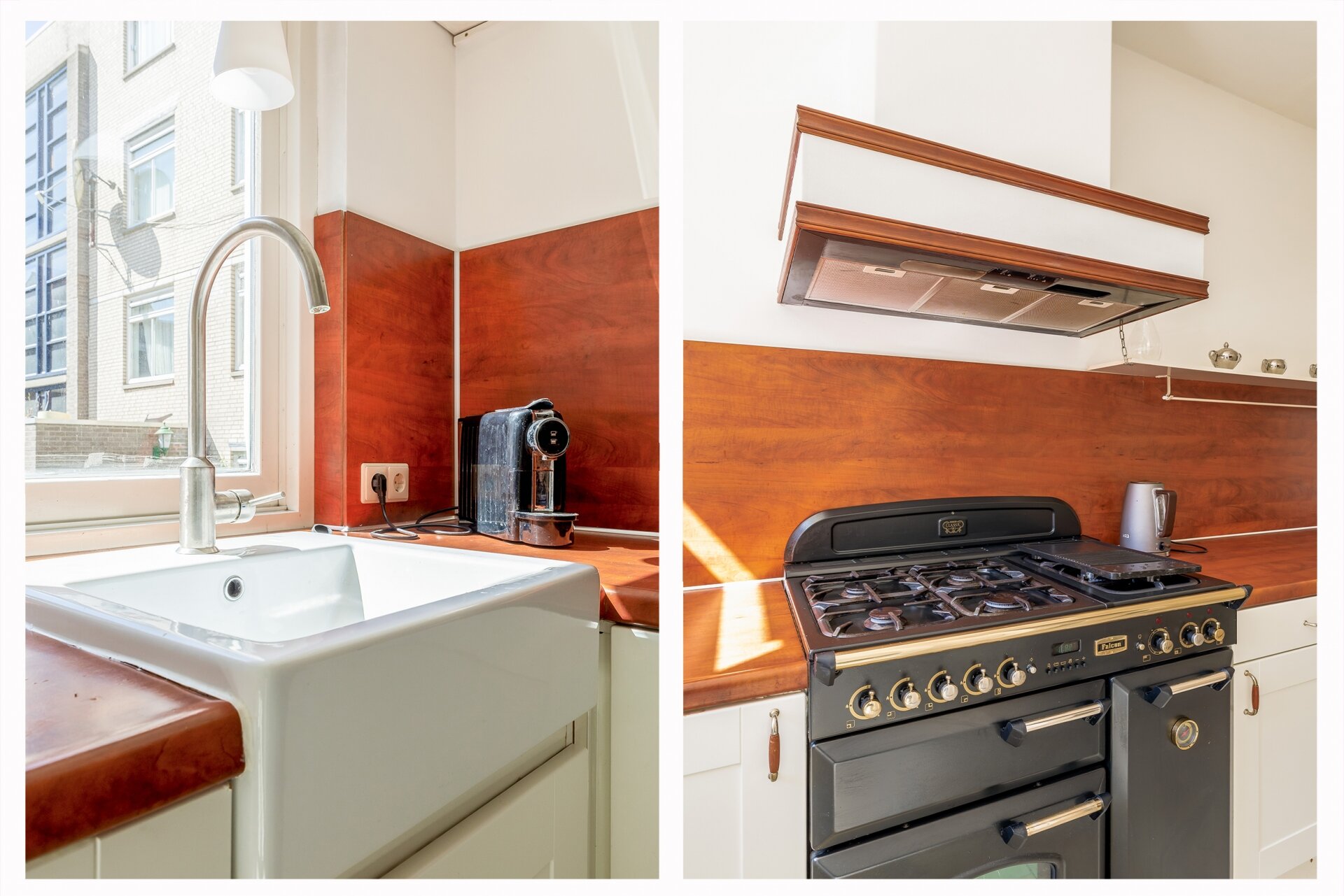 Bij binnenkomst kom je in de imposante entree met marmeren tegels. Vanuit hier is de lange hal met toilet en trapkast toegankelijk, die het leefgedeelte verbindt. Direct valt de hoogte van de plafonds op. De woonkamer van 14 meter lang is momenteel ingedeeld in een zitgedeelte aan de voorzijde en een eetgedeelte aan de achterzijde, met toegang tot de halfopen keuken. Door de ruime indeling heb je voldoende mogelijkheden om de ruimte helemaal naar eigen smaak in te richten. Voorheen was het souterrain bereikbaar via een trap in de eetkamer, maar het is ook mogelijk om deze verbinding opnieuw te realiseren. De keuken is uitgerust met een 5-pits gasfornuis met oven, afzuigkap, vaatwasser, spoelbak en koel-vriescombinatie. Dit is een heerlijke plek waar je tijdens het koken interactie kunt hebben met je gezelschap.
