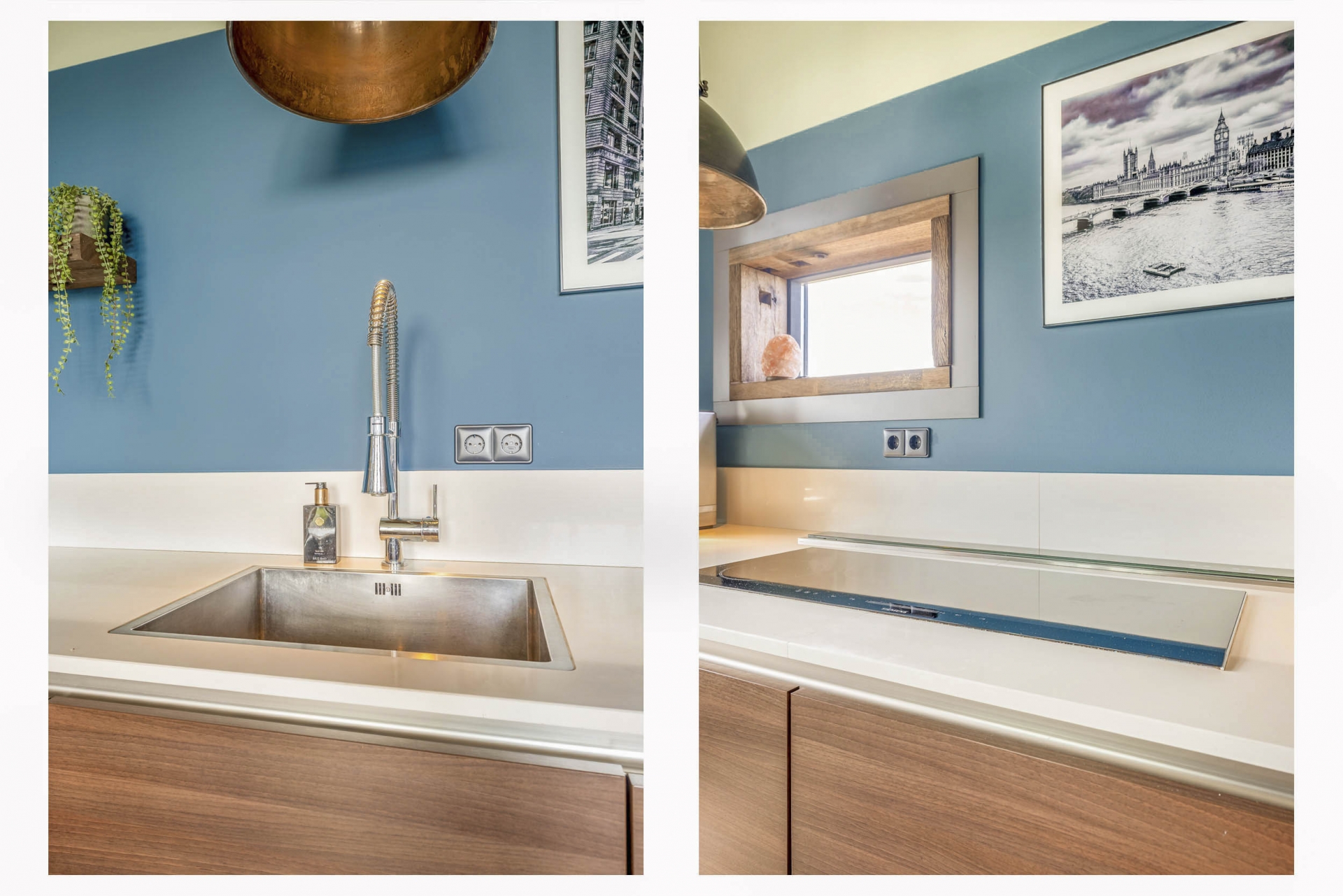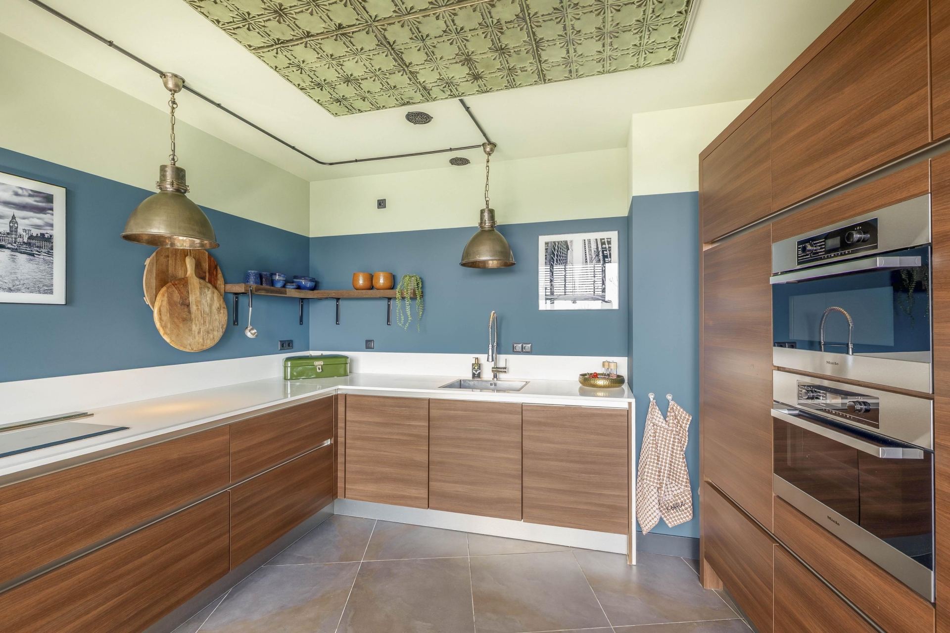 De luxe half-open keuken van 14 m² is in een U-opstelling geplaatst, heeft een composiet werkblad en is voorzien van hoogwaardige (Miele) inbouwapparatuur; te weten een inductiekookplaat, afzuiging (geïntegreerd in het werkblad), 2 combi-magnetrons, vaatwasser, koelkast en vriezer. Het nieuwe raam zorgt voor licht en uitzicht.