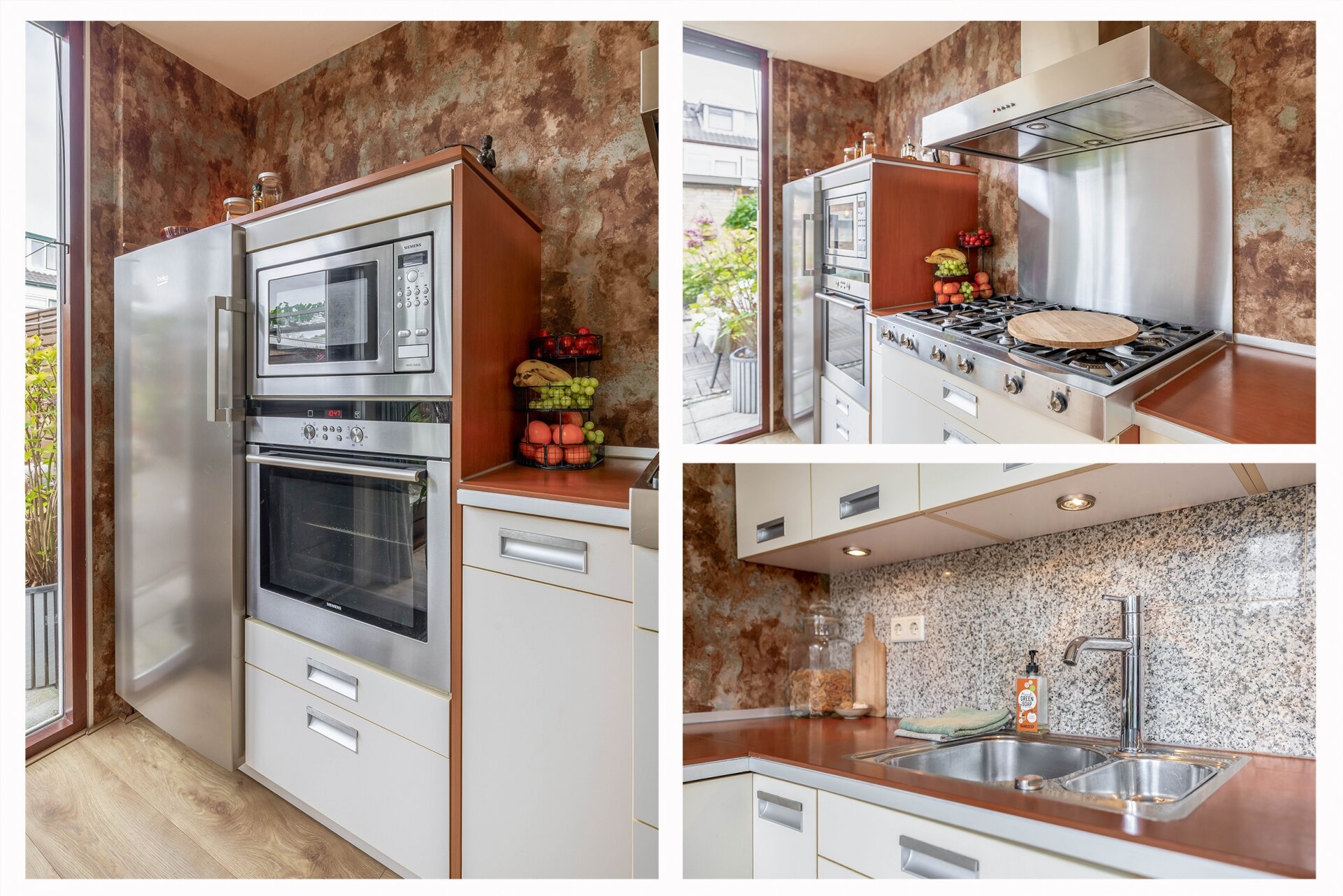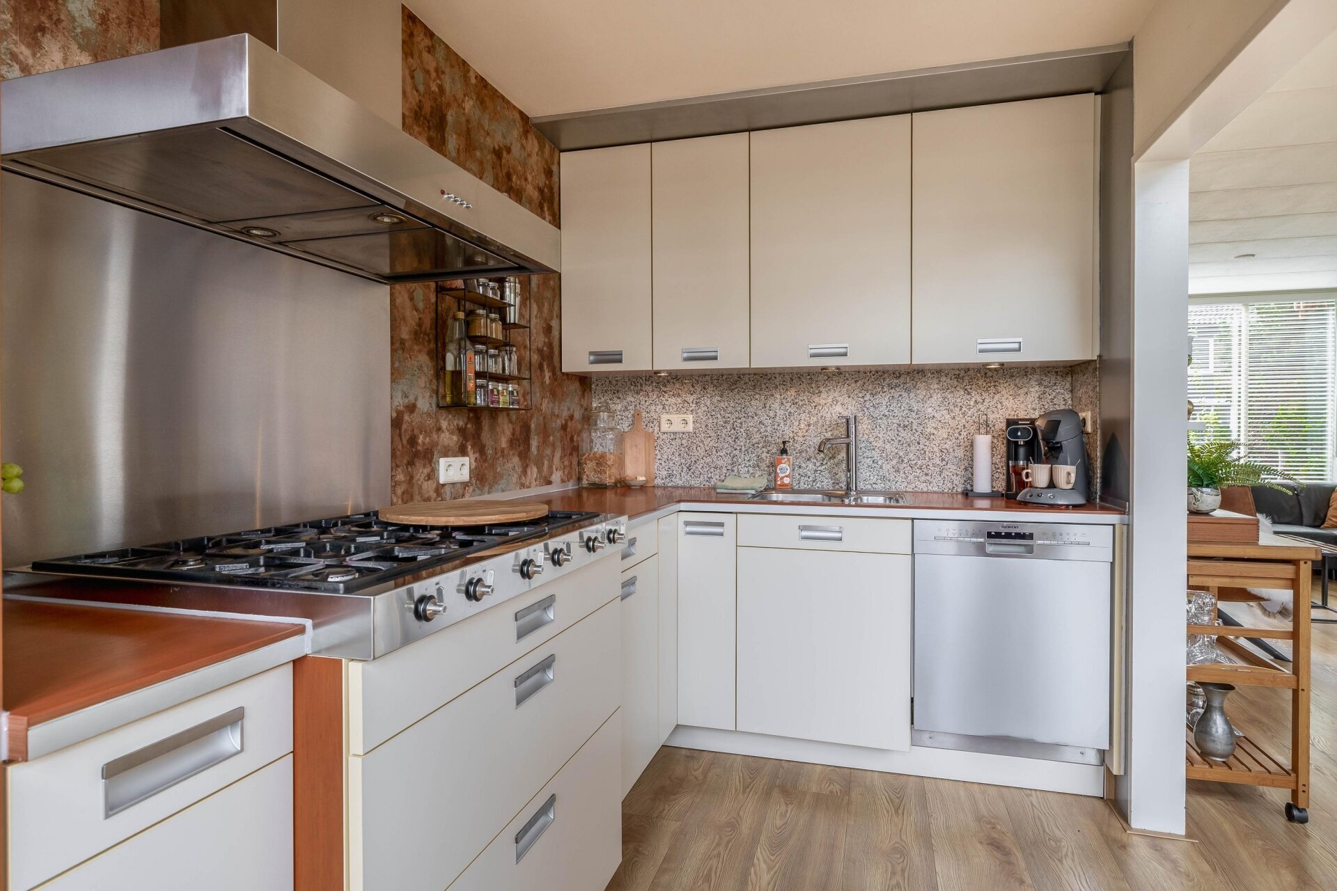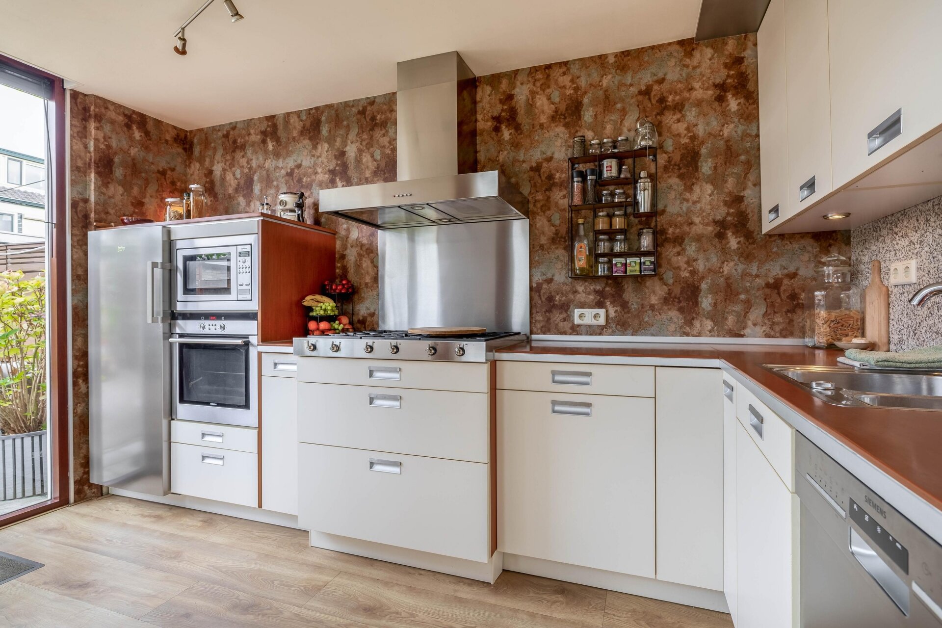 Het huis is praktisch ingedeeld met een modern toilet v.v. hangend closet en een royale uitgebouwde living en keuken op de begane grond. De keuken beschikt over diverse inbouwapparatuur, waaronder een groot 6-pits gasfornuis met oven, een afzuigkap, een vaatwasser, een magnetron en een koelkast. Dankzij de grote raampartijen en een toegangsdeur naar de tuin is er een fijne verbinding met buiten.