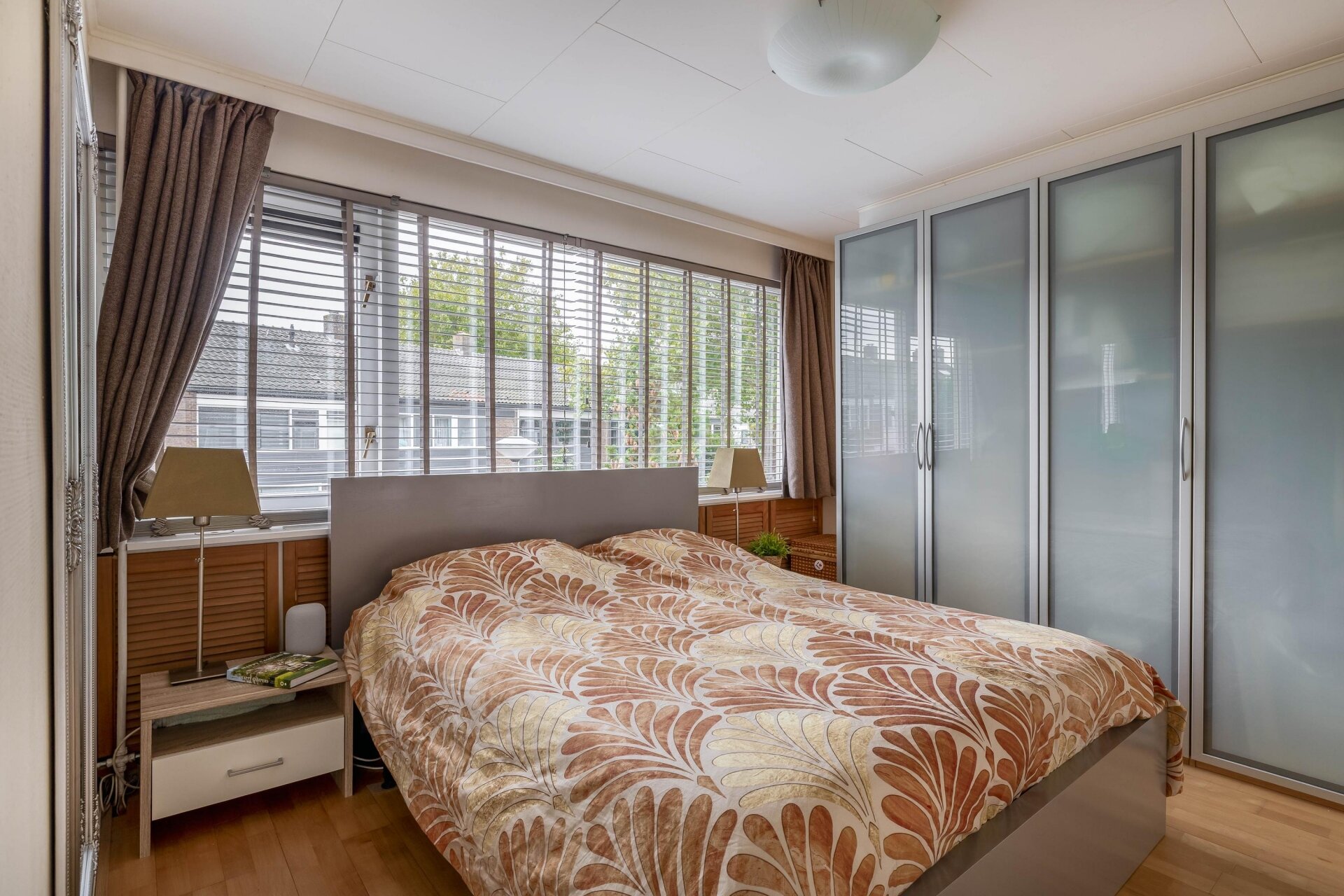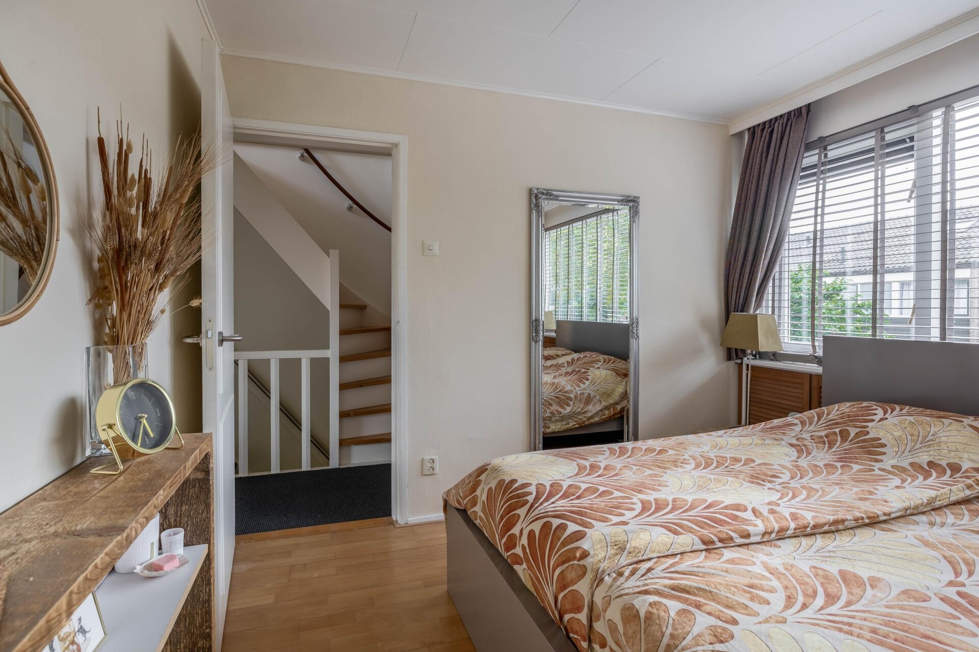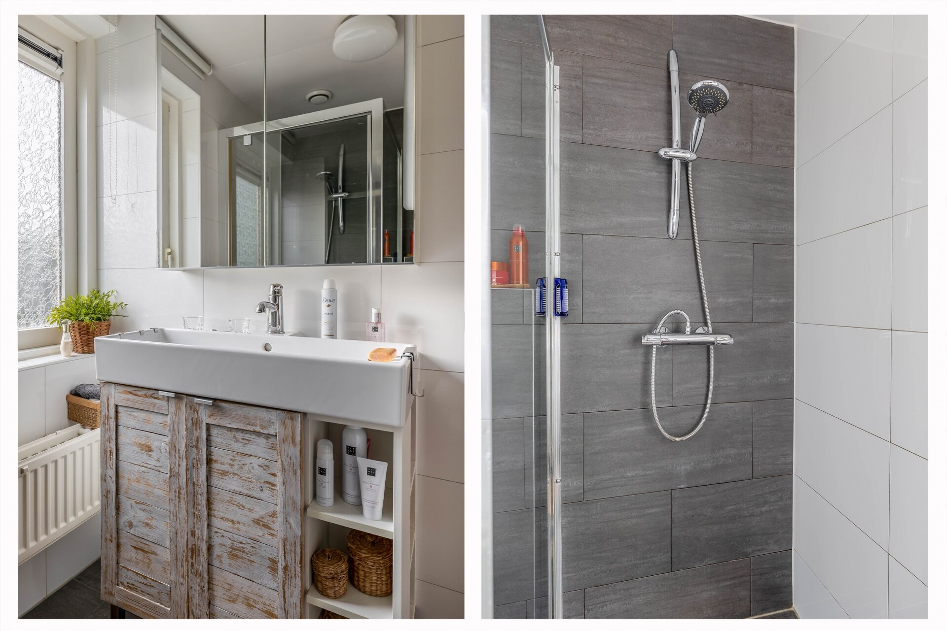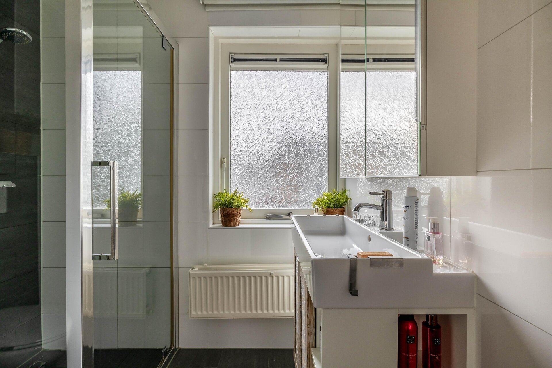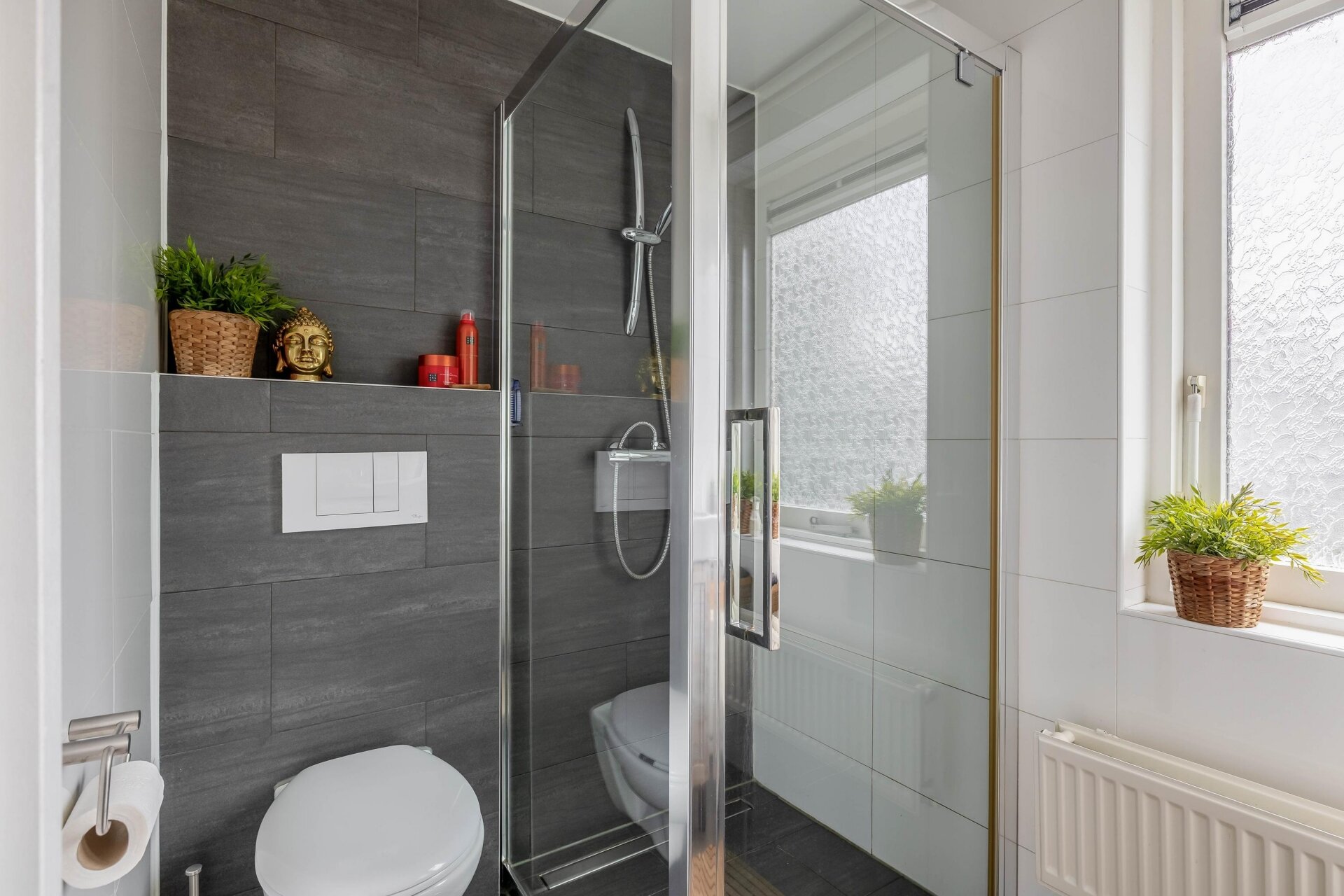 Op de eerste verdieping drie slaapkamers en de badkamer. De grootste slaapkamer ligt aan de achterzijde, met uitzicht op de tuin. Ook aan de voorzijde vind je een ruime kamer, nu in gebruik als kinderkamer, en een derde kamer die perfect werkt als kantoor of kastenkamer. De moderne badkamer is stijlvol afgewerkt en voorzien van een inloopdouche, wastafel met meubel en tweede hangend closet.
