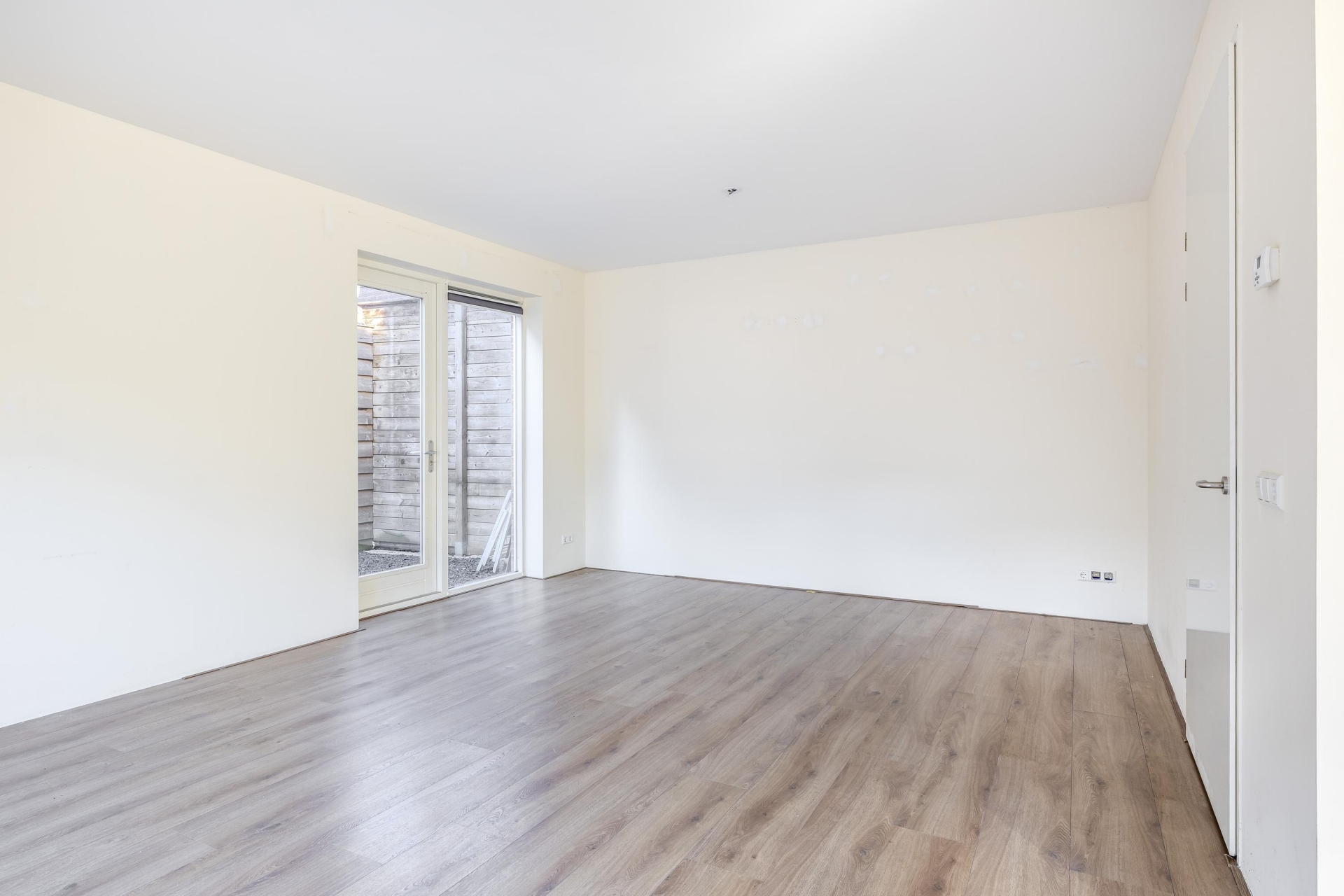 Entree woning vanuit gezamenlijk terrein; hal met meterkast; ruime interne berging met technische installatie zoals de warmtepomp en de aansluiting voor de wasmachine en droger; moderne badkamer met douche, wastafel en hangend toilet. Lichte woonkamer van circa 27.5 m2 met moderne open keuken (circa 7.5 m2) v.v. een koelkast, vrieskast, kookplaat, combi-magnetron, afzuigkap en een vaatwasser. Patio van circa 9 m2.