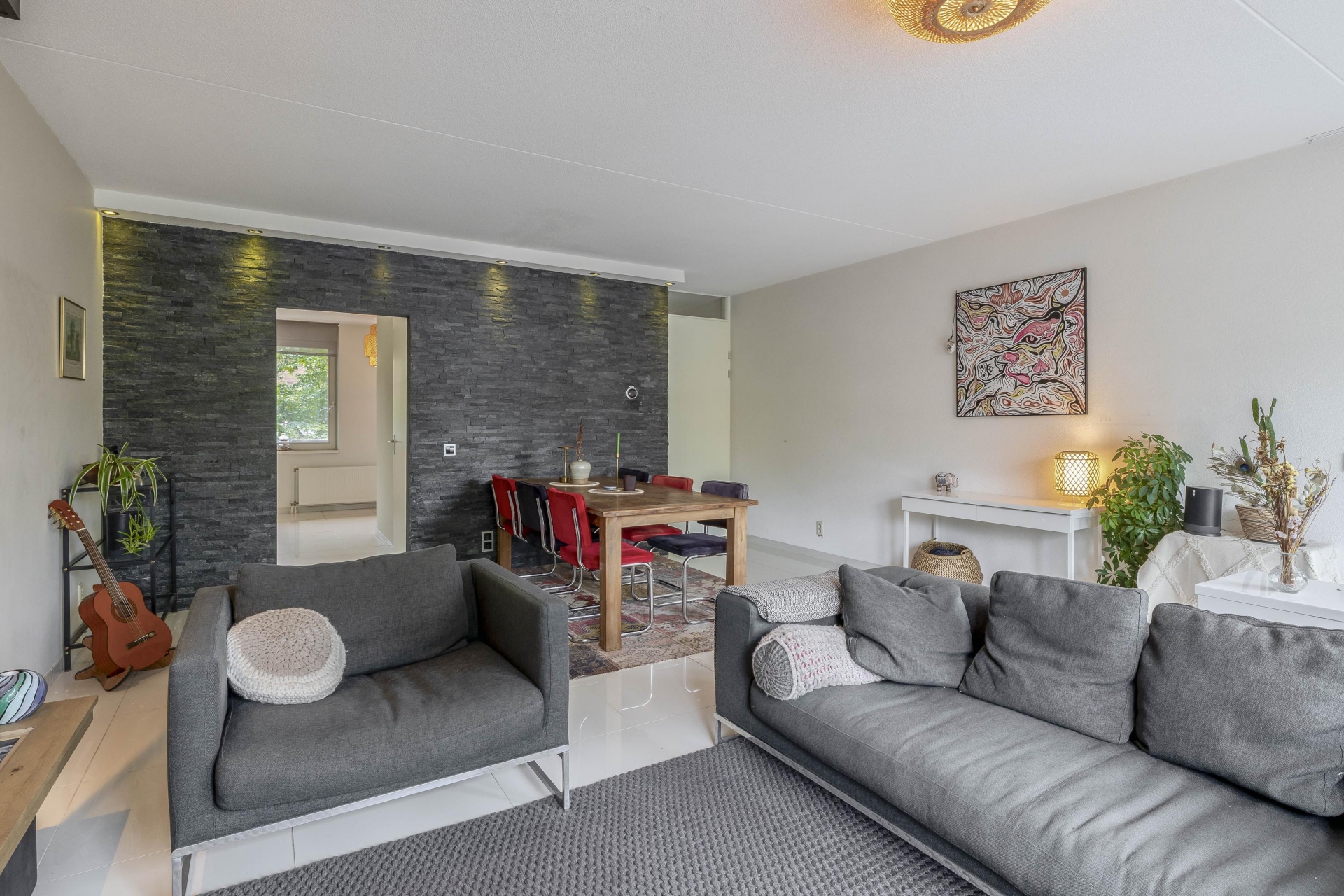 De woonkamer is een echte blikvanger. Grote raampartijen zorgen voor een overvloed aan daglicht, terwijl de woodup panelen direct warmte en sfeer brengen. De strakke plavuizen versterken de moderne uitstraling. De keuken sluit daar naadloos op aan: compleet met inbouwapparatuur en een praktische ontbijtbar waar je gezellig kunt aanschuiven.