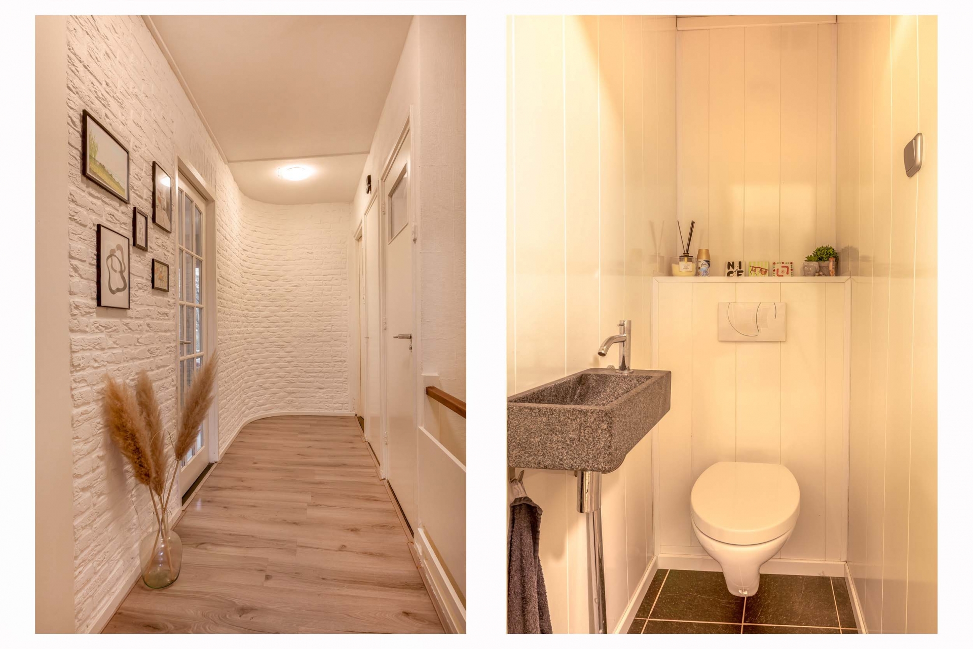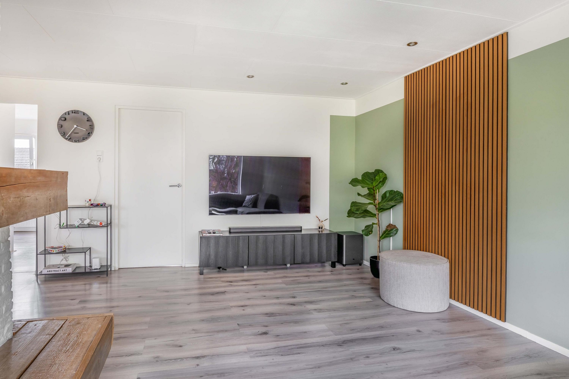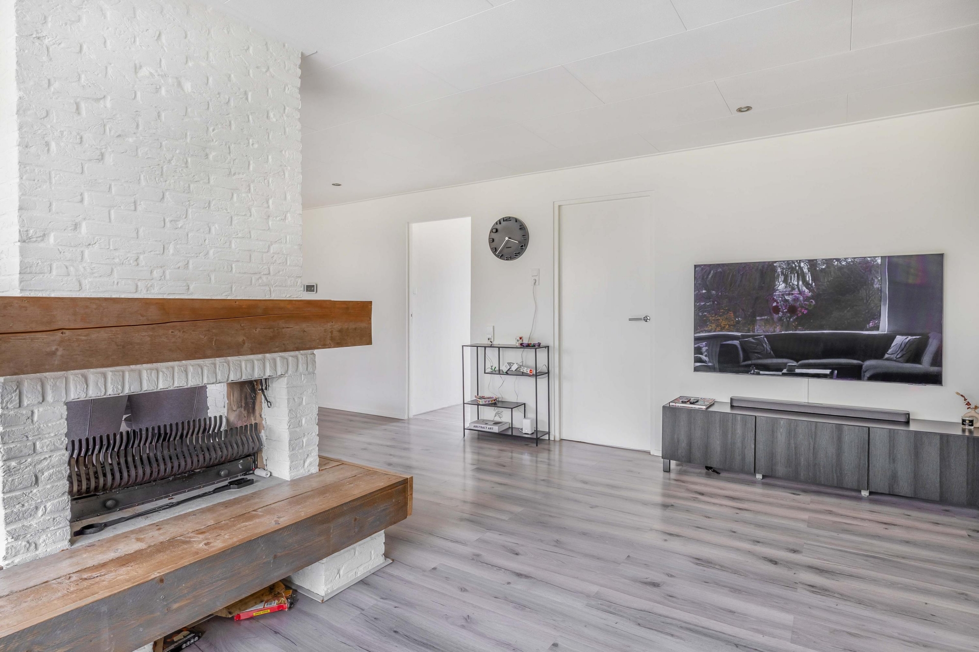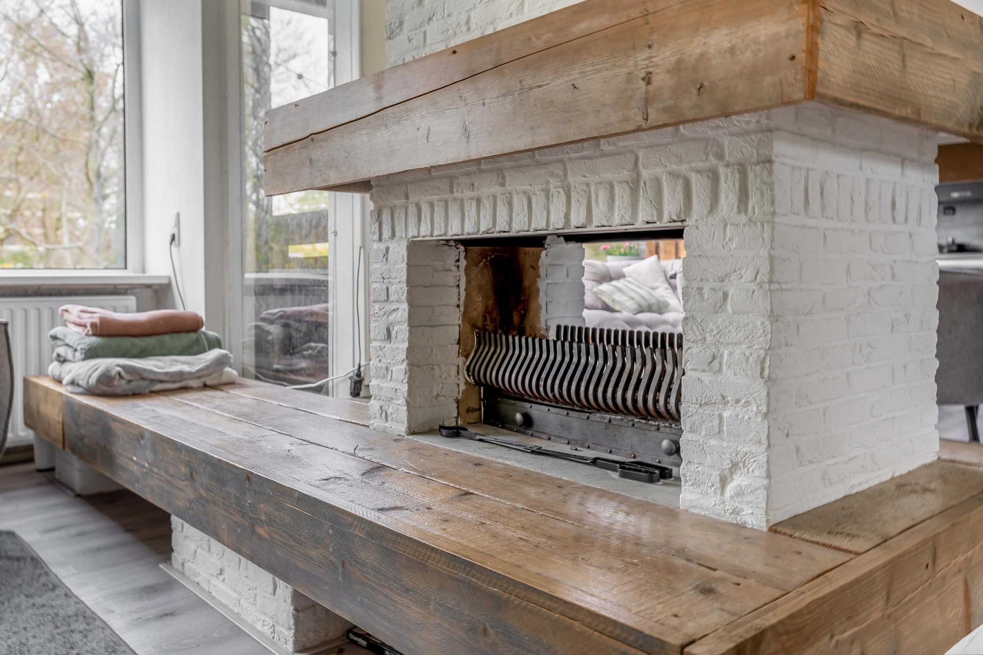 De woonkamer is ruim en licht, met genoeg plek voor een grote zithoek én een royale eettafel. De sfeervolle afwerking, zoals de houten details bij de haard en het rustige kleurgebruik, zorgen voor een warme uitstraling. Grote ramen aan de voorzijde geven zicht op het park aan de overkant van de straat. Een uitzicht dat nét even dat extra’s geeft aan het woongedeelte.
