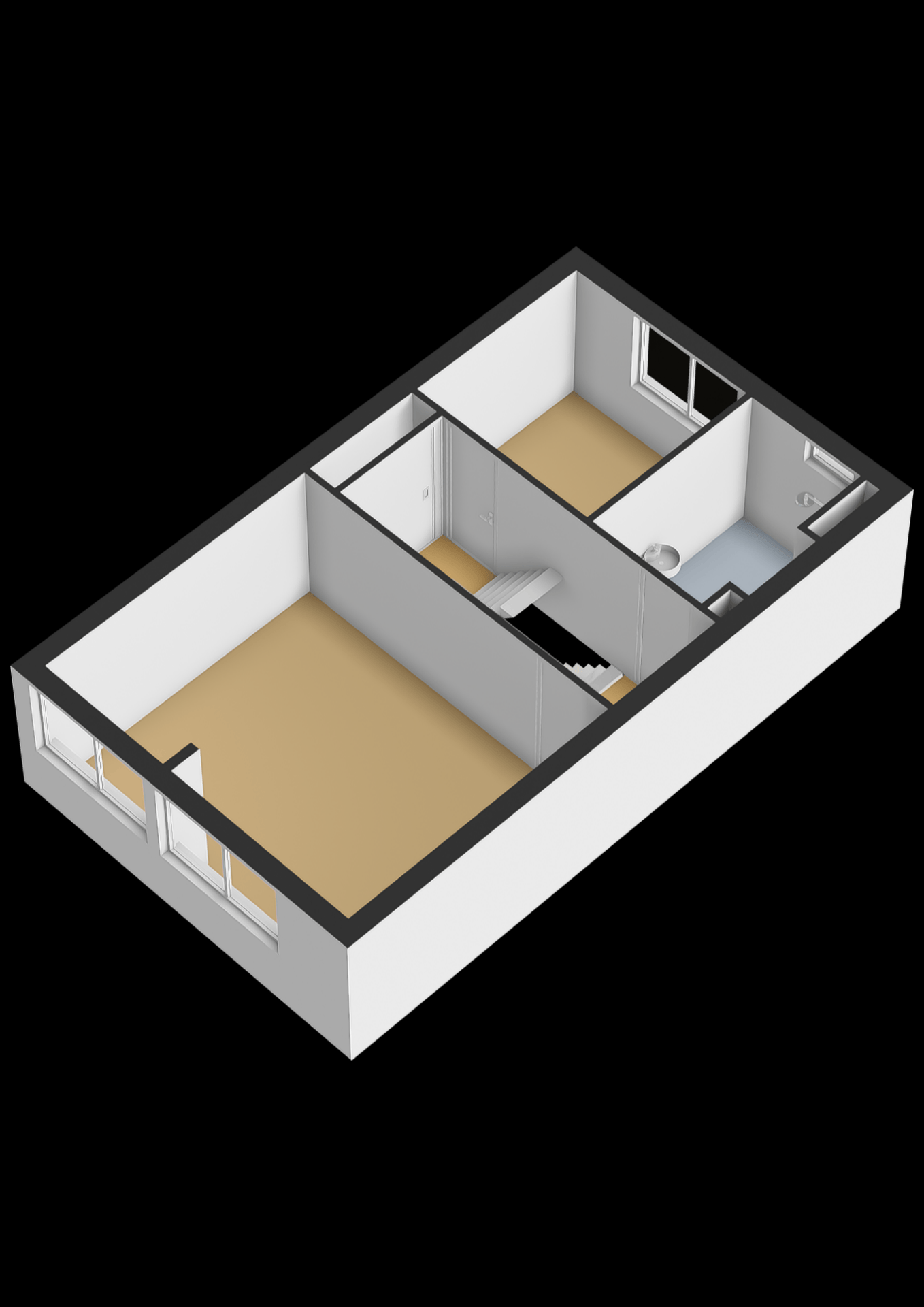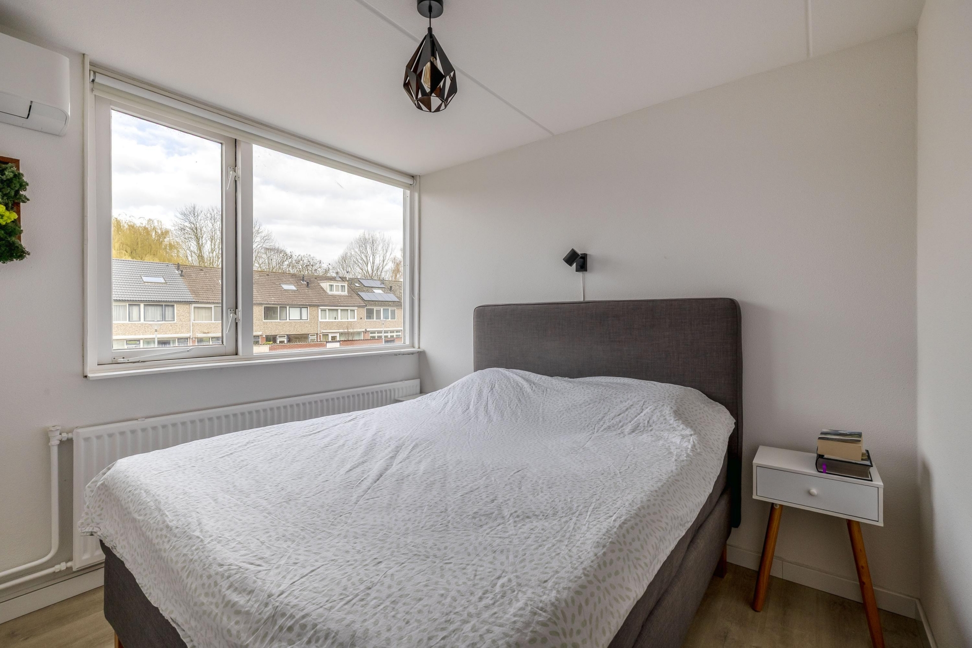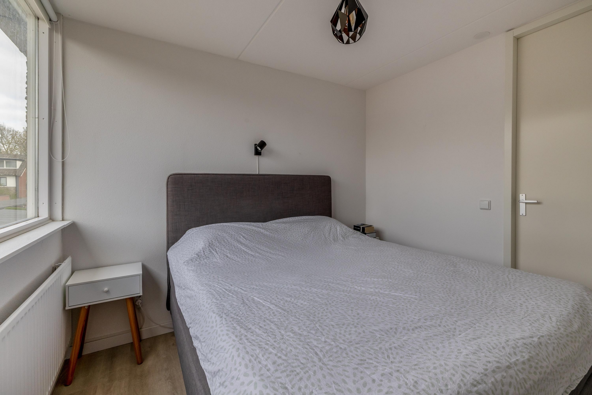 Op de eerste verdieping vind je twee slaapkamers, waarbij de grootste slaapkamer zich aan de achterzijde bevindt. Deze kamer is ruim opgezet en biedt meer dan voldoende plek voor een groot bed en kastenwand. Wat hier extra interessant is: deze kamer is groot genoeg om eenvoudig op te splitsen in twee volwaardige slaapkamers. Ideaal als je extra ruimte nodig hebt voor een gezin of een aparte werkplek.