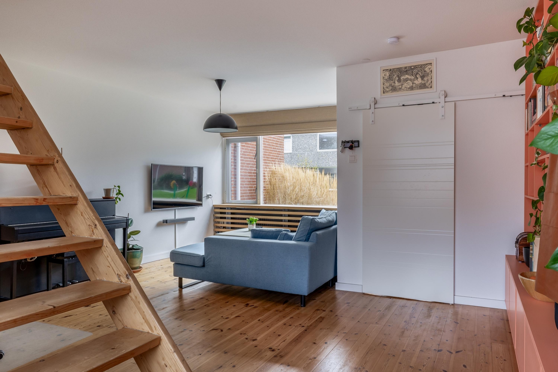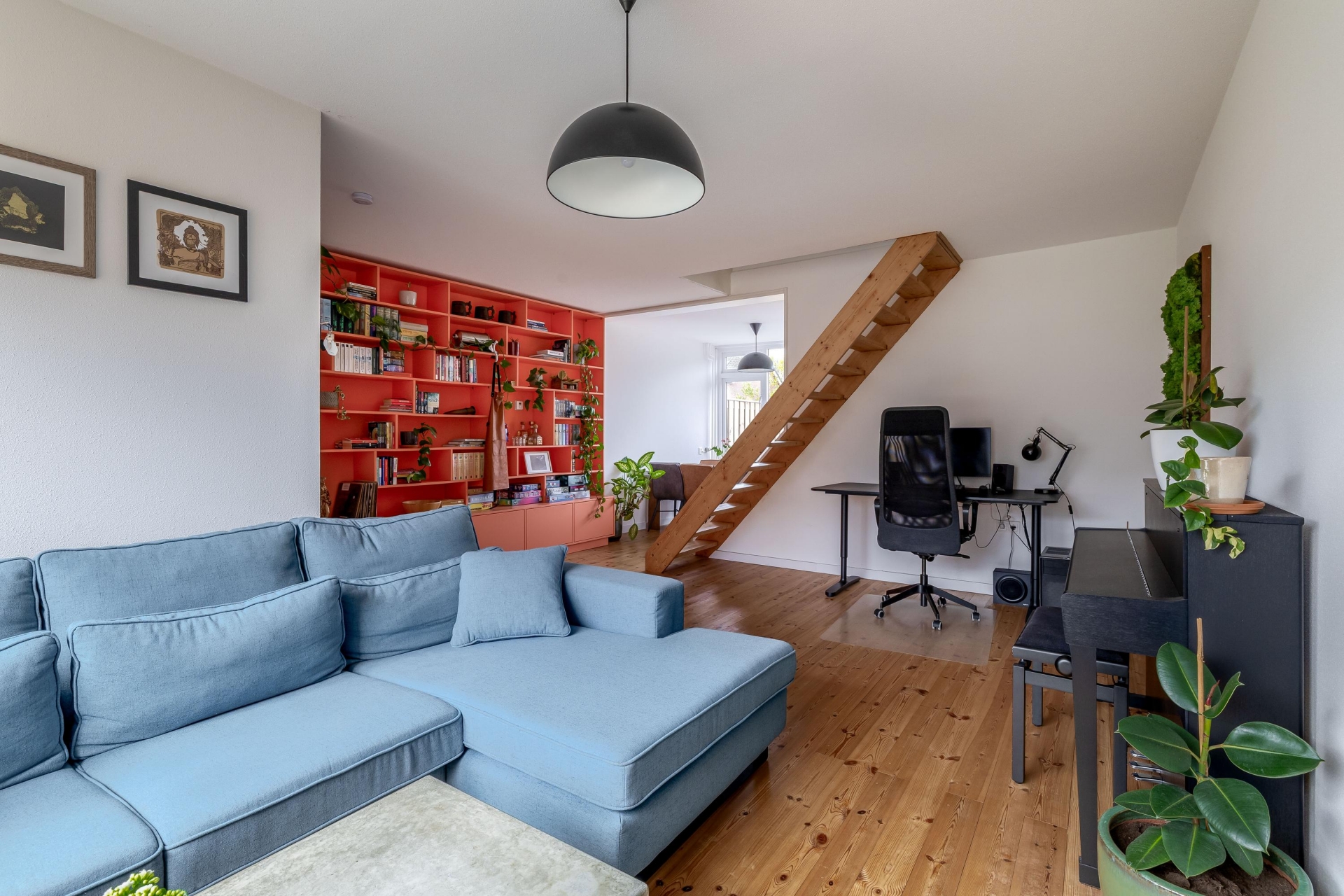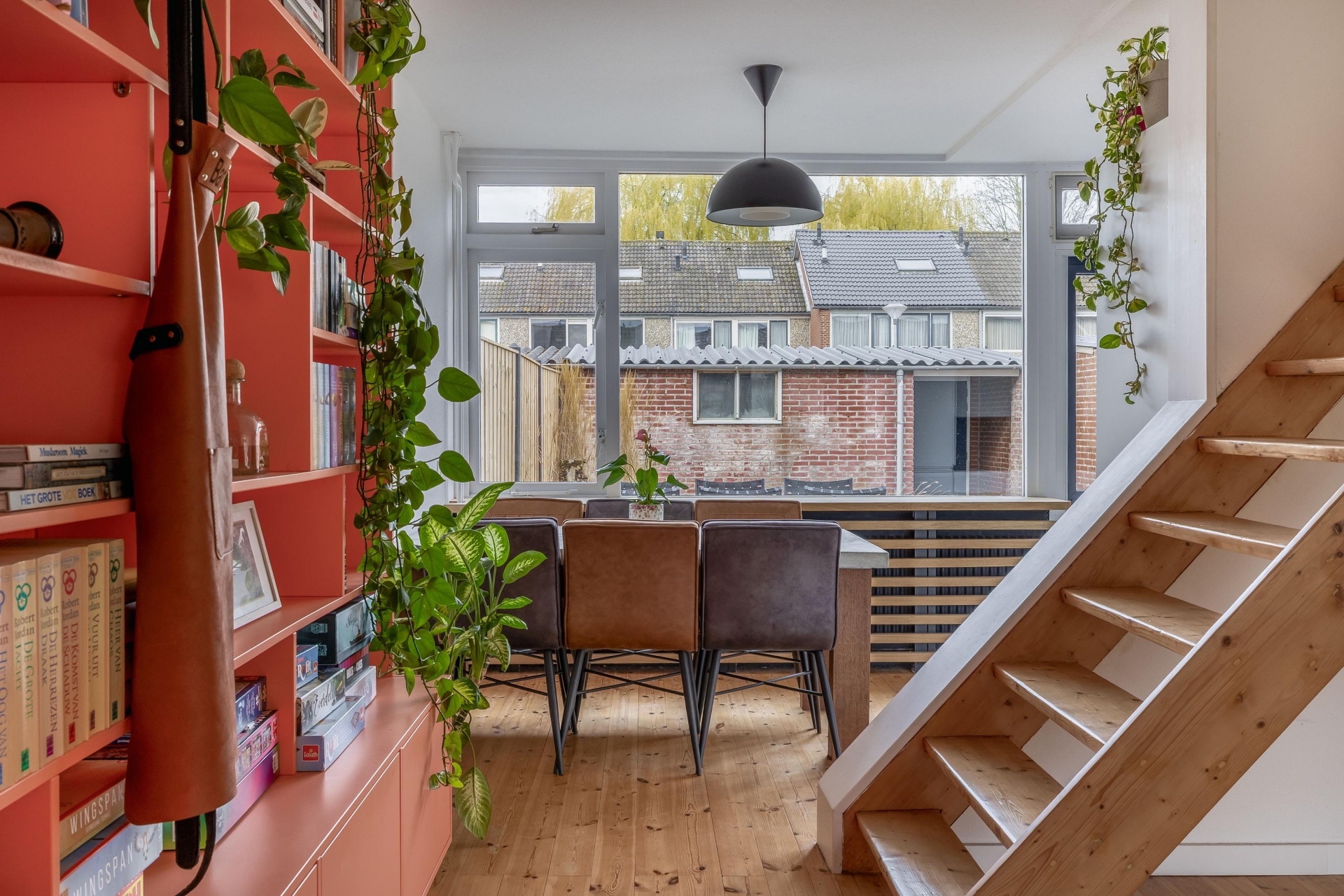 De indeling is speels en praktisch, mede door de open trapopgang die subtiel in de ruimte is verwerkt. Hierdoor ontstaat er een natuurlijke verdeling tussen het zitgedeelte aan de voorzijde en de eetkamer richting de keuken. Of je nu een avond op de bank ploft of uitgebreid wilt tafelen met vrienden, hier kan het allebei.