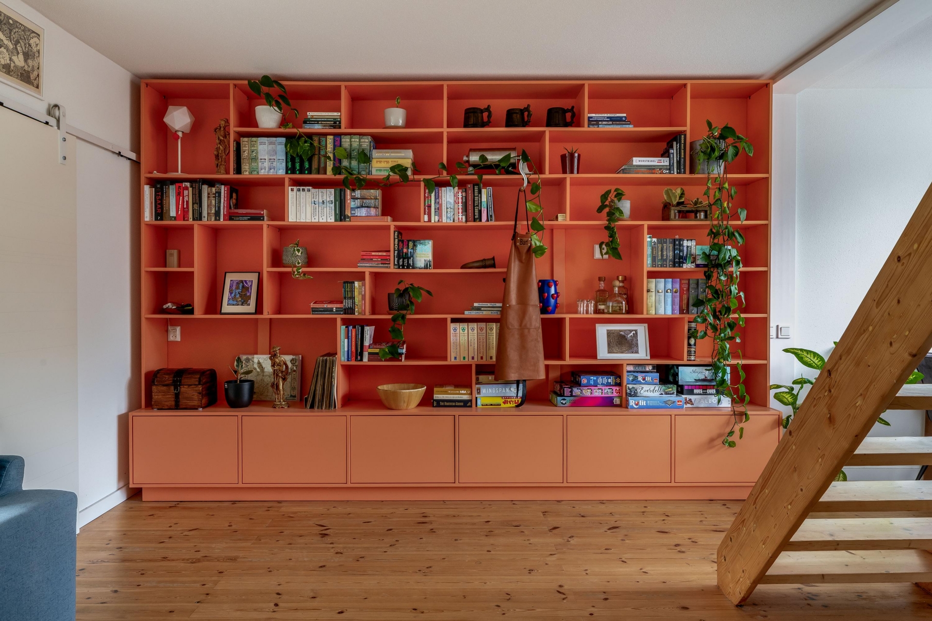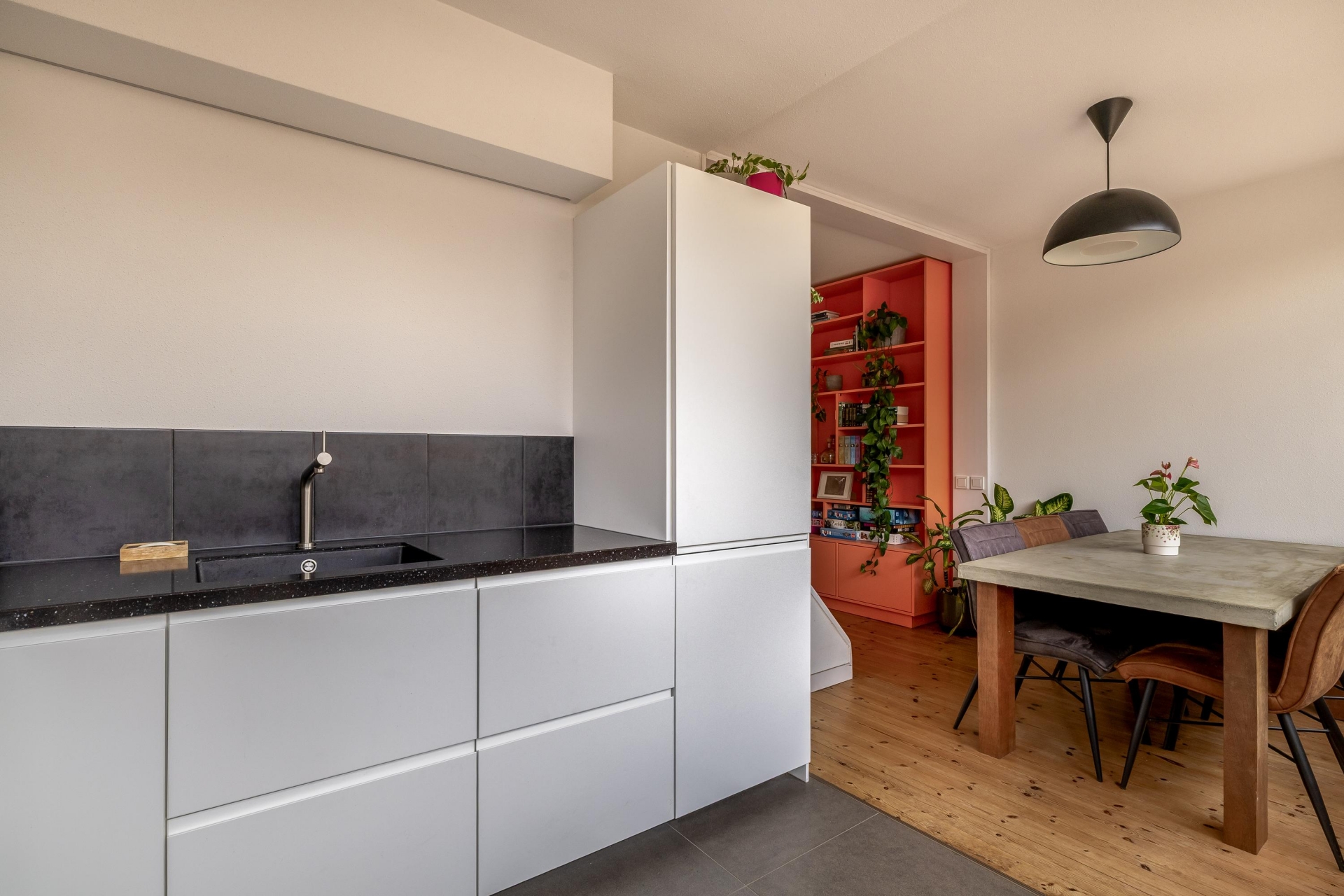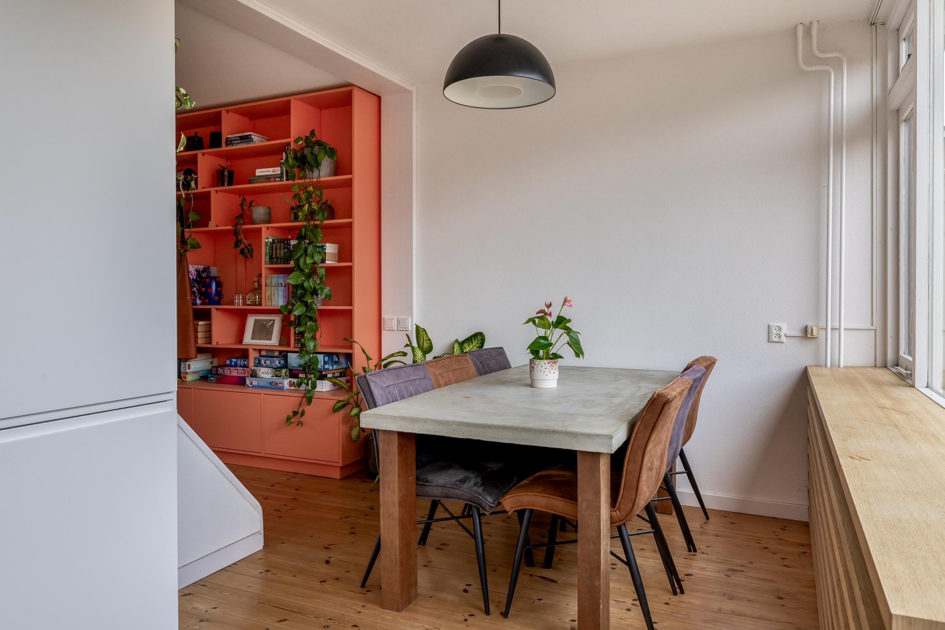 De indeling is speels en praktisch, mede door de open trapopgang die subtiel in de ruimte is verwerkt. Hierdoor ontstaat er een natuurlijke verdeling tussen het zitgedeelte aan de voorzijde en de eetkamer richting de keuken. Of je nu een avond op de bank ploft of uitgebreid wilt tafelen met vrienden, hier kan het allebei.