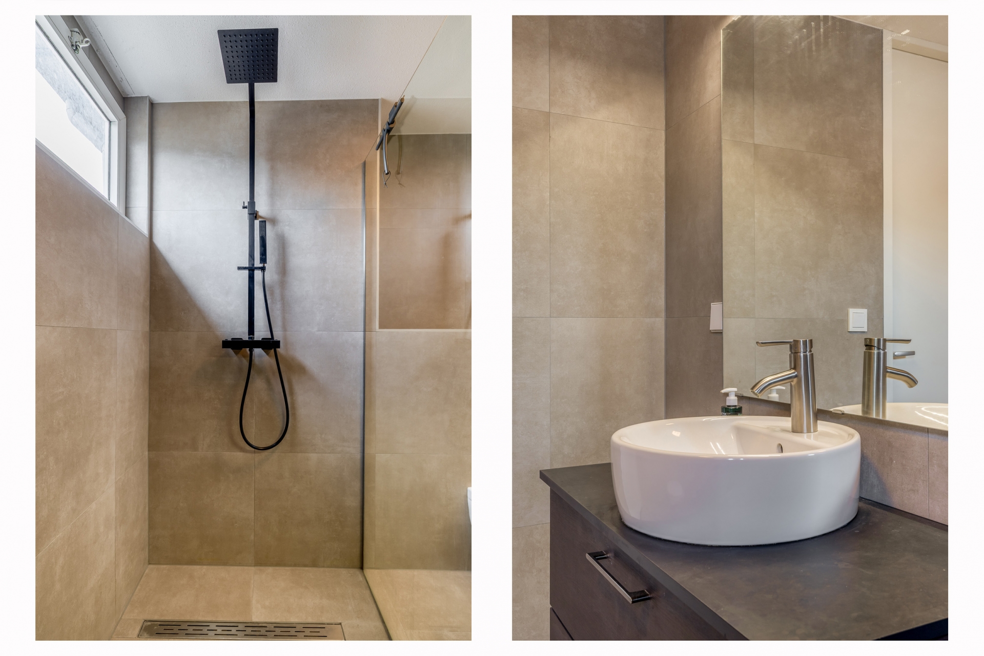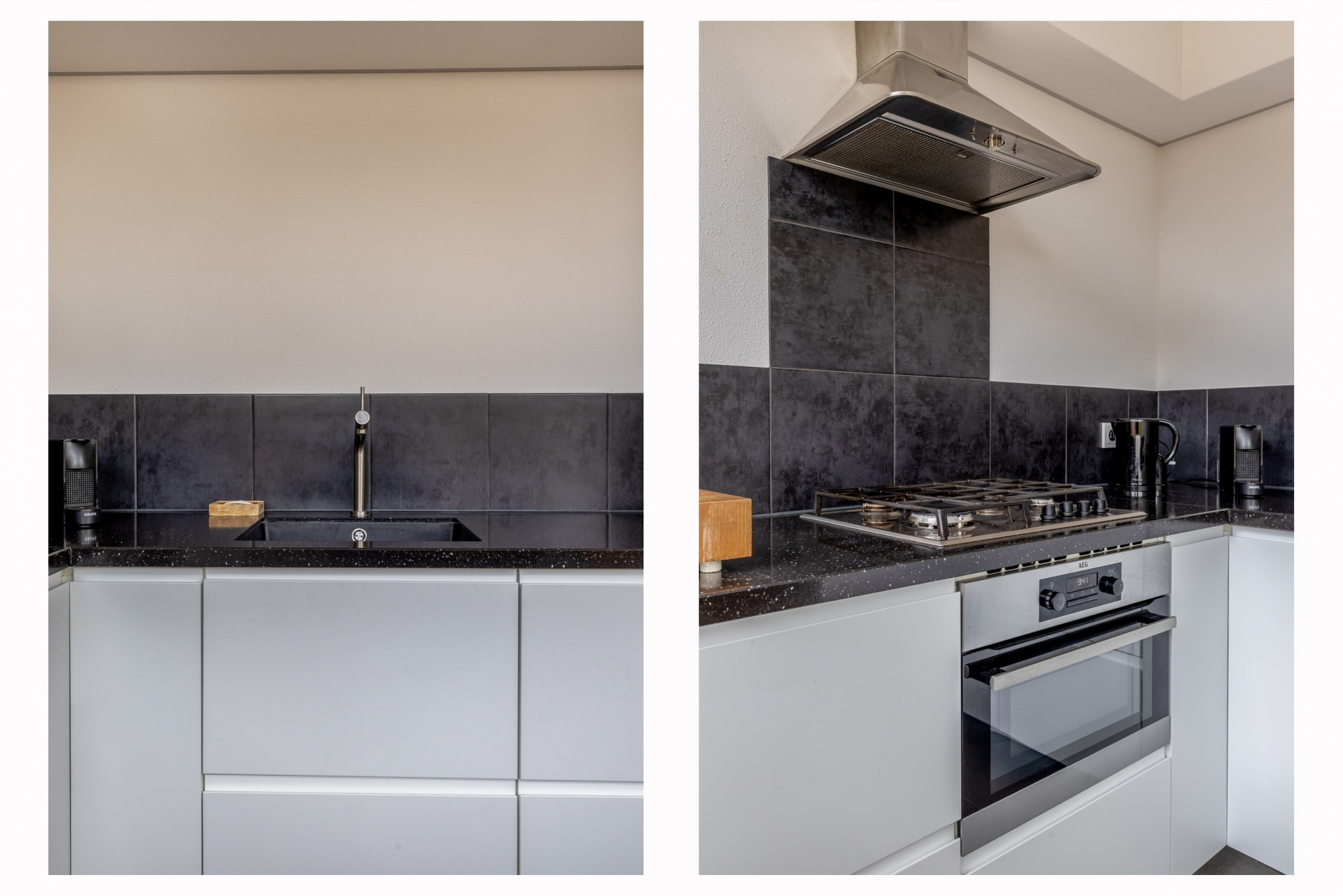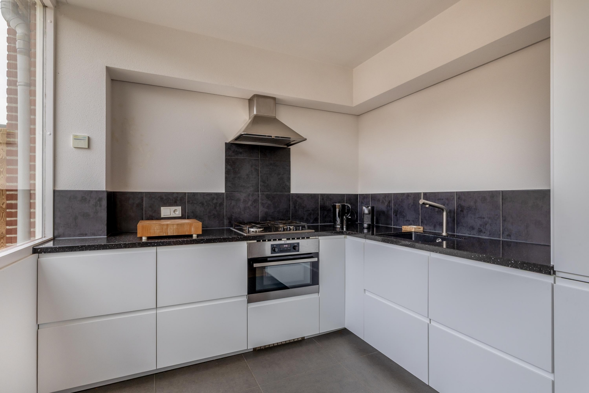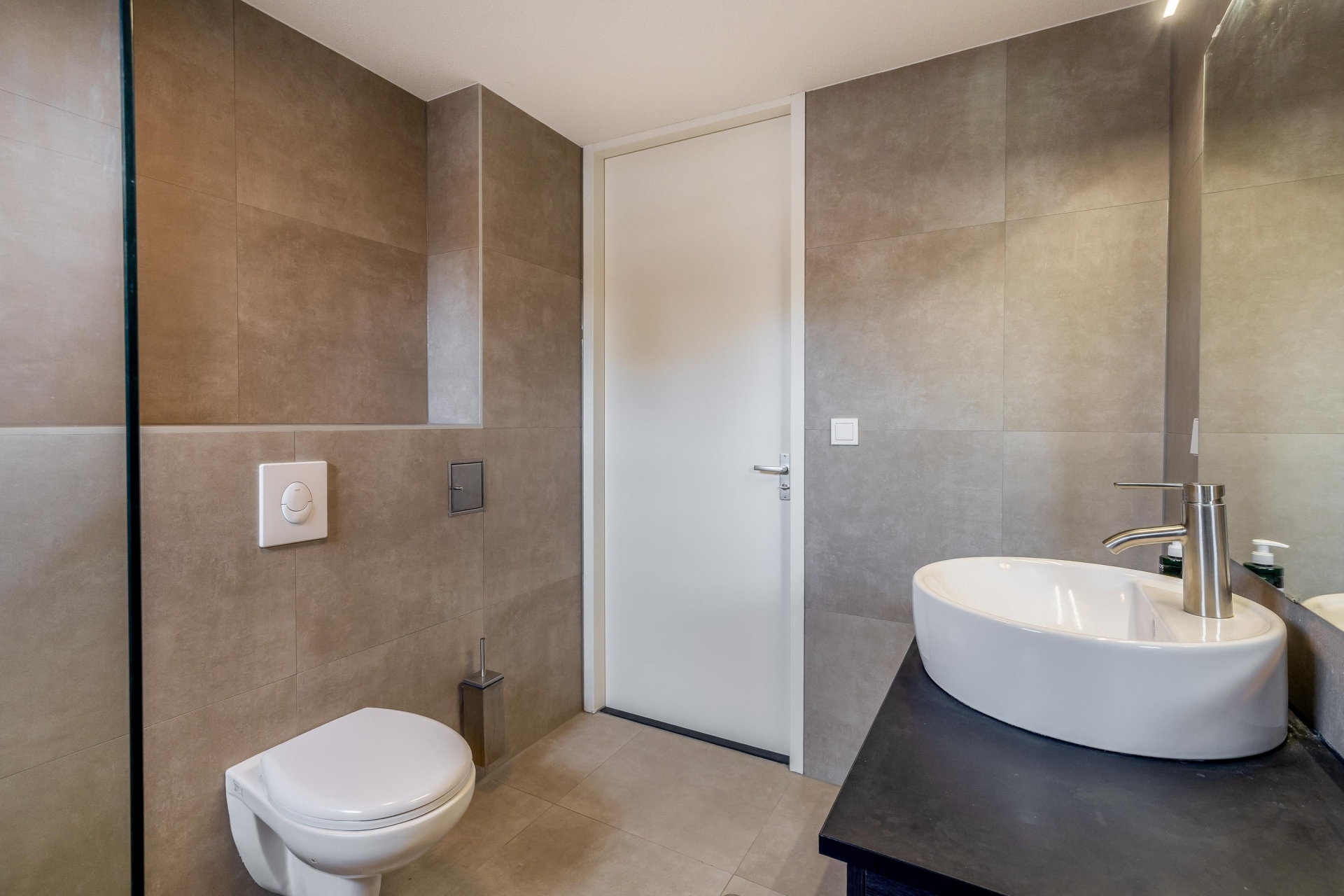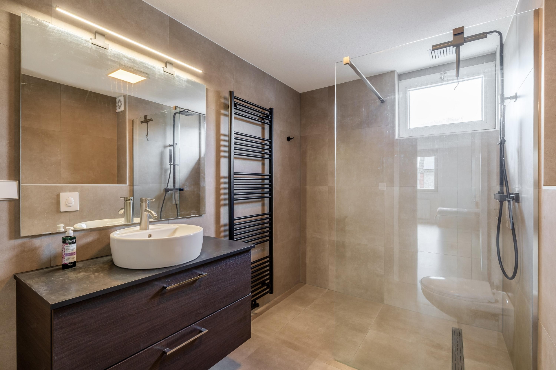 De keuken is strak uitgevoerd en voorzien van alles wat je nodig hebt. Dankzij de praktische opstelling heb je voldoende werk- en bergruimte en kun je hier prima uit de voeten, of je nu snel iets klaarmaakt of uitgebreid wilt koken. De rustige kleurstelling en het moderne afwerkingsniveau sluiten goed aan bij de rest van het huis.