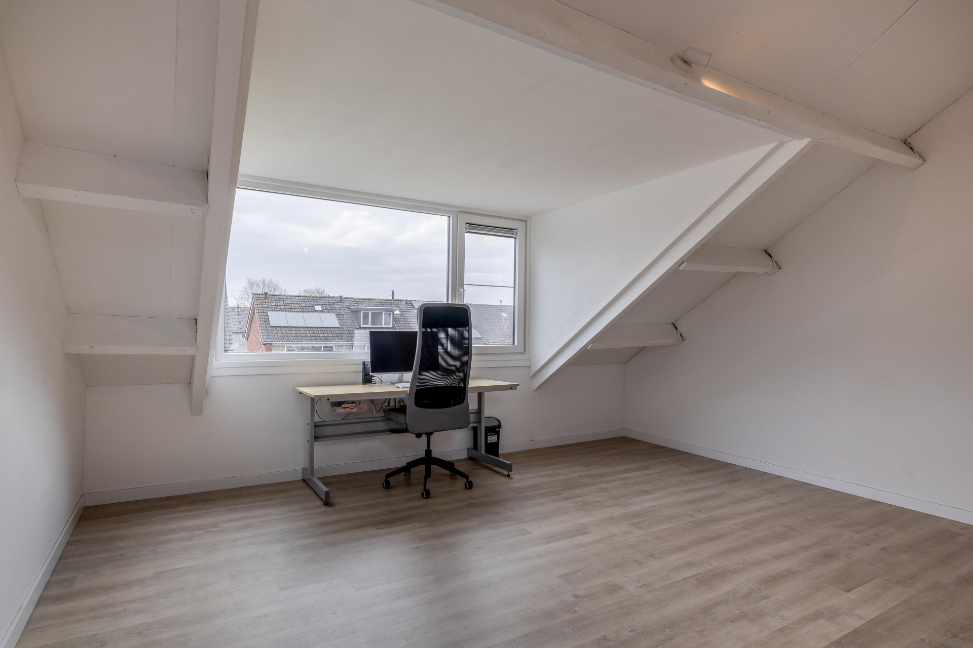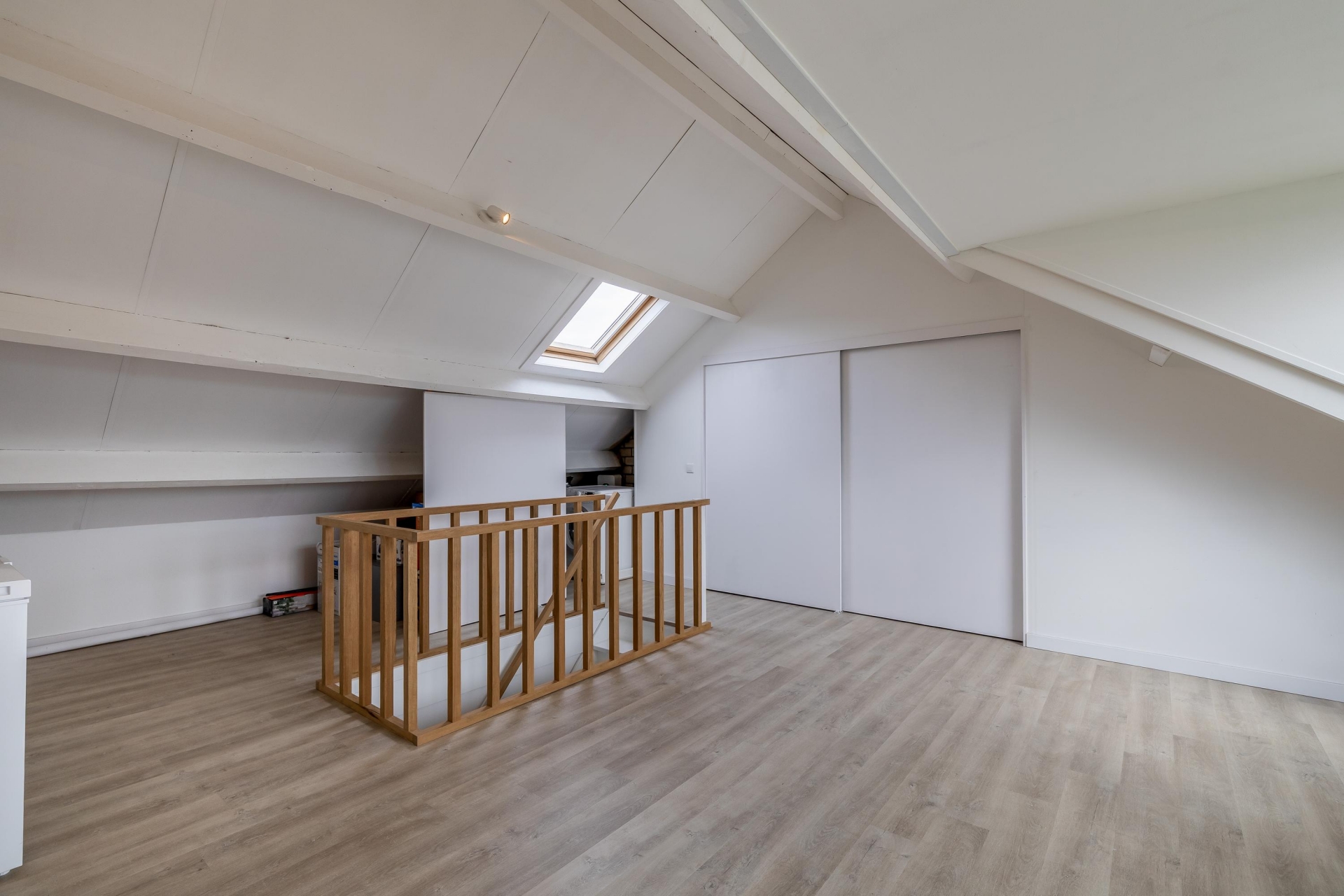 Op de tweede verdieping bevindt zich de zolderverdieping. Dit is een verrassend ruime open verdieping die je helemaal naar eigen wens kunt indelen. Denk aan een extra slaapkamer, werkruimte of hobbykamer. Met relatief eenvoudige aanpassingen creëer je hier een volwaardige extra kamer, wat het huis extra interessant maakt voor de toekomst.