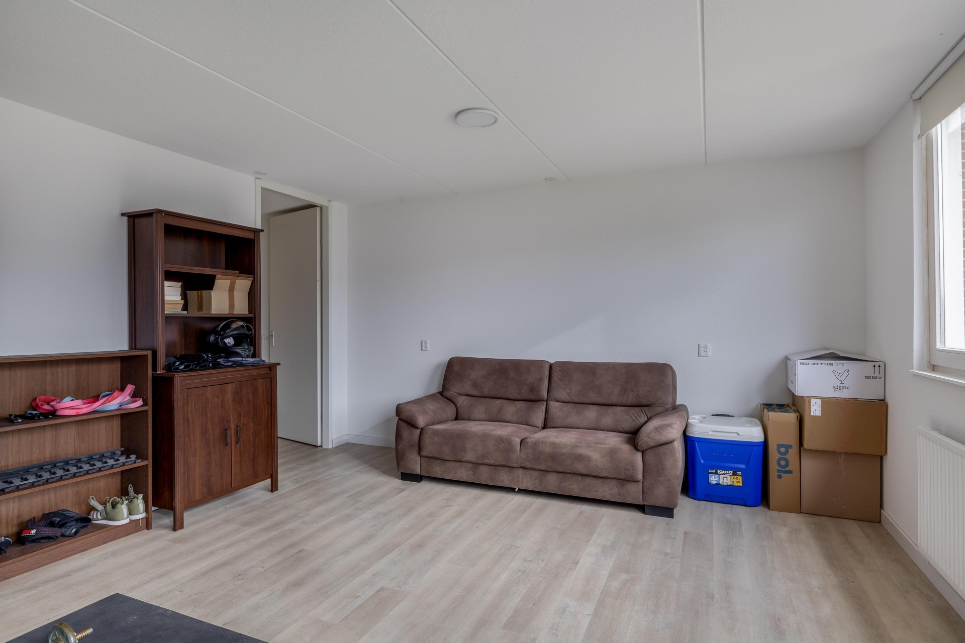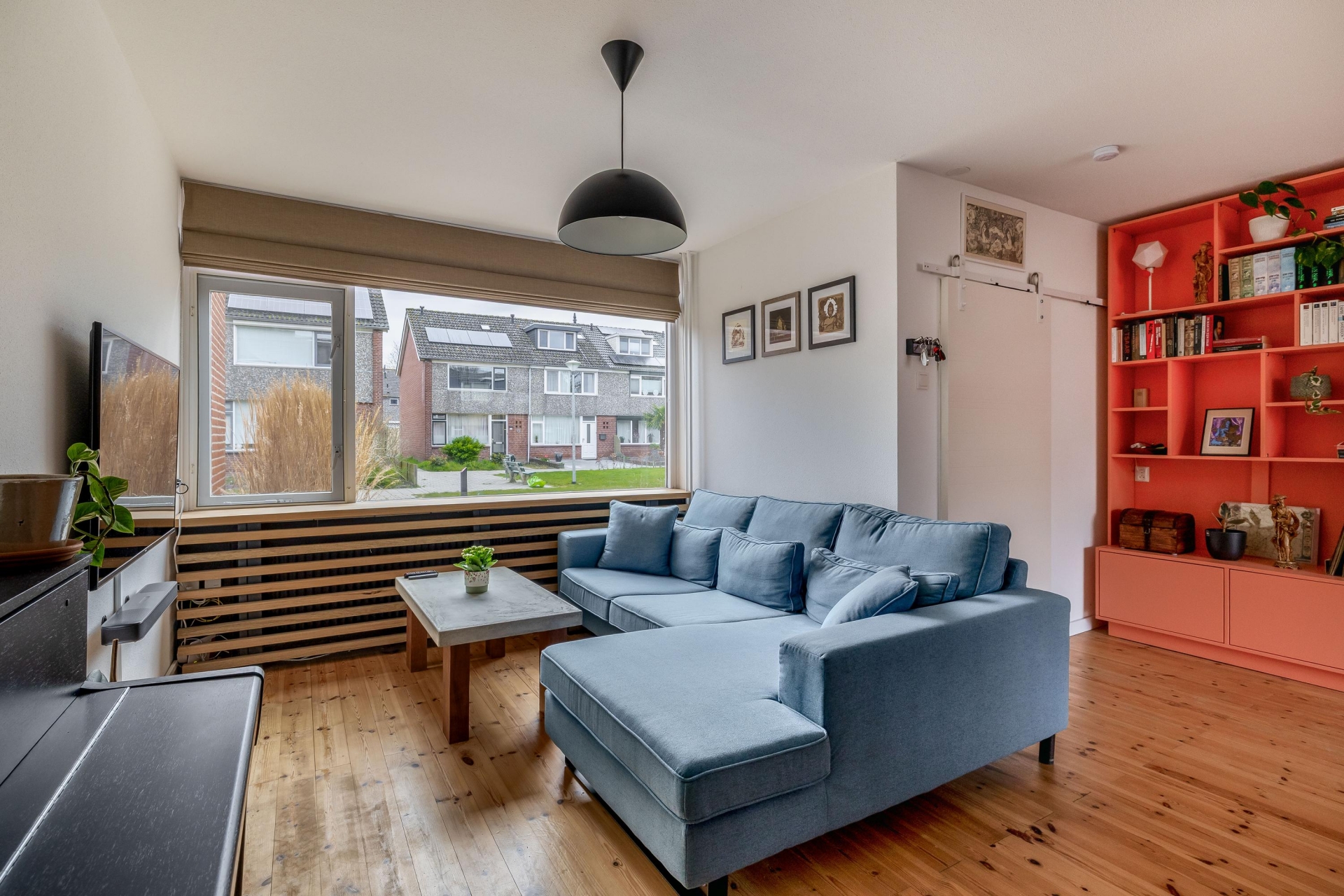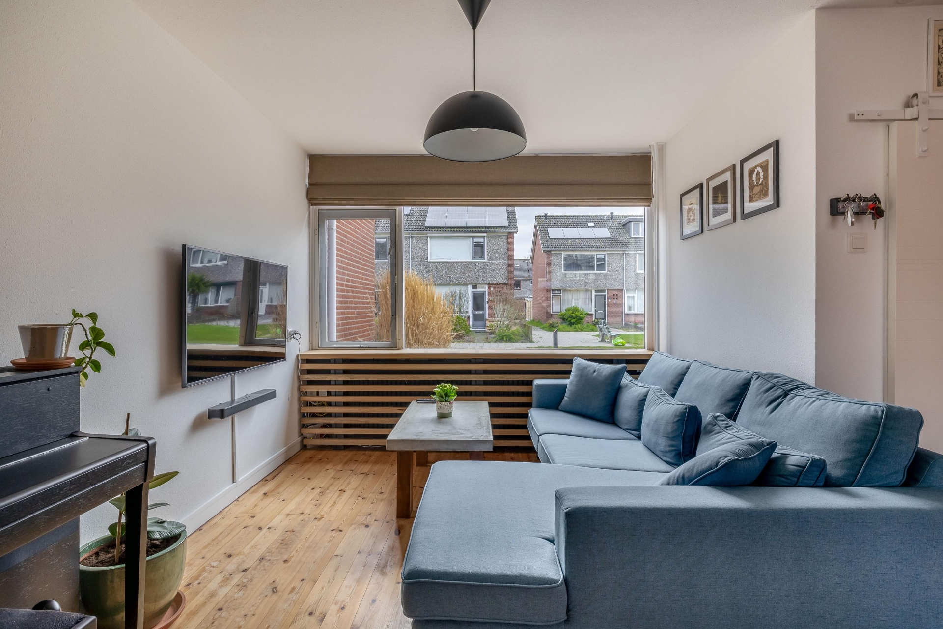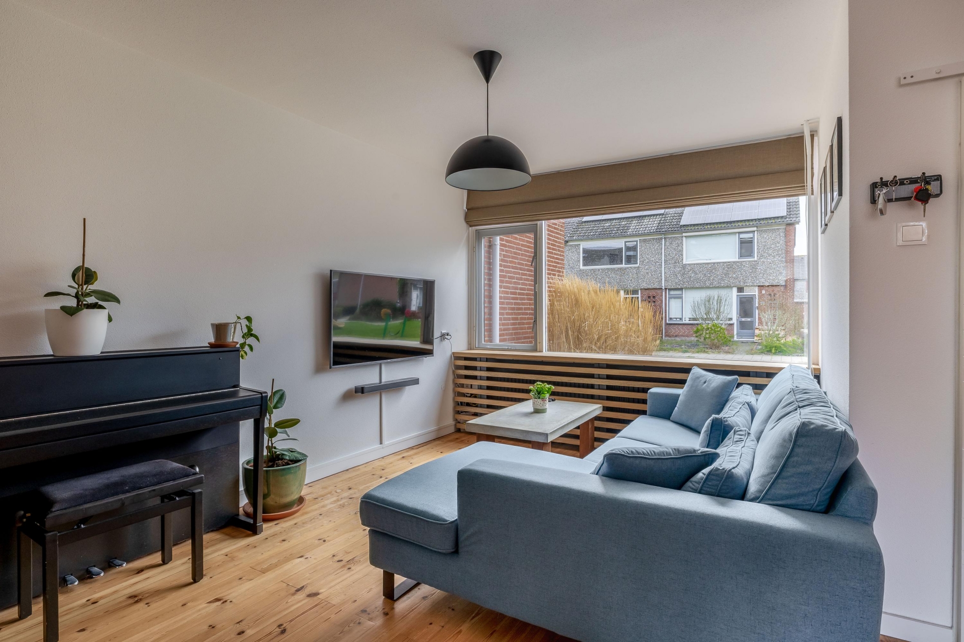 Bij binnenkomst valt direct op hoe licht en ruim dit huis aanvoelt. De doorzonwoonkamer profiteert van grote raampartijen aan zowel de voor- als achterzijde, waardoor het daglicht mooi naar binnen valt. De houten vloer geeft het geheel een warme uitstraling en zorgt voor een fijne basis.