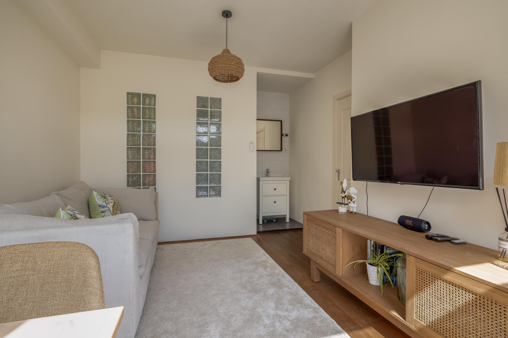 De woonkamer is een fijne plek waar je meteen ziet wat deze woning zo aantrekkelijk maakt. Door de grote raampartijen en de openslaande deuren naar de tuin valt het daglicht rijkelijk naar binnen. Het voormalige balkon is bij de woonkamer gevoegd, wat zorgt voor extra leefruimte en een prettig open gevoel. Hier heb je alle ruimte voor een gezellige zithoek én een eettafel.