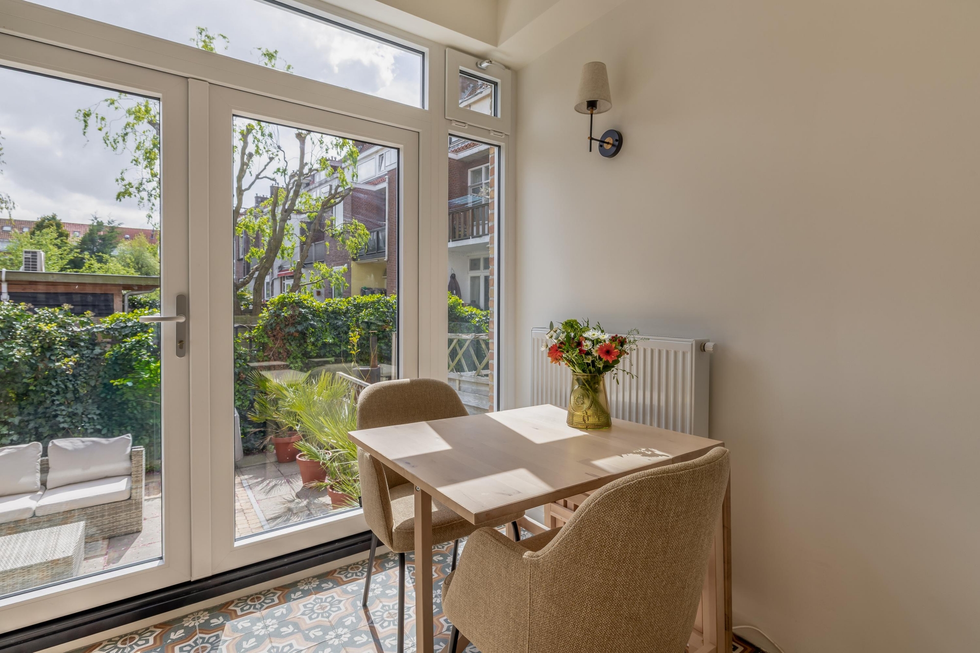 De verbinding met buiten is een groot pluspunt. Op zonnige dagen zet je de deuren open en loopt het binnen naadloos over in de tuin. Dat maakt dit huis ideaal voor starters die graag binnen én buiten willen genieten.