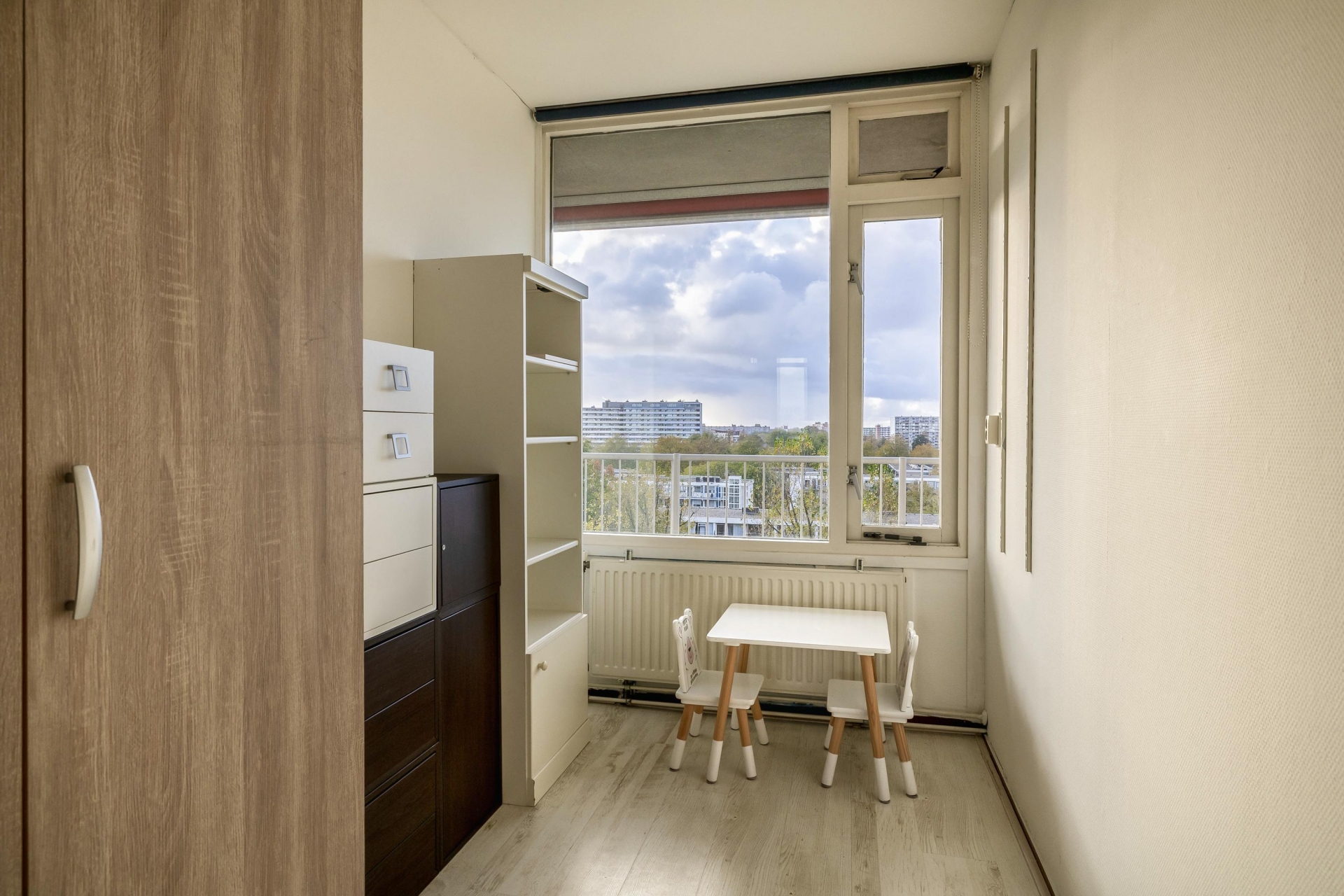 Zodra je de woonkamer binnenstapt, valt de lichtinval meteen op. Grote ramen en de ligging op de 8e etage zorgen voor een open gevoel, waarbij je aan de ene kant de rust van de hoogte ervaart en aan de andere kant het levendige uitzicht over Schiedam hebt. Het balkon ligt gunstig ten opzichte van de zon en is ruim genoeg voor een gezellig zitje met tafel. Hier geniet je van je koffie in de ochtend of juist van de laatste zonnestralen aan het eind van de dag.