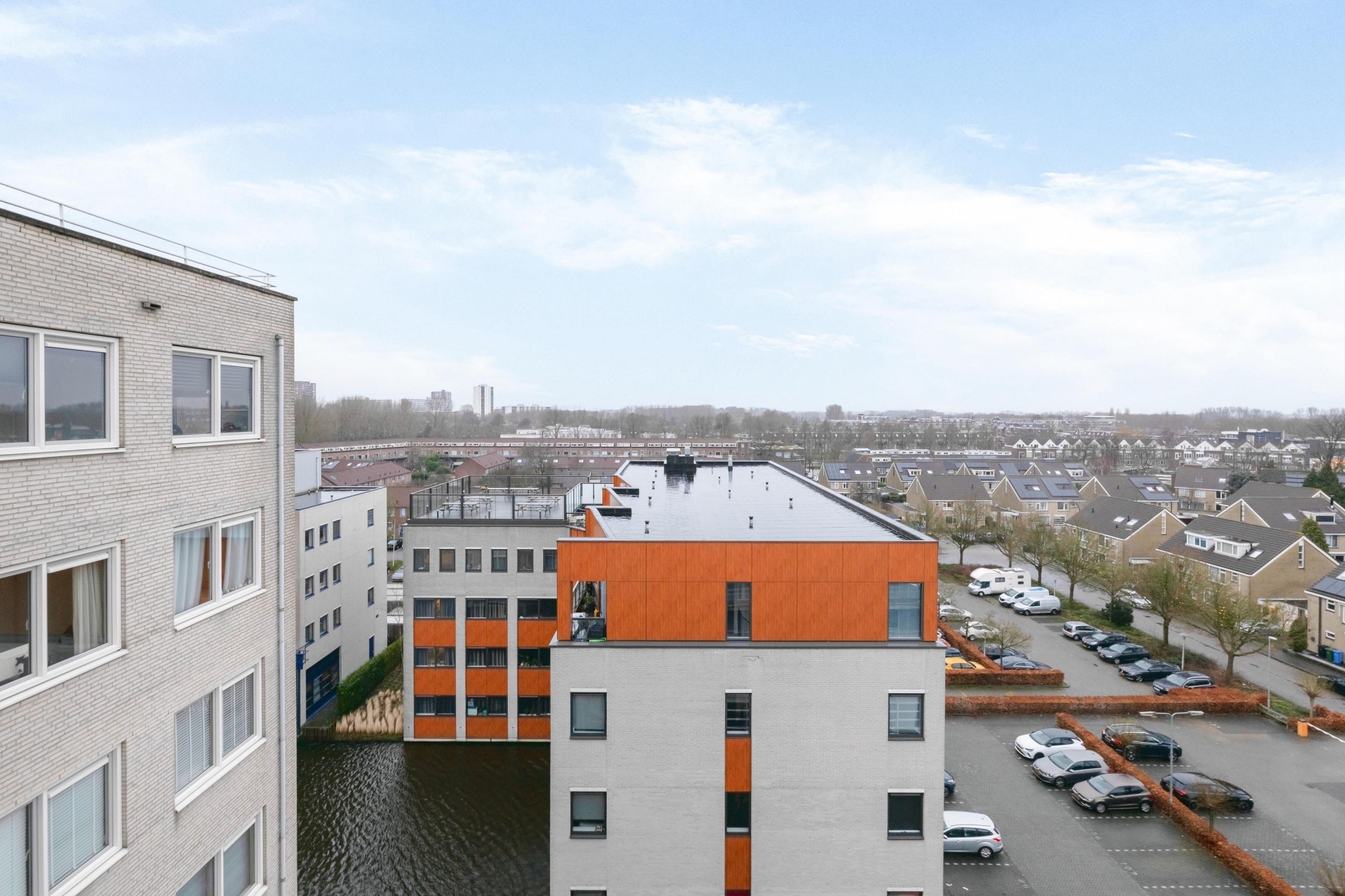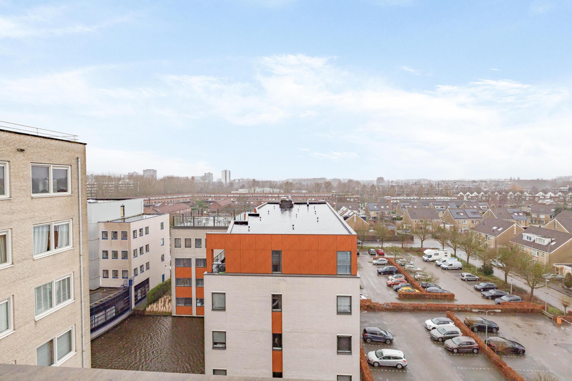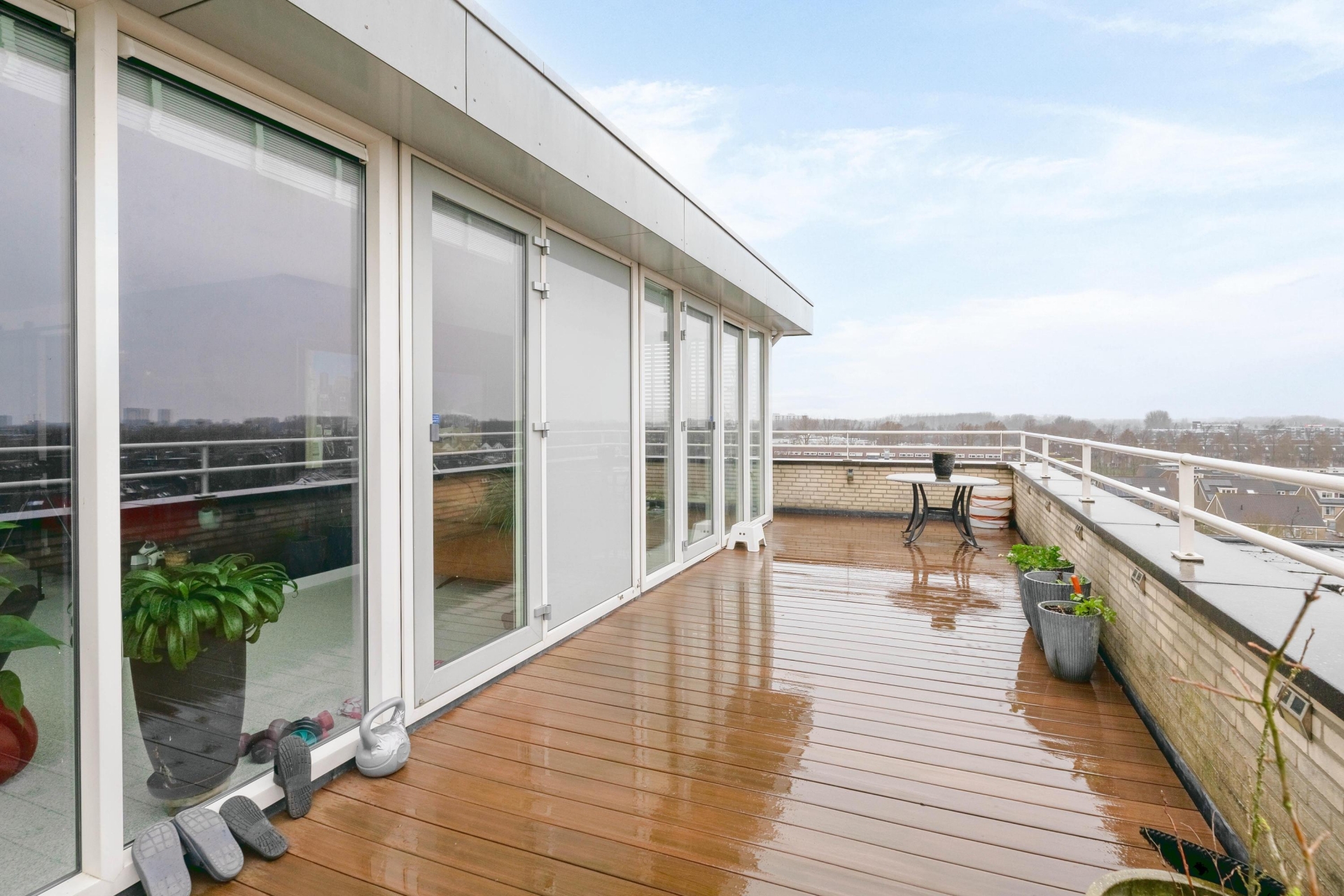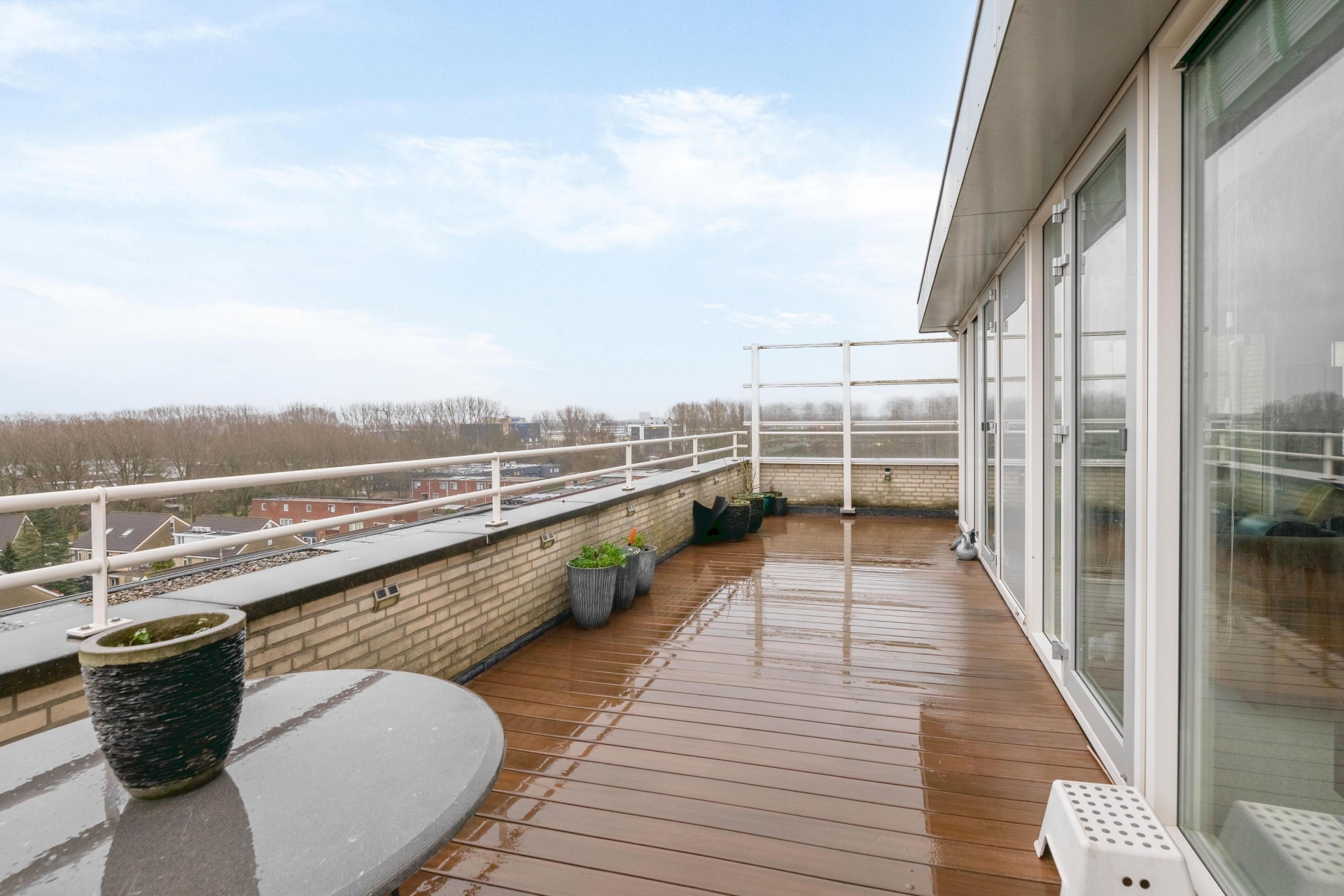 Het terras maakt het plaatje compleet. Gegarandeerd dat je hier gaat genieten van het geweldige panoramische uitzicht vanaf de 7e verdieping. Het terras heeft een oppervlakte van 38 m². Hierdoor biedt het tal van mogelijkheden om in de zon of schaduw te zitten. Het hele terras beschikt over houten vlonderplanken en verder is er ook nog een buitenkraan aanwezig. Het complex heeft verder een rustige locatie in de kindvriendelijke woonwijk Zevenkamp. Het is gelegen aan een waterpartij en biedt voldoende privacy.