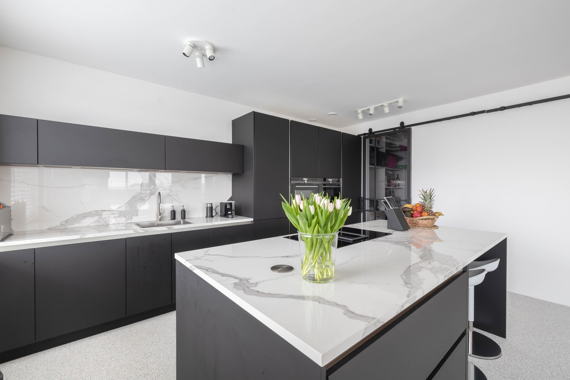 Aangekomen bij het appartement is het lichtinval en het uitzicht vanuit de woonkamer en woonkeuken een ware eyecatcher. De mat zwarte keuken met kookeiland is voorzien van alle benodigde inbouwapparatuur en beschikt over een sfeervol barretje. Vanuit de keuken is er nog een handige bijkeuken toegankelijk, waar zich ook de aansluiting voor de wasmachine bevindt. Vanuit de hal is er toegang tot de overige vertrekken, zoals 2 slaapkamers, een luxe badkamer en separaat het toilet. Beide slaapkamers beschikken over een vaste kastenwand die tal van ruimte biedt. De inpandige badkamer is voorzien van een inloopdouche, een dubbele wastafel met meubel en een spiegel met verlichting.