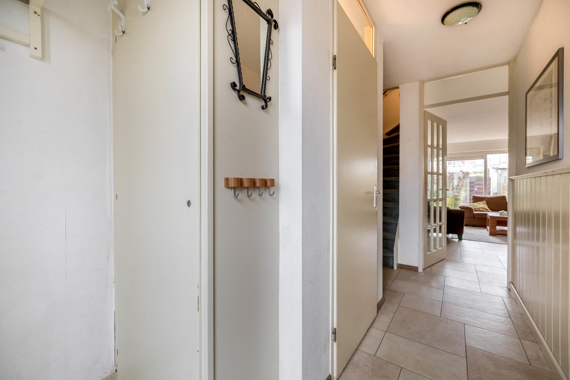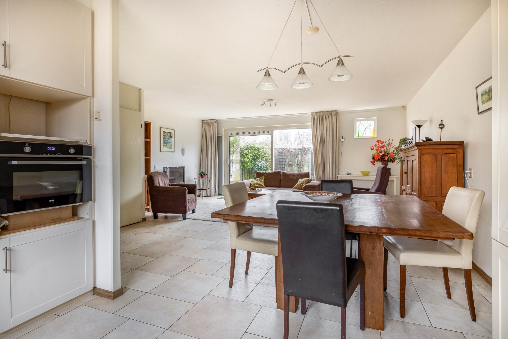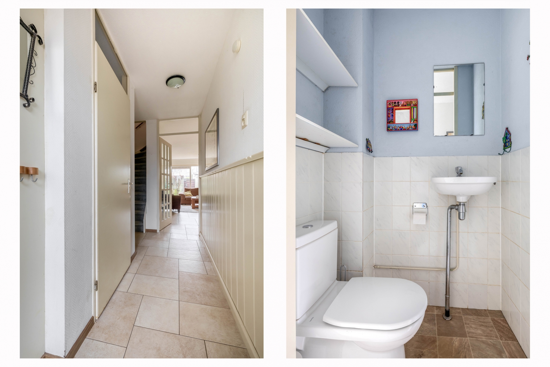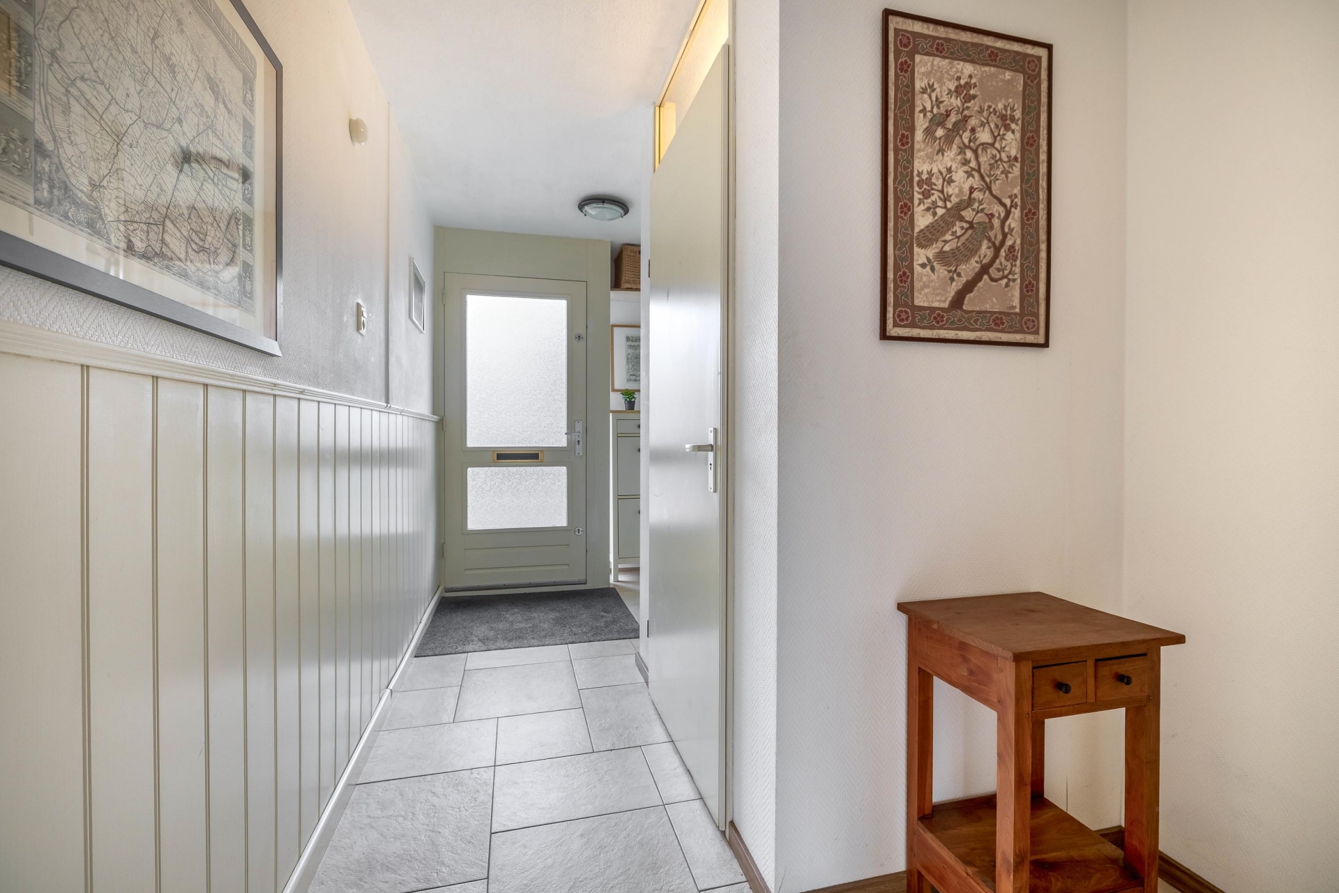 Entree van de woning met ruime hal, meterkast en toilet met fonteintje. De lichte woonkamer is voorzien van een open keuken aan de voorzijde, uitgerust met diverse inbouwapparatuur, waaronder een koelkast, vriezer, Combi-magnetron, vaatwasser en 5-pits kookplaat.