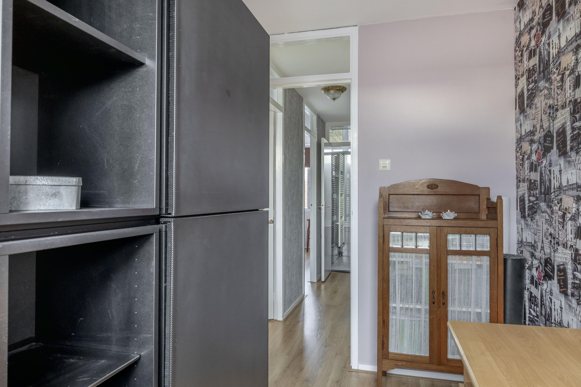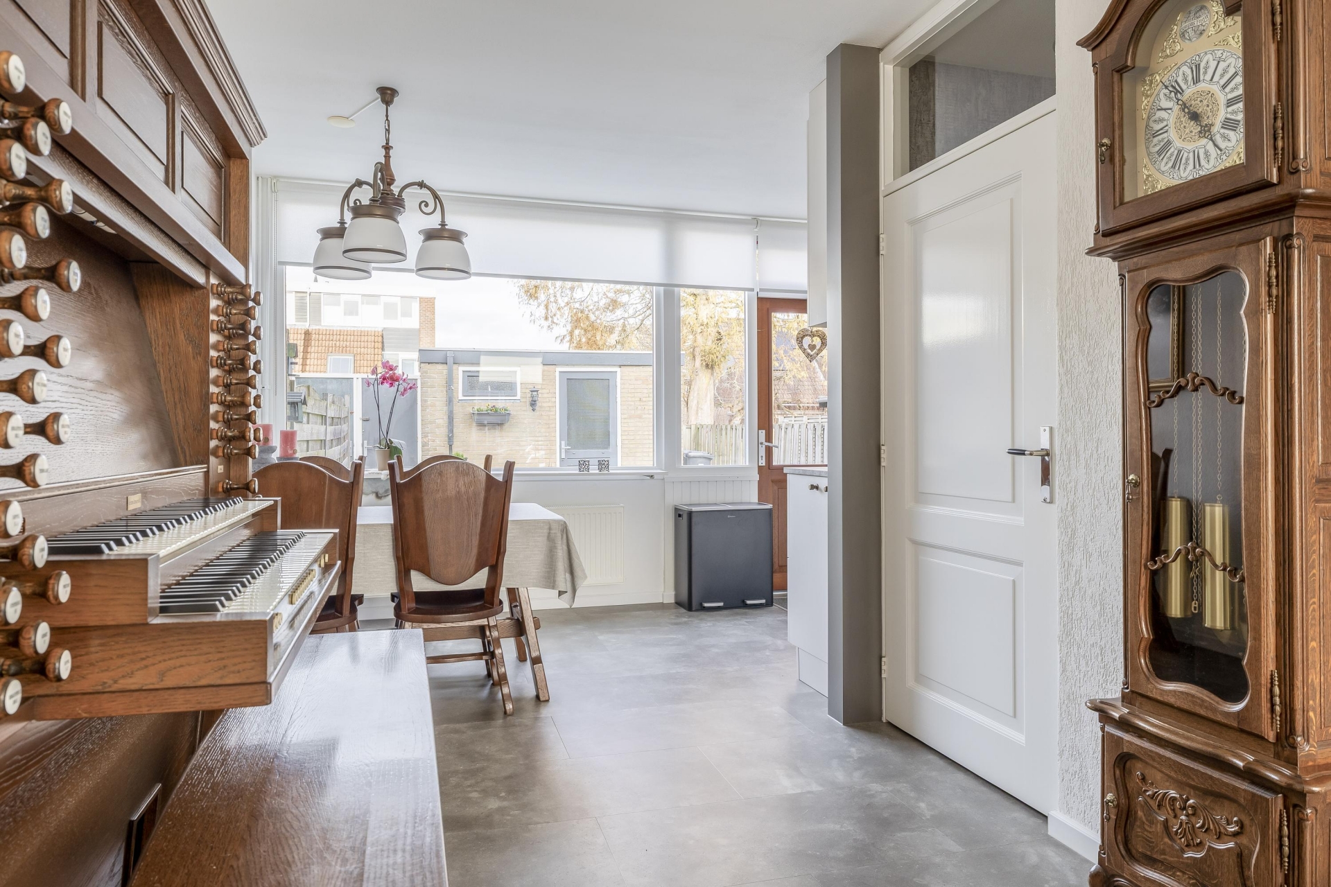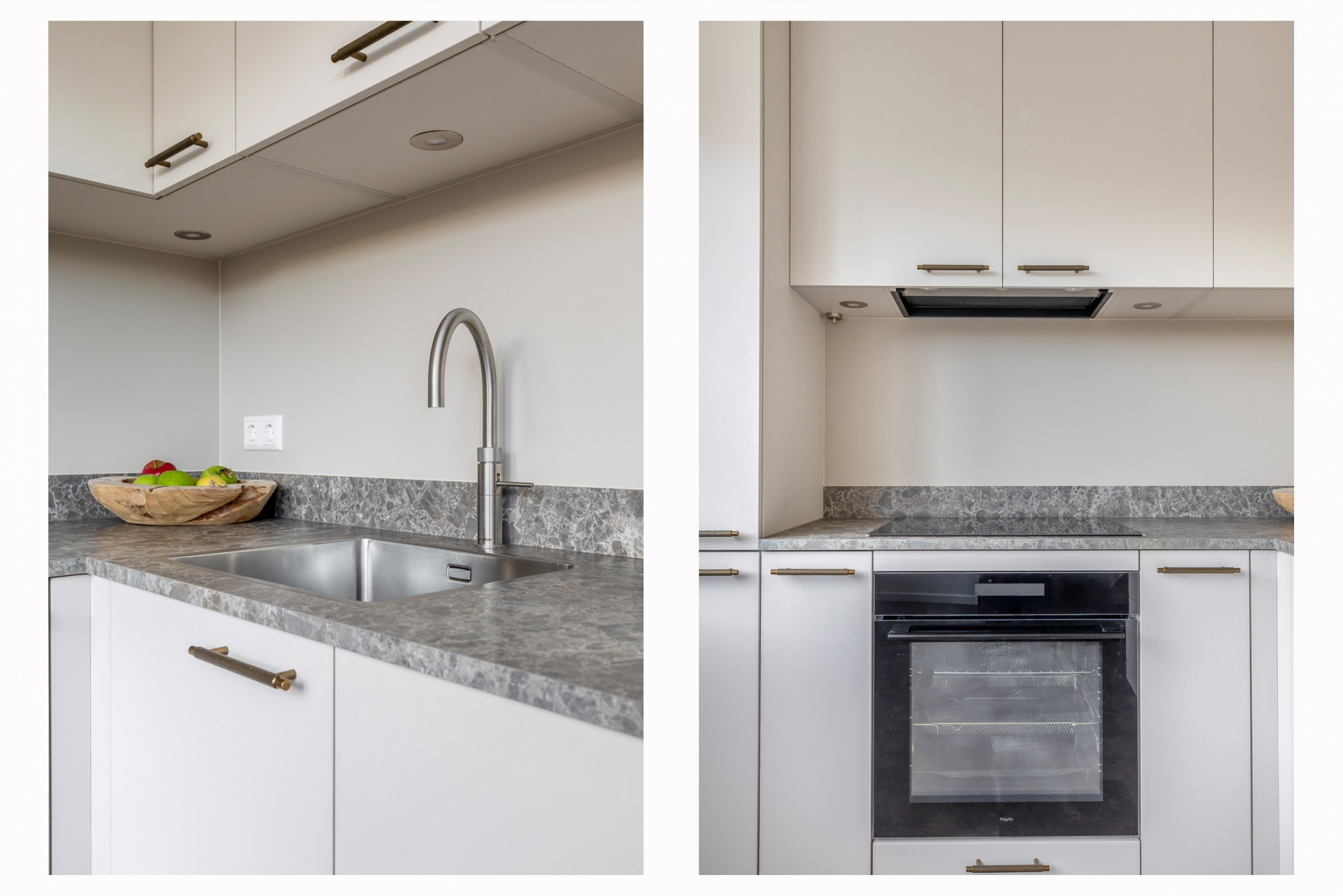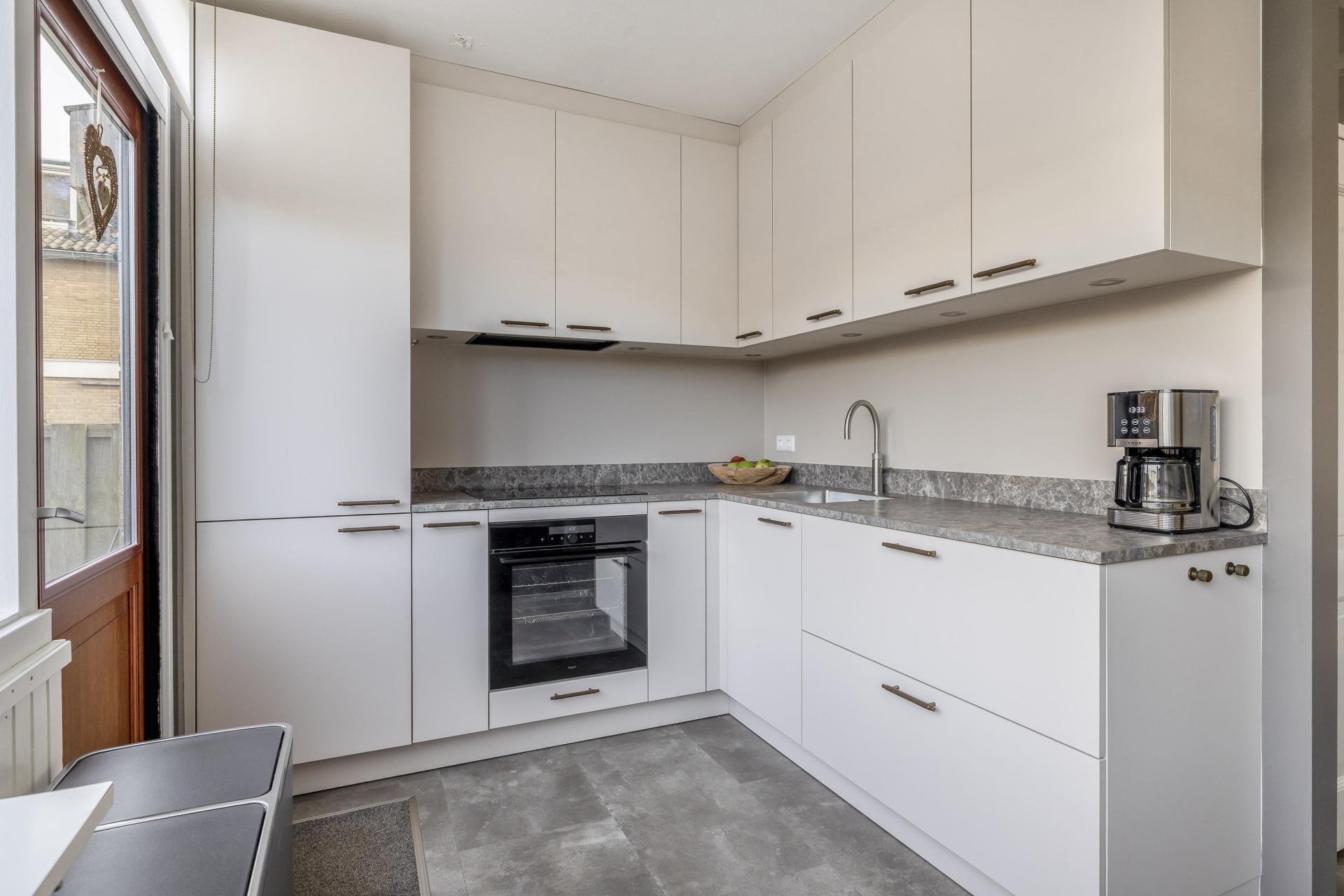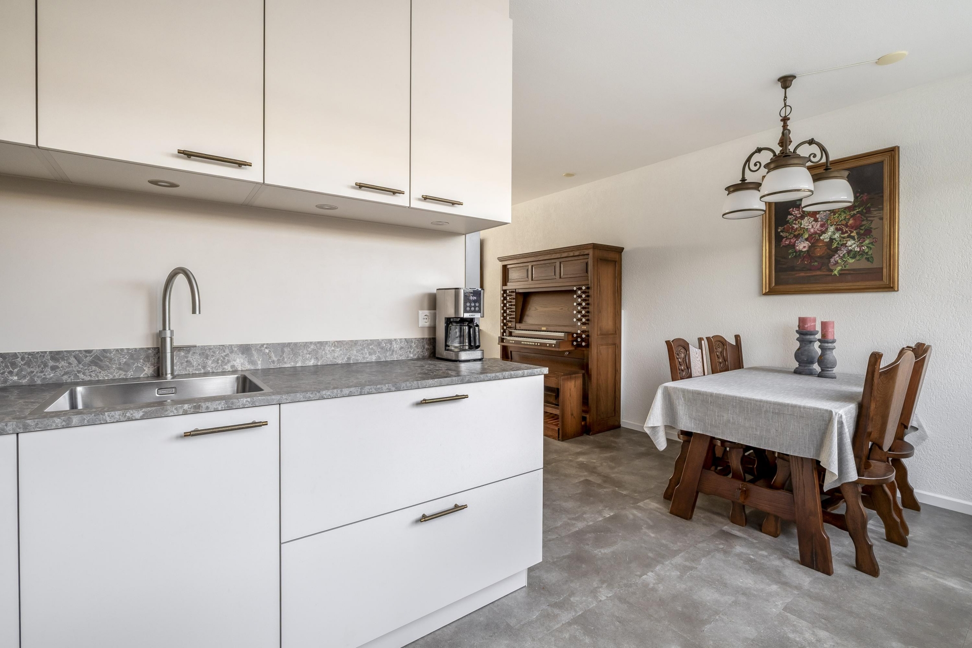 De keuken ligt aan de achterzijde van het huis en is netjes uitgevoerd in een lichte kleurstelling. Dankzij de grote ramen heb je ook hier veel daglicht, en je kijkt mooi uit op de tuin tijdens het koken. Er is voldoende werk- en opbergruimte aanwezig en je hebt direct toegang tot de tuin via de achterdeur – ideaal tijdens het barbecueën of voor een kop koffie in de ochtendzon.