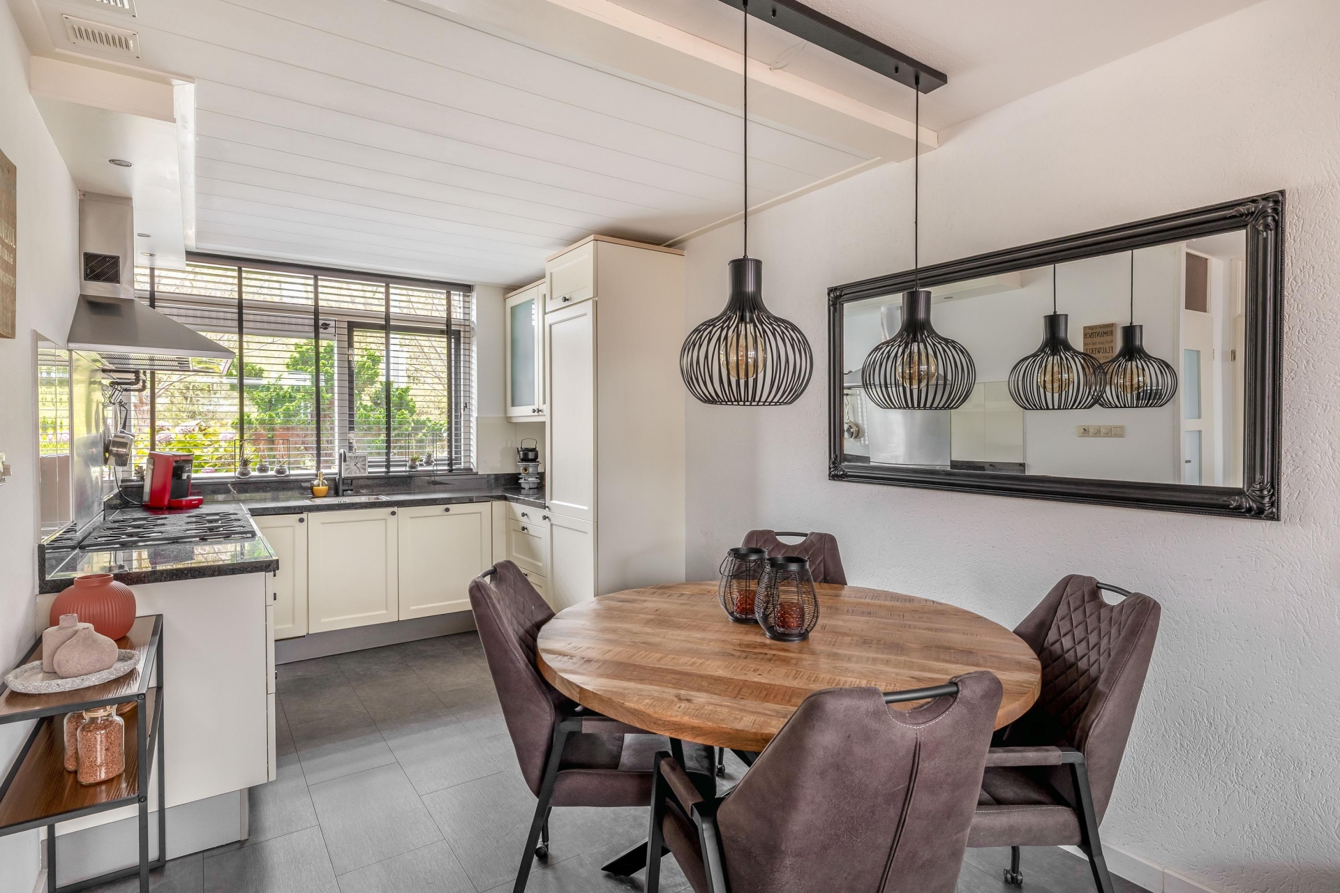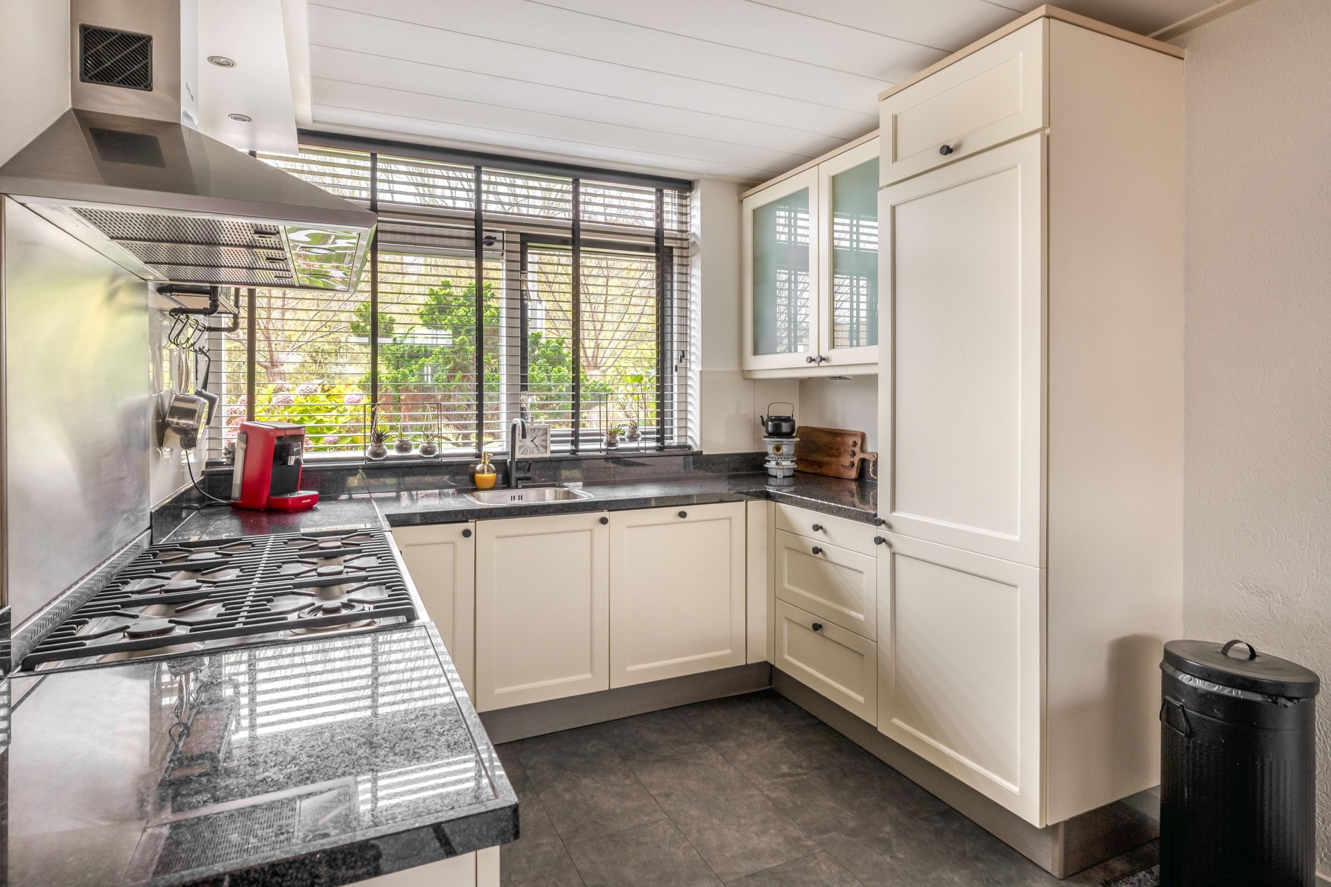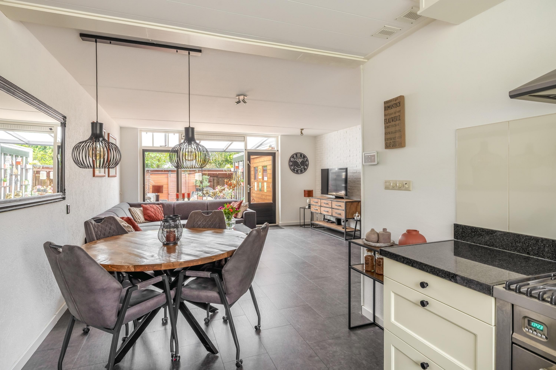 Binnen tref je een lichte en ruime doorzonwoonkamer met directe toegang tot de tuin. De open verbinding met de keuken zorgt voor een fijne leefruimte waar je zowel kunt koken als ontspannen met zicht op buiten. De klassieke U-keuken is functioneel en goed onderhouden: de perfecte plek om in te koken, met voldoende werkruimte en lichtinval.