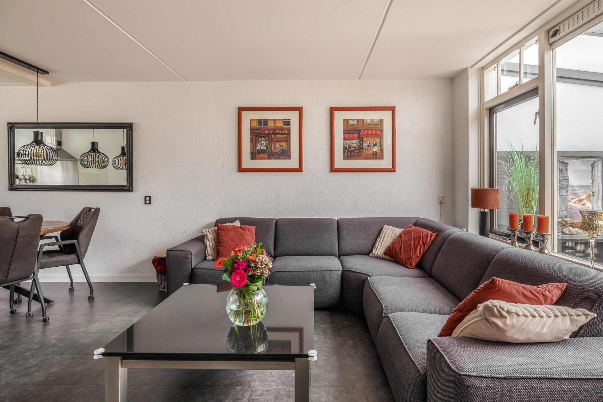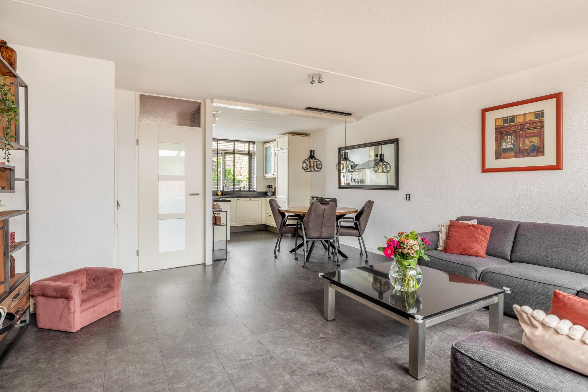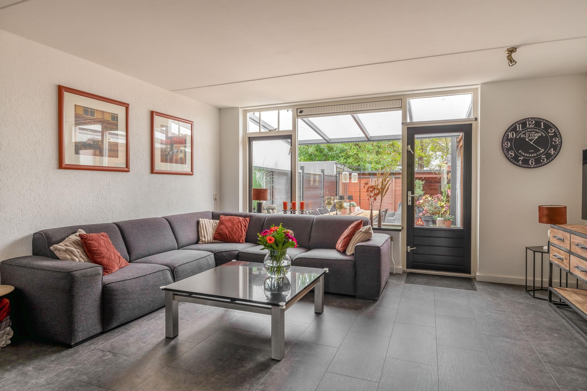 Binnen tref je een lichte en ruime doorzonwoonkamer met directe toegang tot de tuin. De open verbinding met de keuken zorgt voor een fijne leefruimte waar je zowel kunt koken als ontspannen met zicht op buiten. De klassieke U-keuken is functioneel en goed onderhouden: de perfecte plek om in te koken, met voldoende werkruimte en lichtinval.