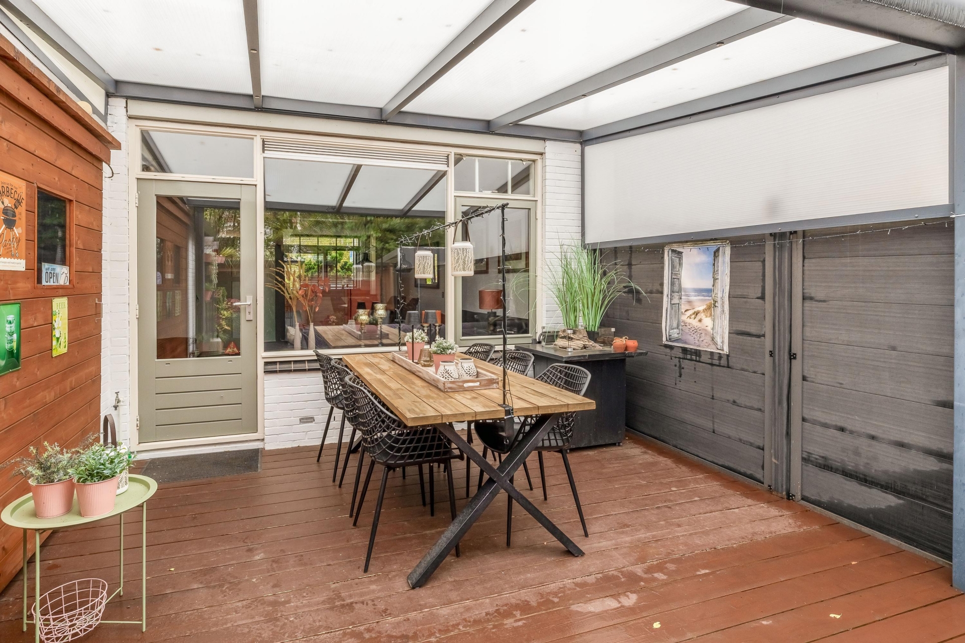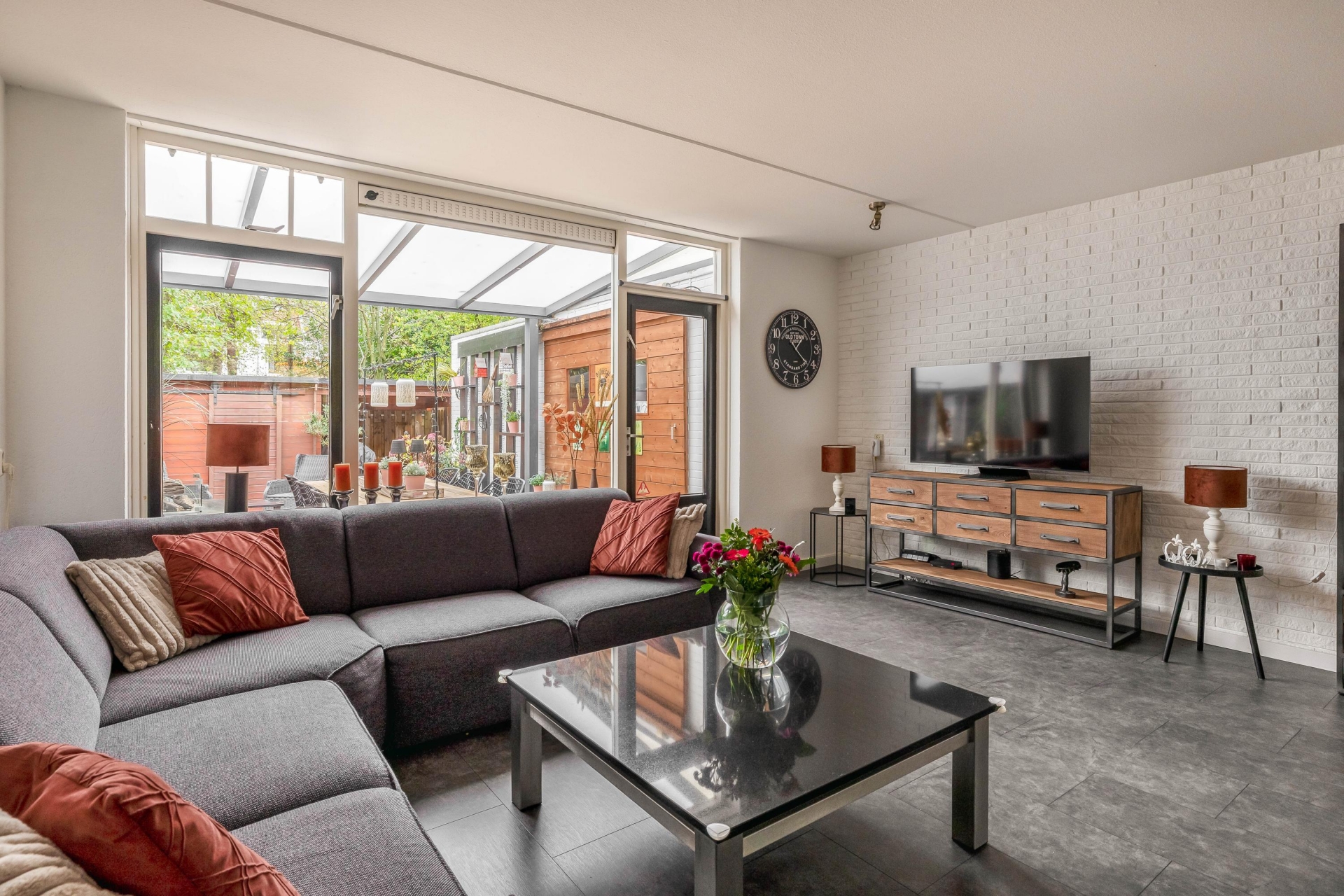 De achtertuin is ruim 12 meter diep, gelegen op het zuidoosten en keurig aangelegd. De huidige bewoners hebben een mooie serre aangebracht met onderheide vlonder met houten planken, zodat je ook met minder weer lekker buiten kunt zitten. Deze overkapping loopt direct door vanuit de woonkamer en vormt daarmee een mooie overgang tussen binnen en buiten. De aangebouwde berging is omgebouwd tot bar, zodat je in de serre altijd gezellig een feestje kunt vieren! Aan de achterzijde van de tuin bevindt zich nog een berging en overkapping om scooter of fiets droog weg te kunnen zetten. Dankzij de ligging profiteer je van veel zonlicht, vanaf de ochtend tot ver in de middag.