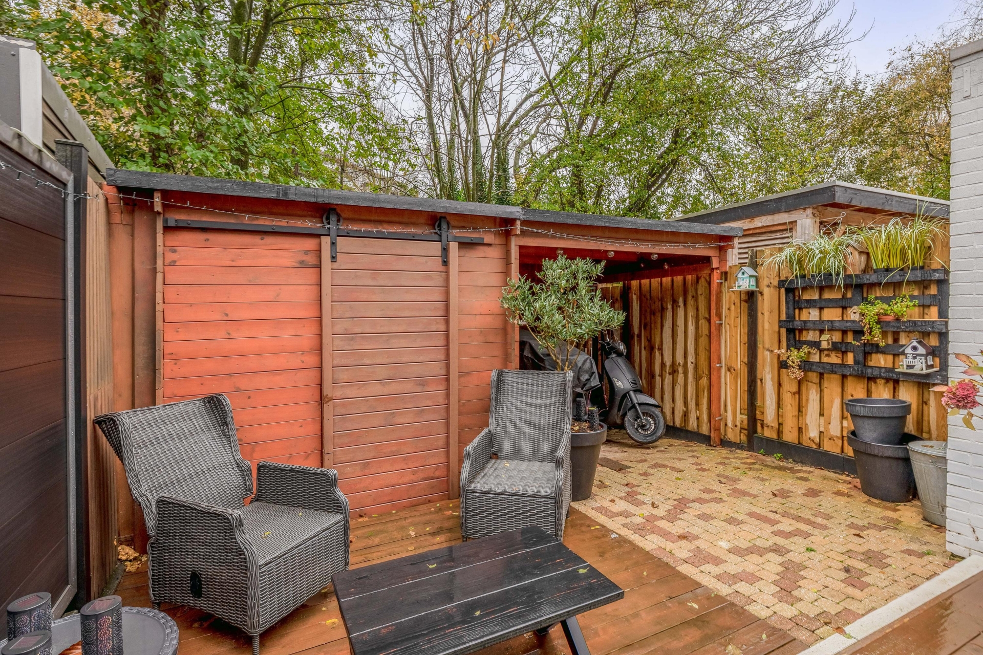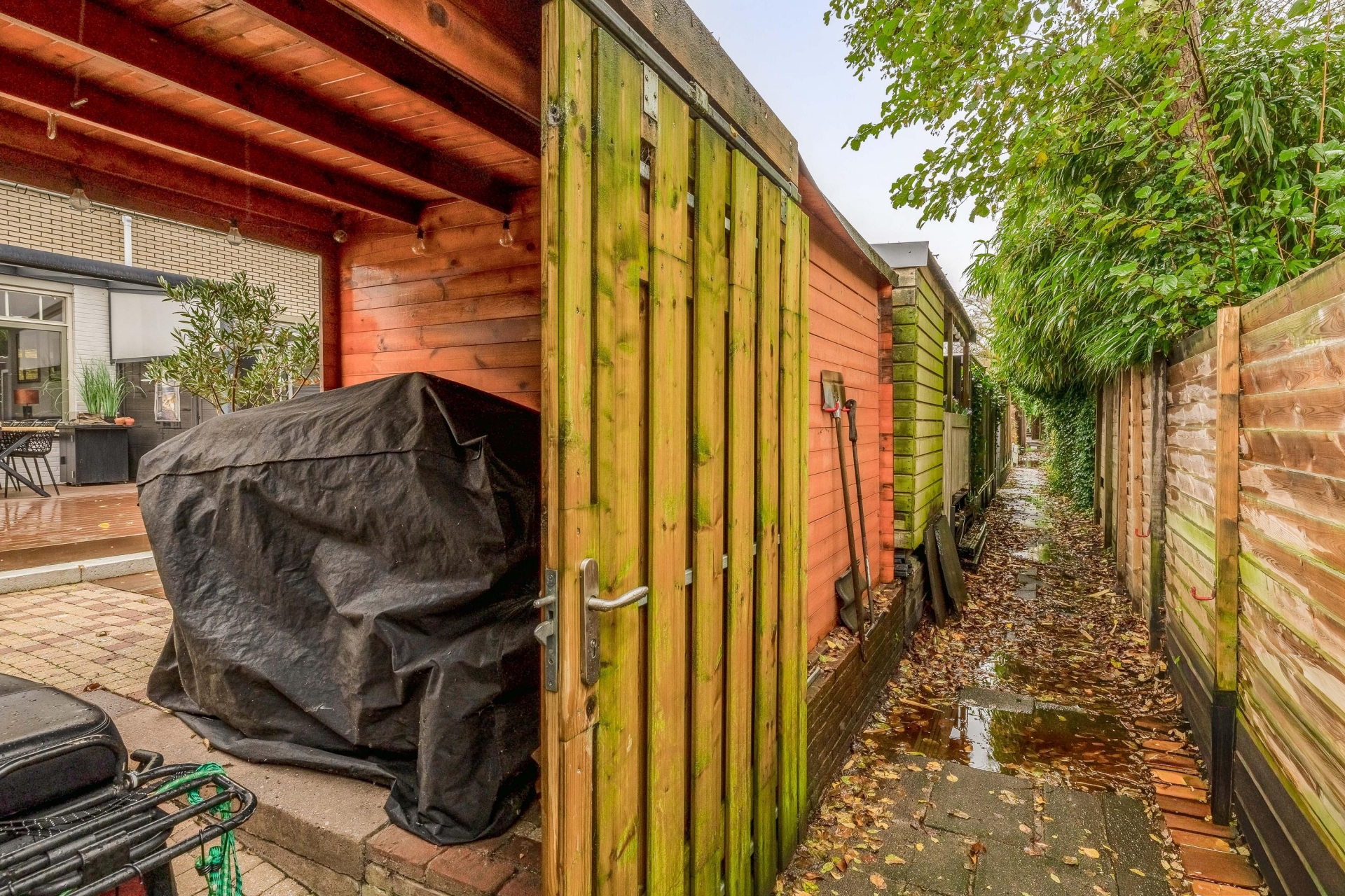 - Houten berging achterin de tuin met overkapping voor scooter/fietsen. Achterom aanwezig