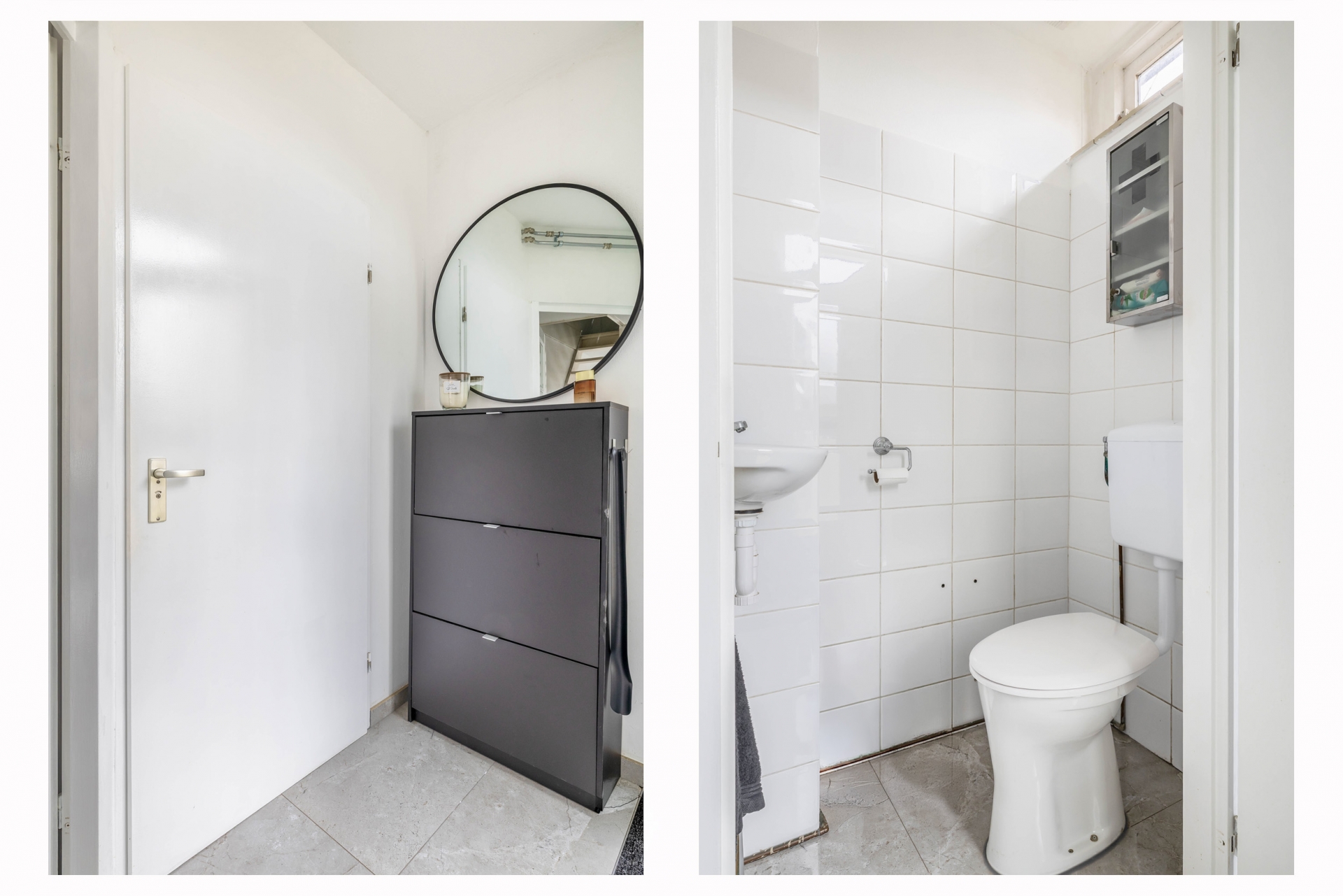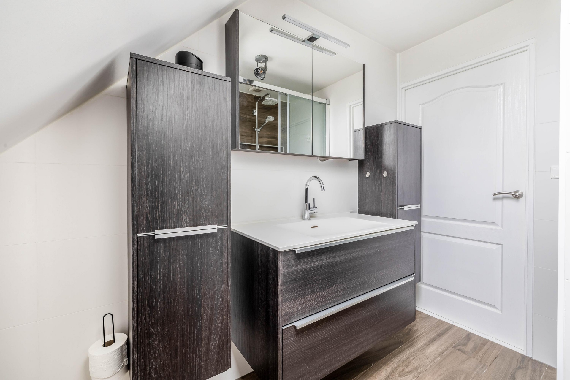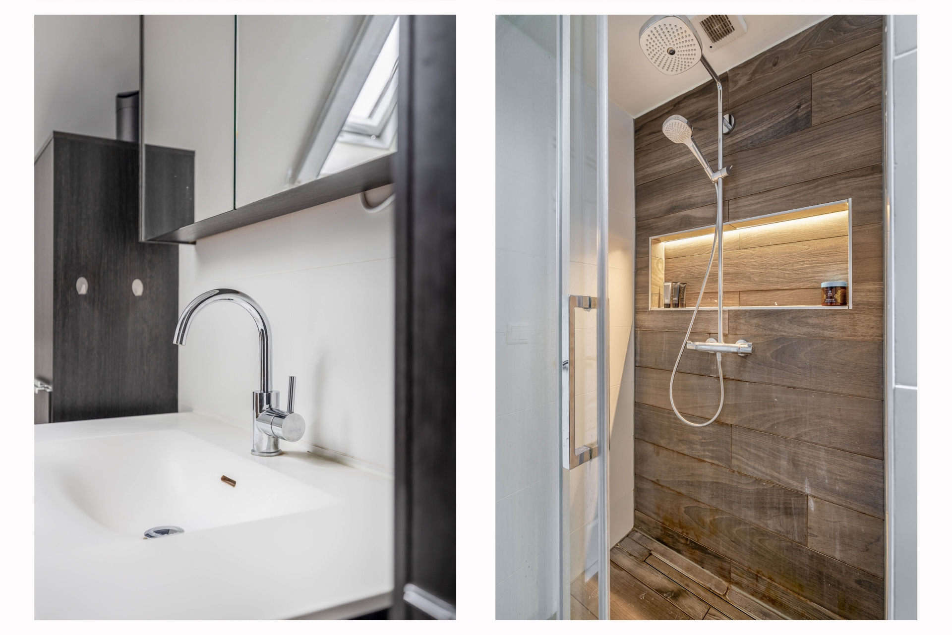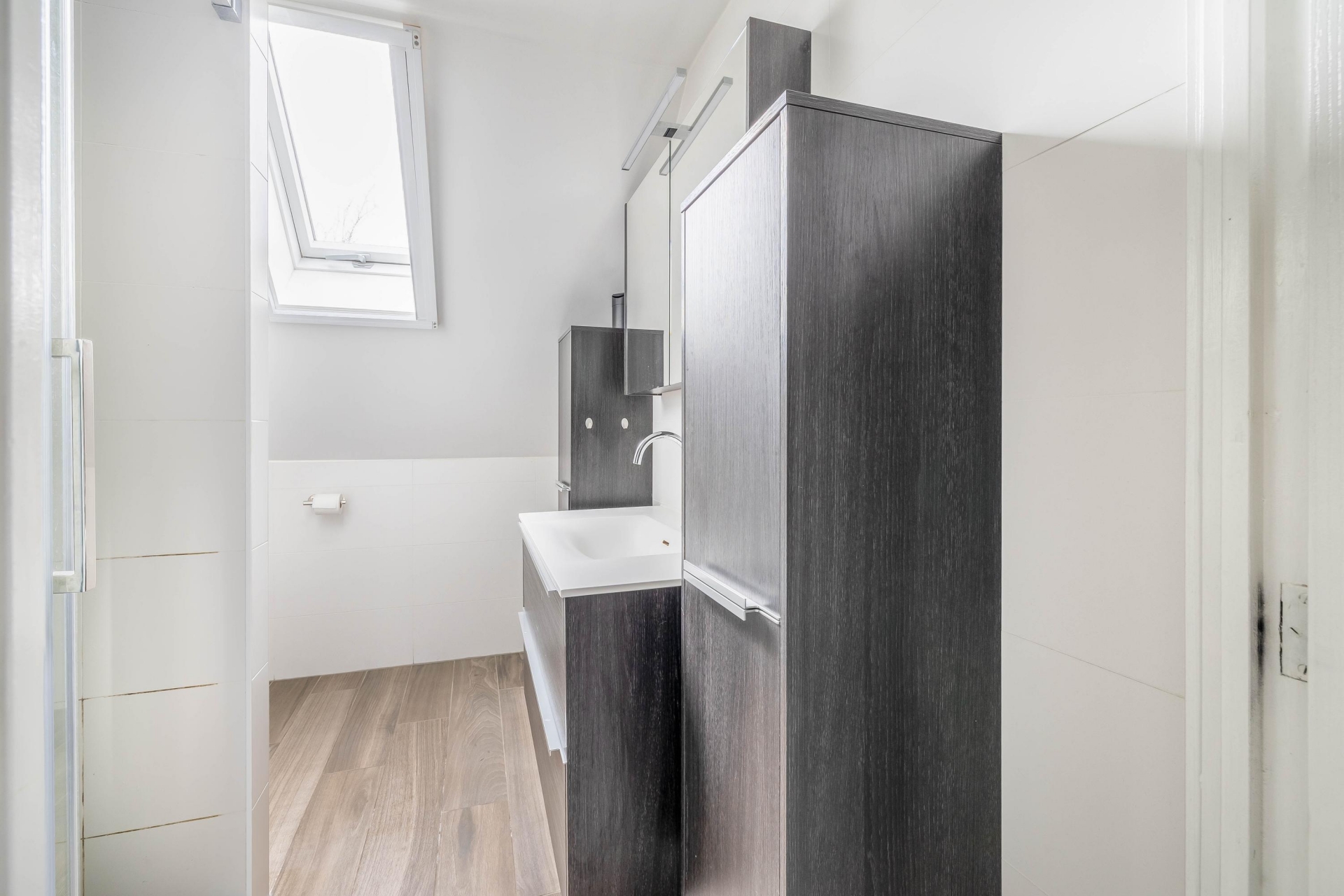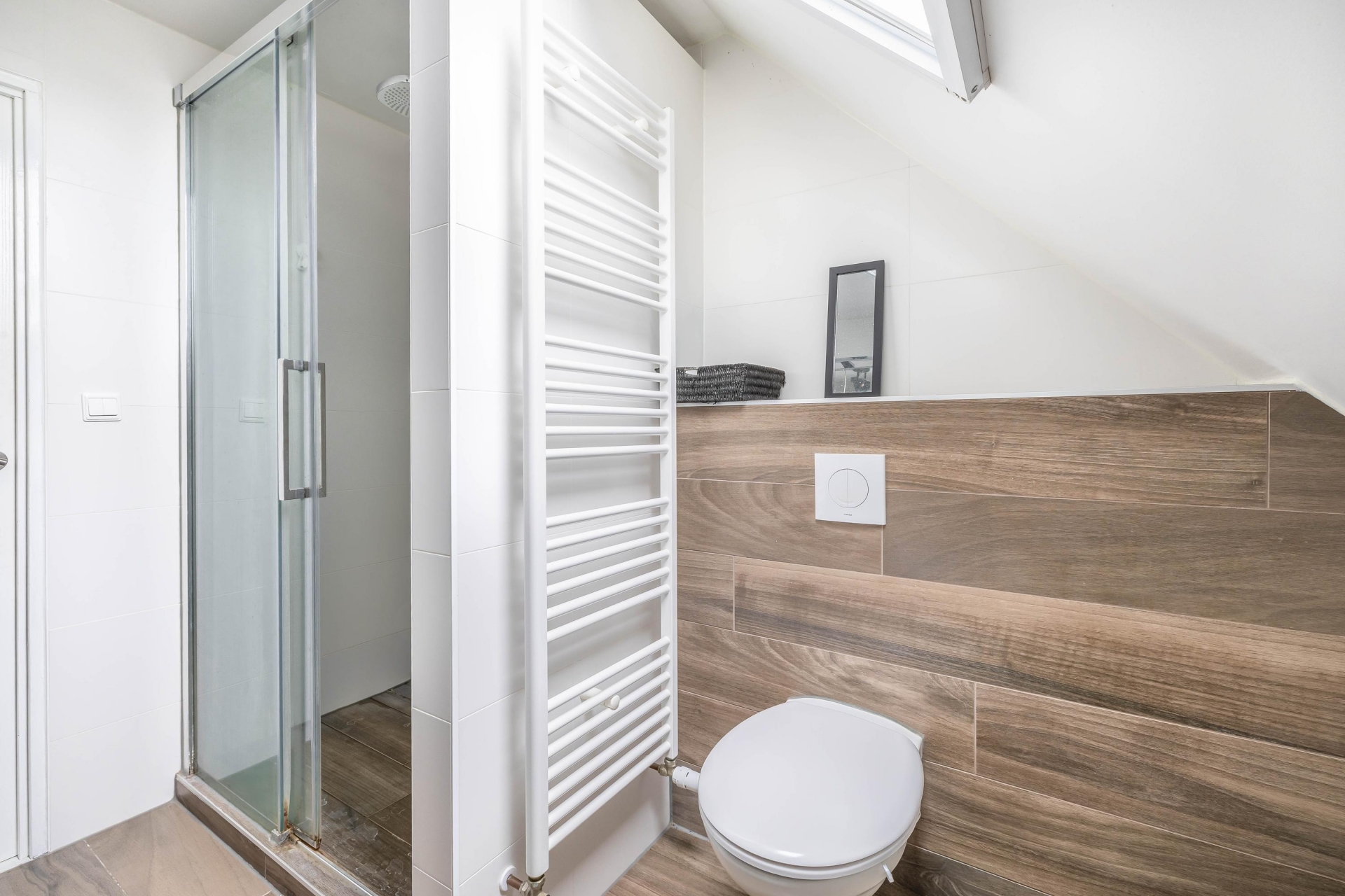 De badkamer is in 2020 vernieuwd en strak afgewerkt. De combinatie van lichte tegels met houtaccenten geeft een warme uitstraling. Je beschikt hier over een inloopdouche, wastafelmeubel en een toilet. Ook hier geldt: netjes afgewerkt en direct te gebruiken.