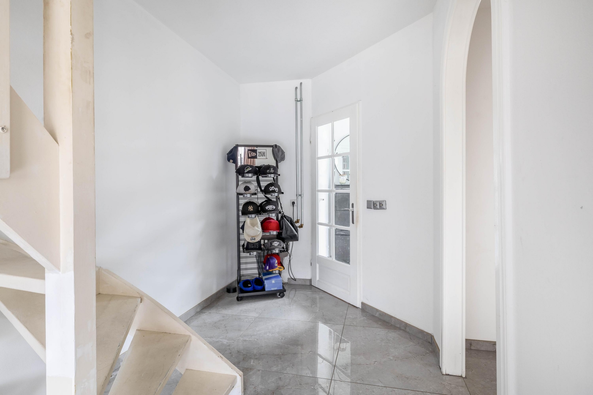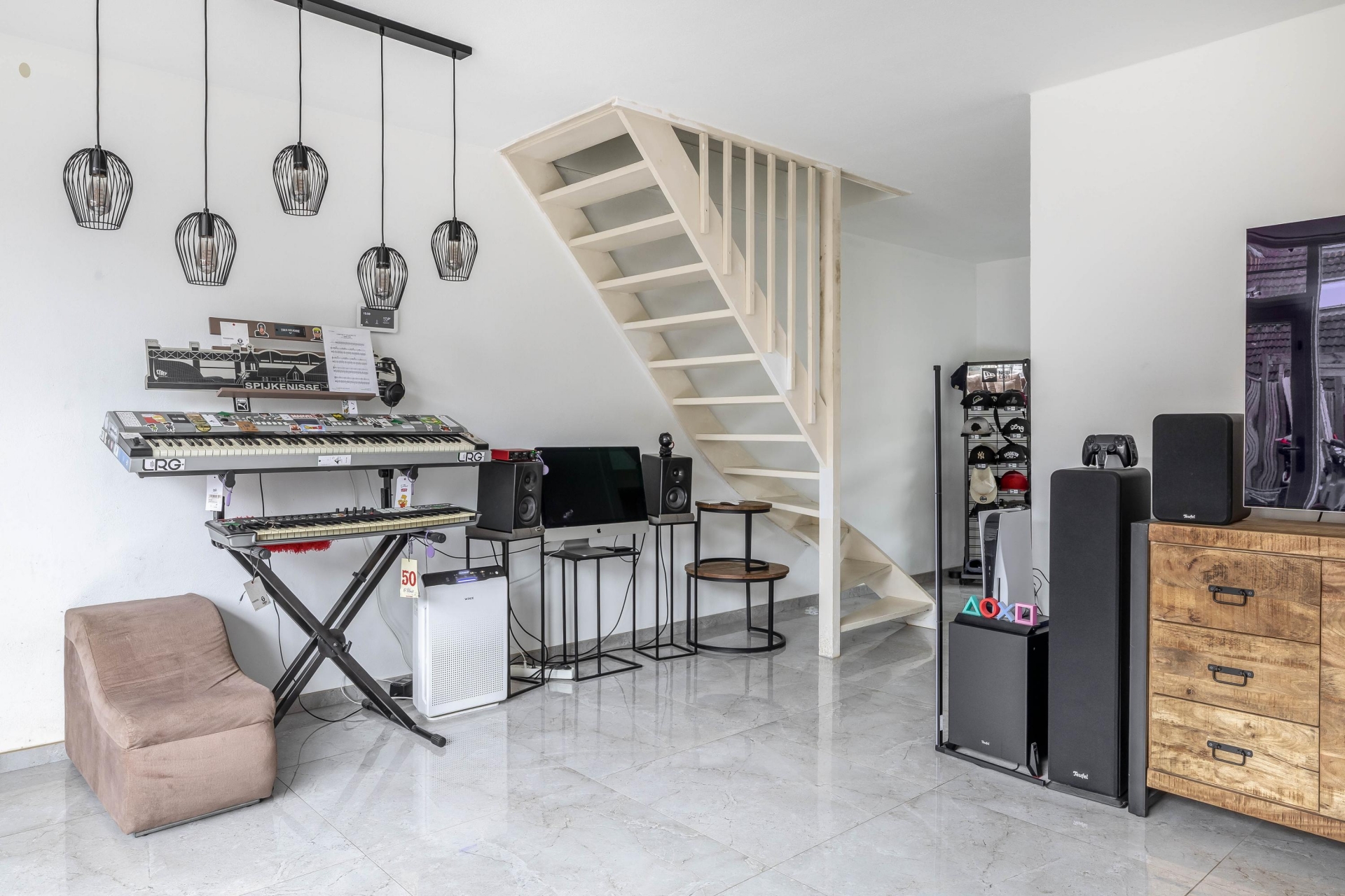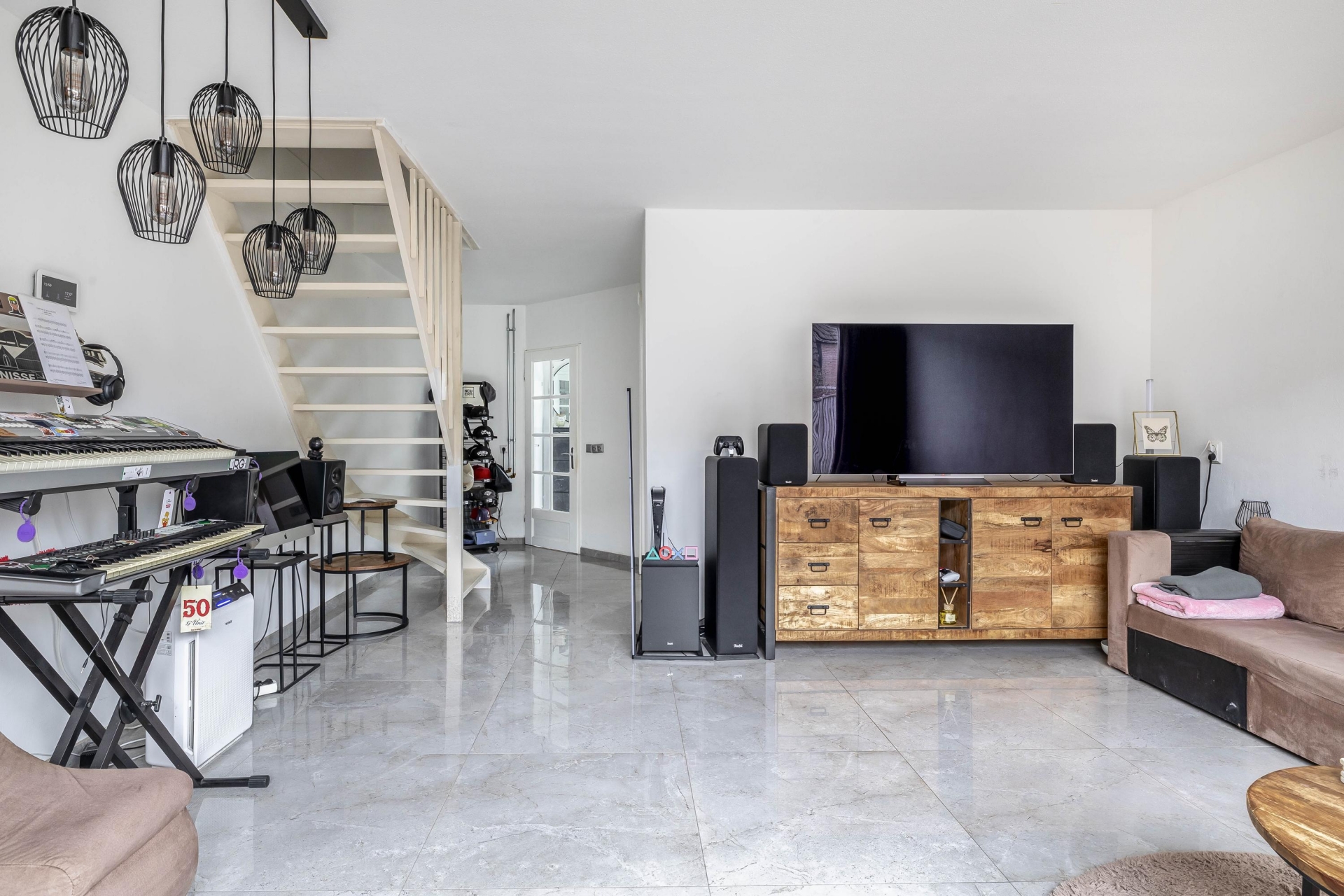 Via de hal met toilet kom je binnen in de woonkamer. Wat direct opvalt is de strakke plavuizenvloer die in 2022 is gelegd, gecombineerd met vloerverwarming. Dat zorgt niet alleen voor een moderne uitstraling, maar ook voor aangenaam wooncomfort in elk seizoen.