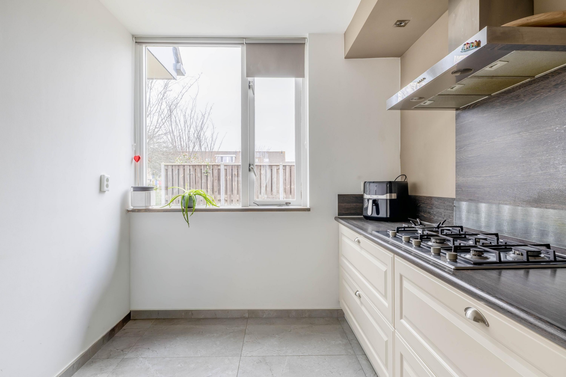 De keuken aan de voorzijde is in 2019 vernieuwd en uitgevoerd in een moderne, lichte kleurstelling. De opstelling is praktisch ingericht met diverse inbouwapparatuur en voldoende werkruimte. Een fijne plek waar je dagelijks comfortabel kunt koken.