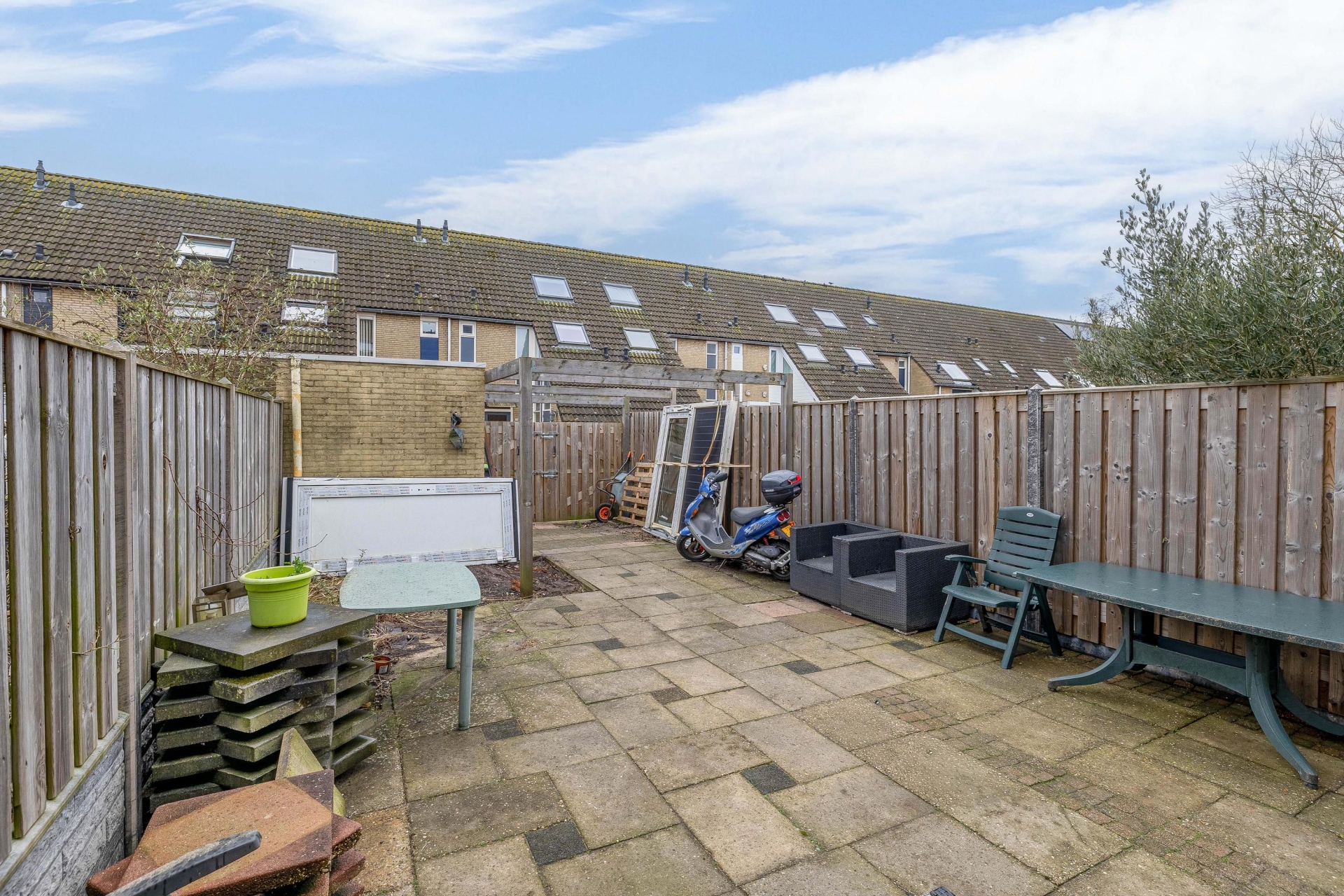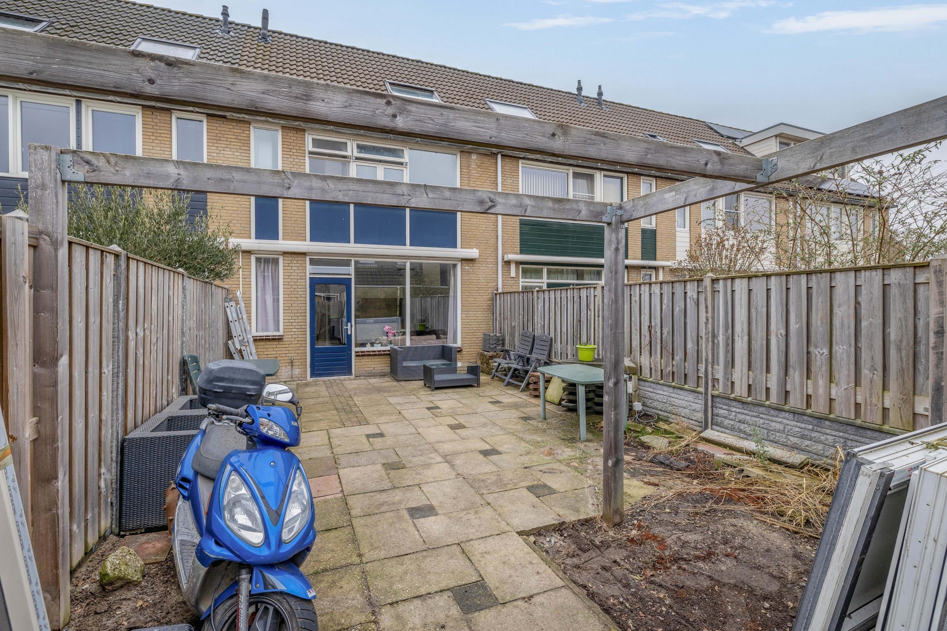 De tuin is overzichtelijk aangelegd en beschikt over een vrijstaande stenen berging met elektra. Ideaal voor fietsen en opslag. Daarnaast is er een achterom aanwezig, wat altijd praktisch is.