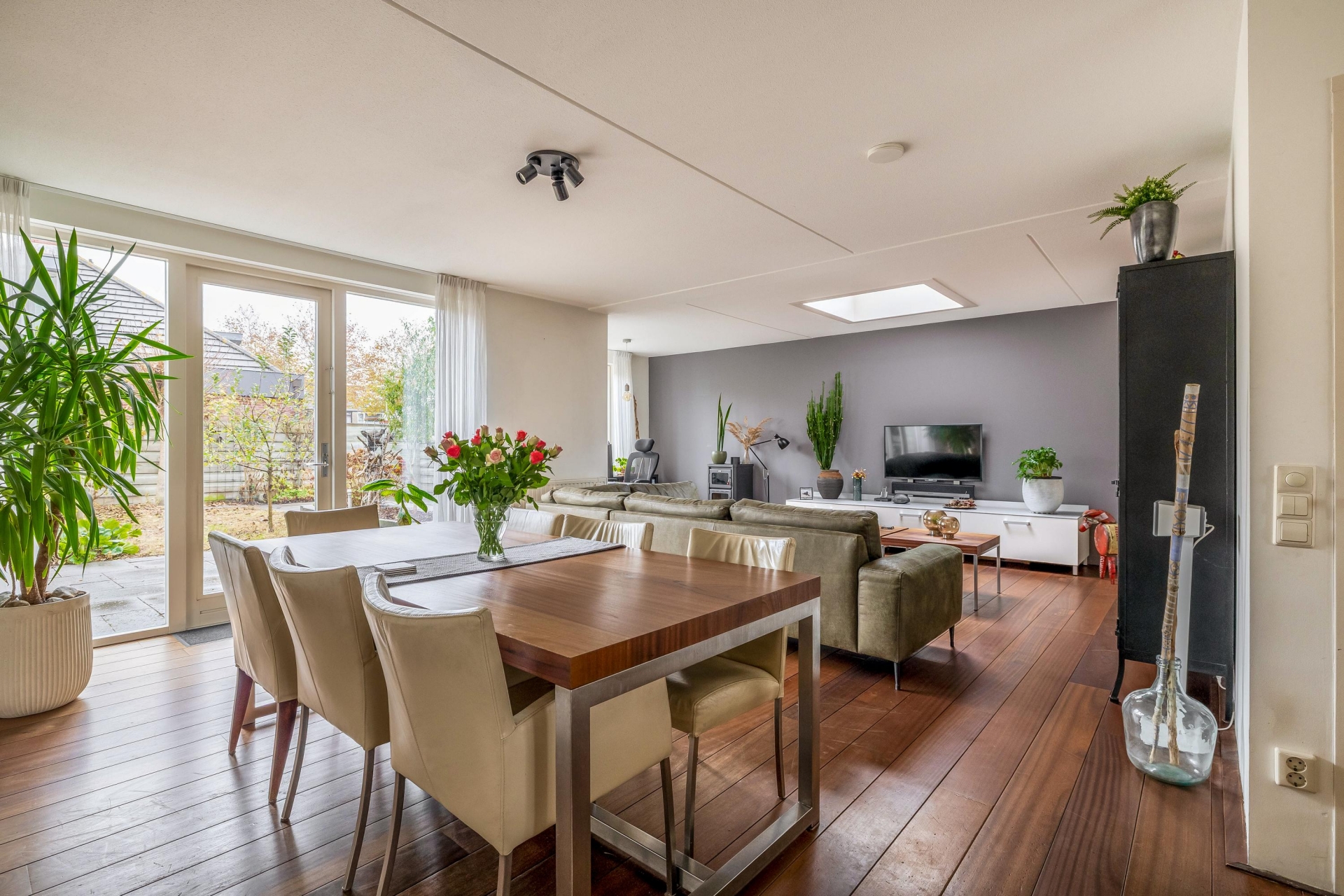 De woonkamer van circa 35 m² is tuingericht en heerlijk licht dankzij de grote raampartijen. Vanuit hier kijk je zo de groene achtertuin in. De begane grond is praktisch ingedeeld met een ruime hal, toilet, toegang tot de inpandige garage én natuurlijk de open keuken aan de voorzijde. De keuken is voorzien van inbouwapparatuur en een fijne plek voor een grote eettafel, waar je met het hele gezin of met vrienden lekker kunt tafelen. De woonkamer en keuken lopen naadloos in elkaar over en maken dit een fijne leefruimte met volop mogelijkheden.