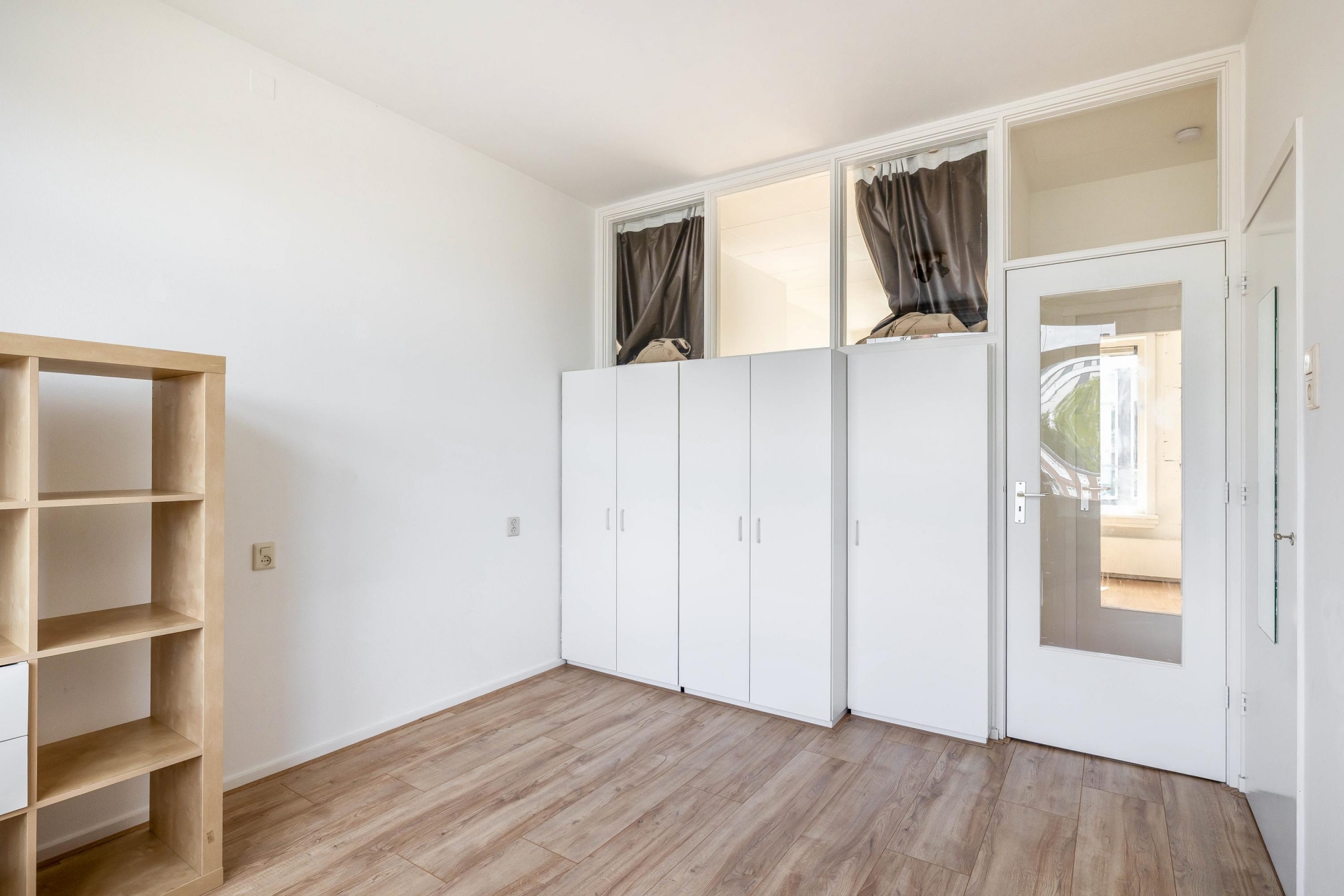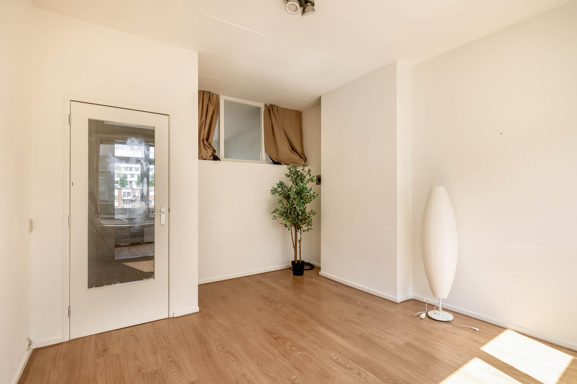 De woonkamer is licht en overzichtelijk met een grote raampartij. Hier kijk je vrij uit over de straat. Door de ligging op het oosten geniet je in de ochtend van de zon in je woonkamer – een heerlijke plek om de dag rustig op te starten. De lichte laminaatvloer en lichte wanden zorgen voor een neutrale basis die je makkelijk naar eigen smaak kunt aankleden.