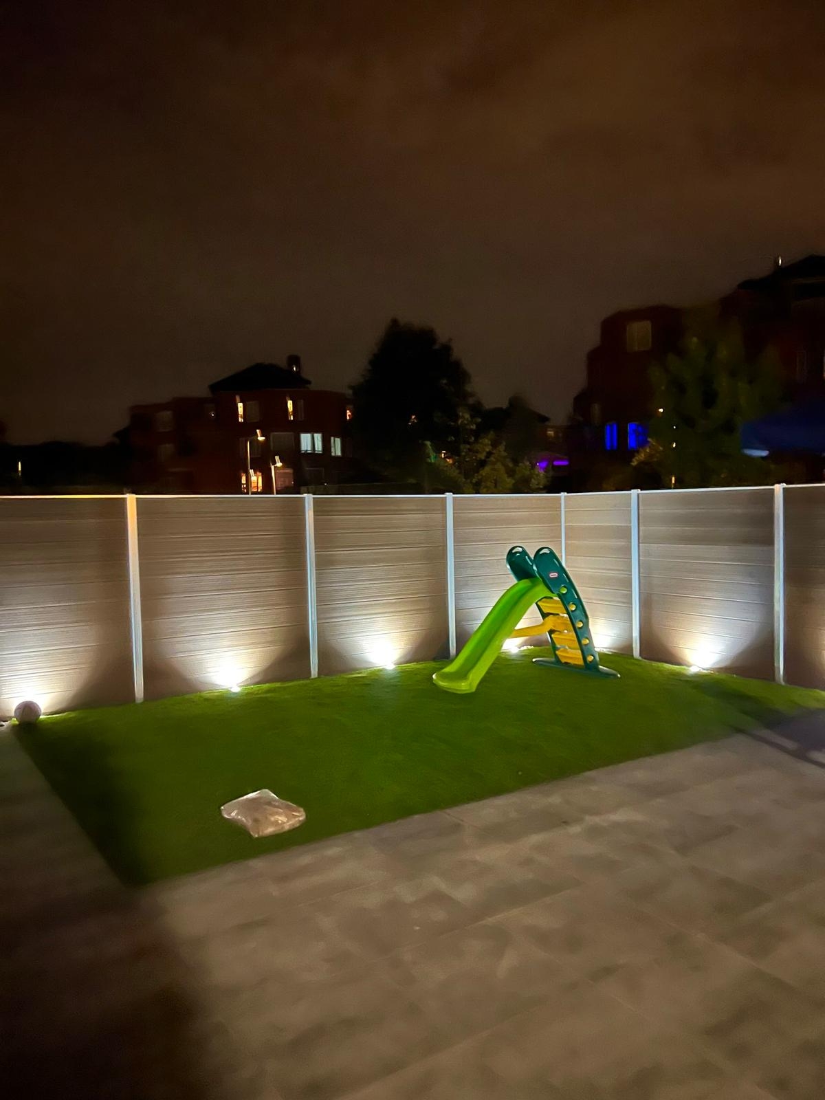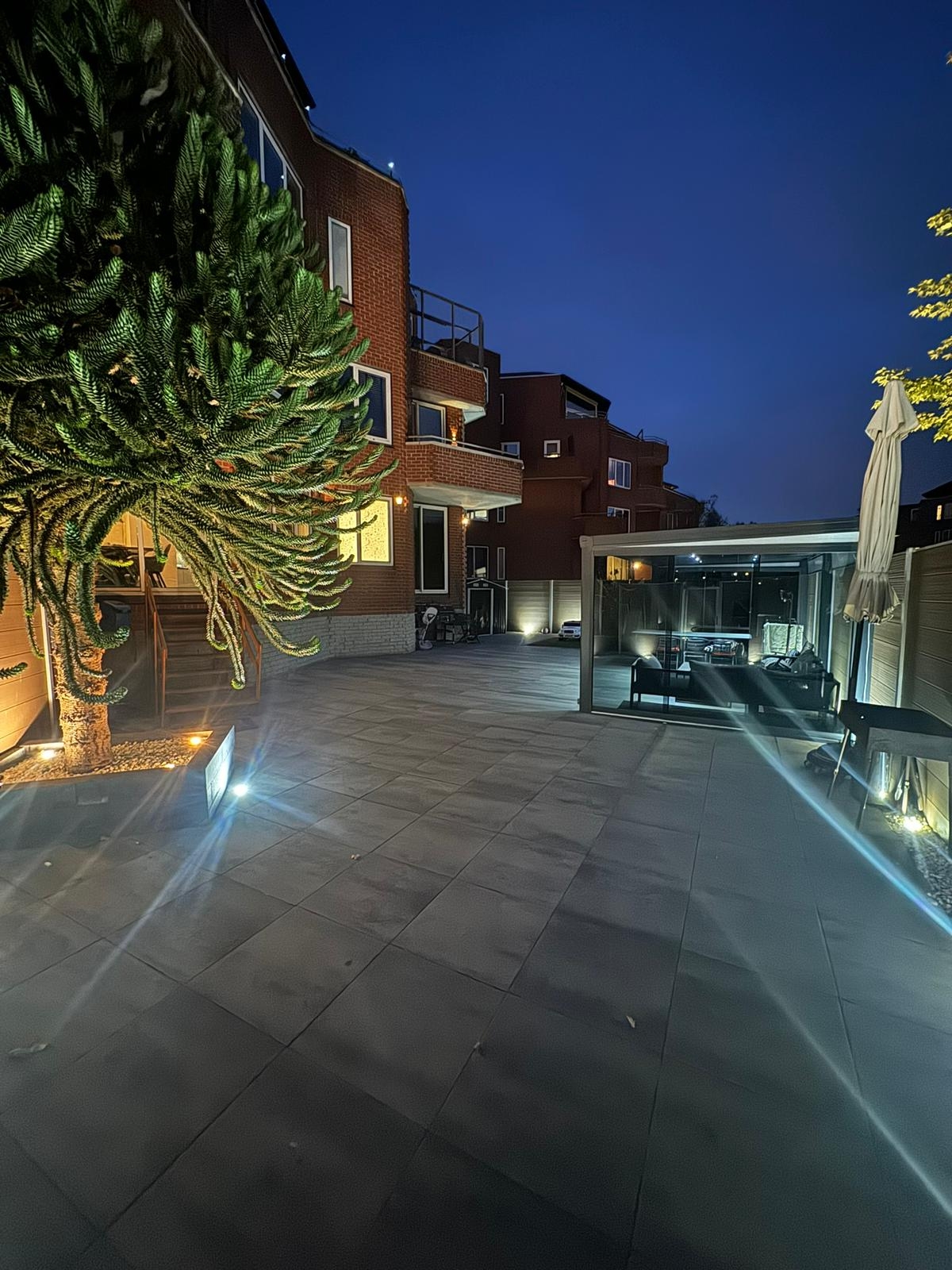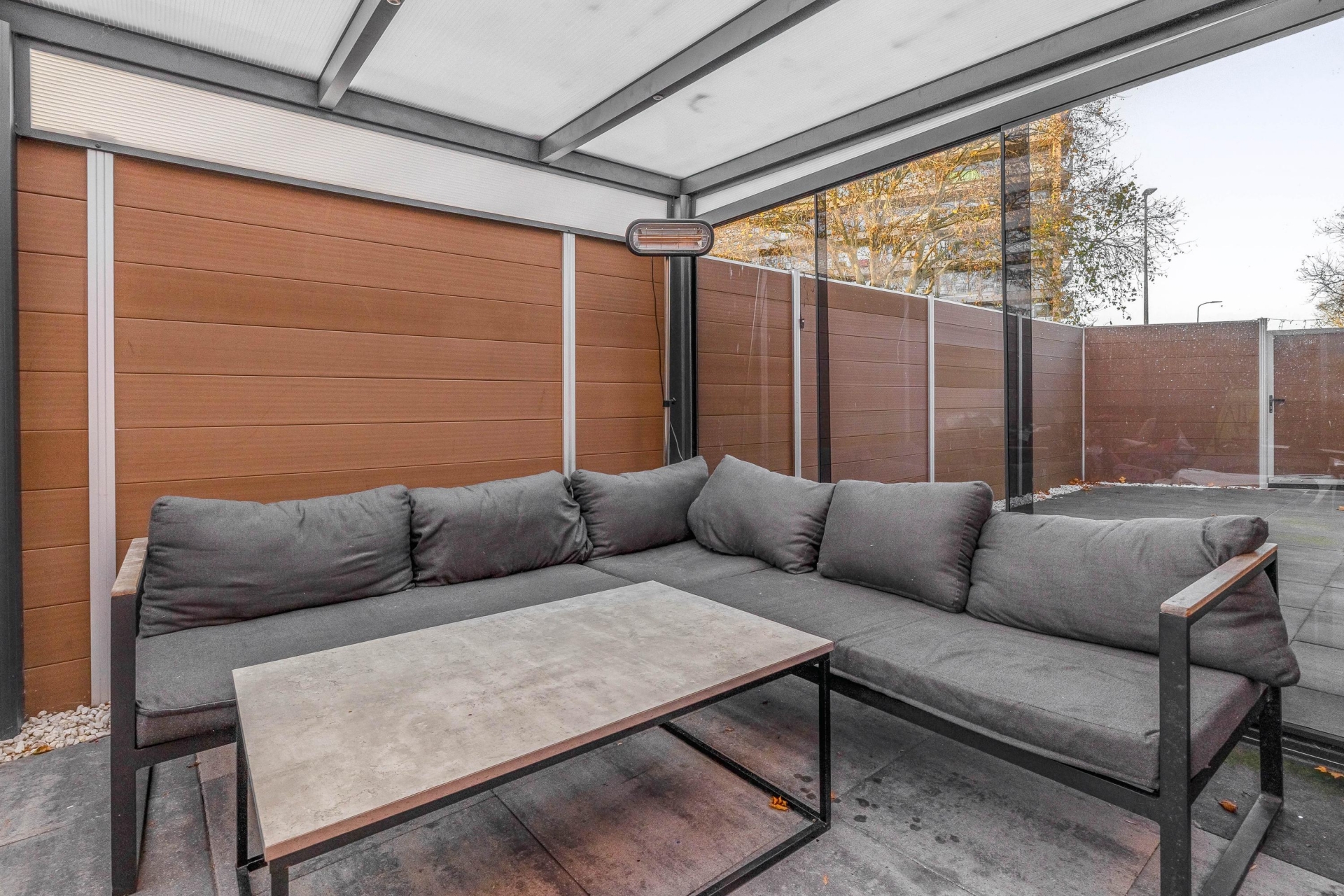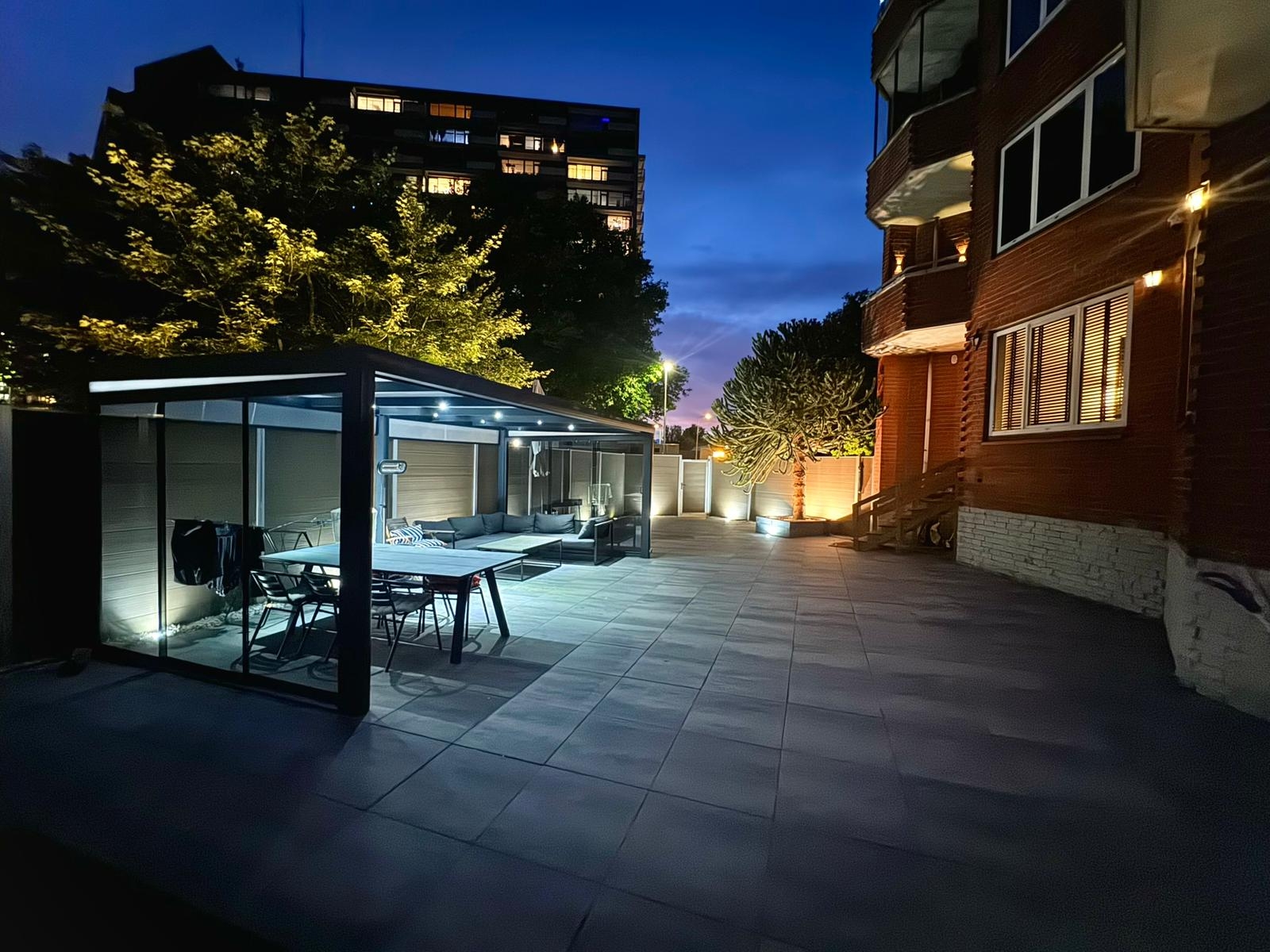- Royale achtertuin met vernieuwde schutting, stalen overkapping en sfeervolle tuinverlichting aanwezig;
