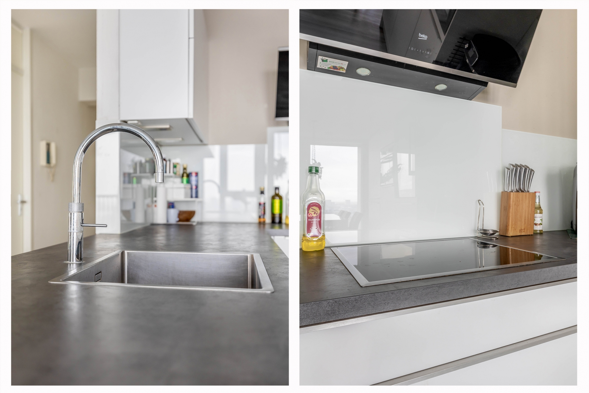 Bij binnenkomst in de woonkamer wordt je blik direct naar buiten getrokken. Dankzij de hoge ligging en de grote raampartijen geniet je hier van een panoramisch uitzicht over de stad, van zonsopkomst tot een indrukwekkend verlichte skyline in de avond. De woonkamer is ruim, licht en strak afgewerkt en biedt moeiteloos plaats aan een royale zithoek én een comfortabele werkplek. De open verbinding met de keuken versterkt het ruimtelijke gevoel en maakt de indeling zowel praktisch als uitnodigend.