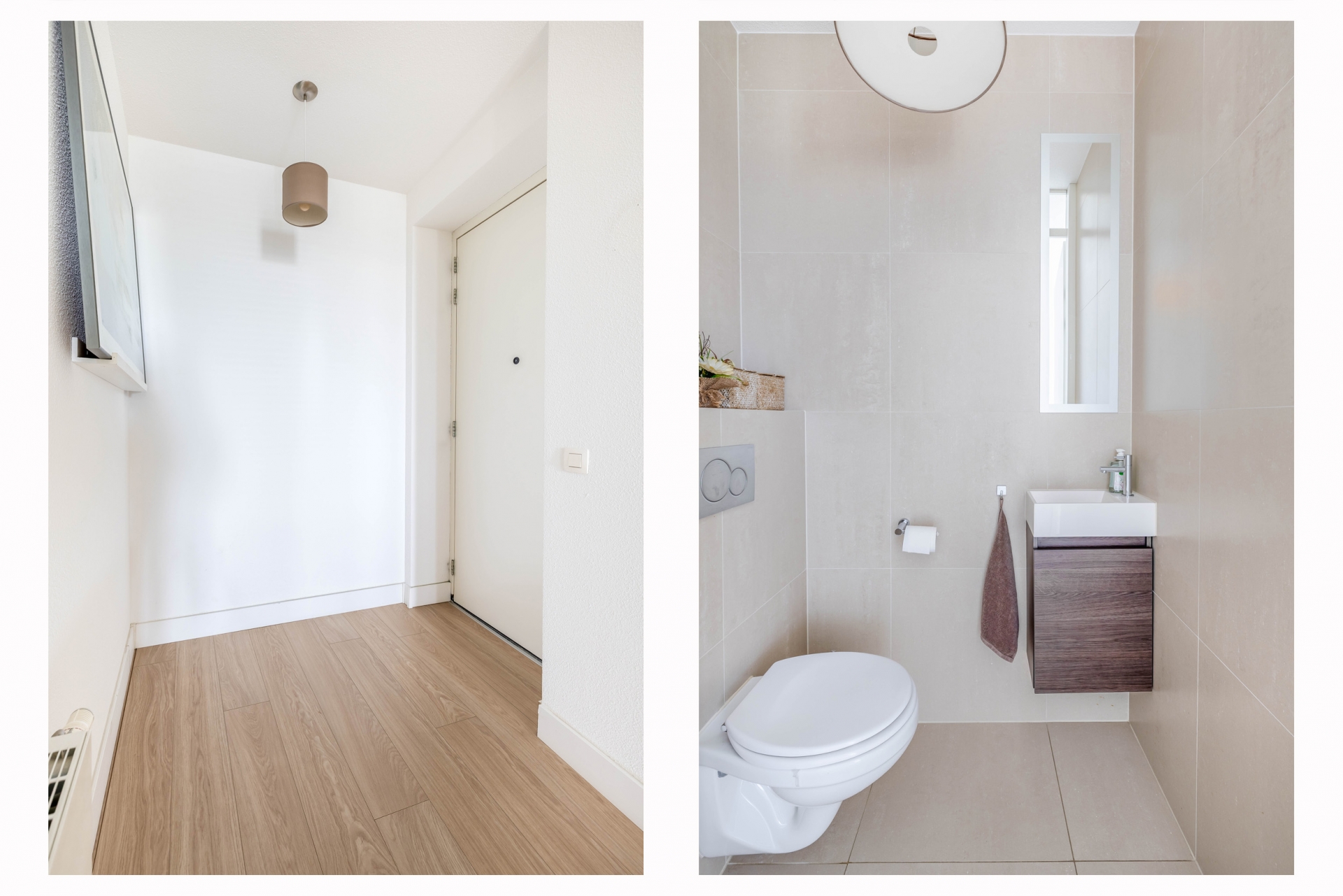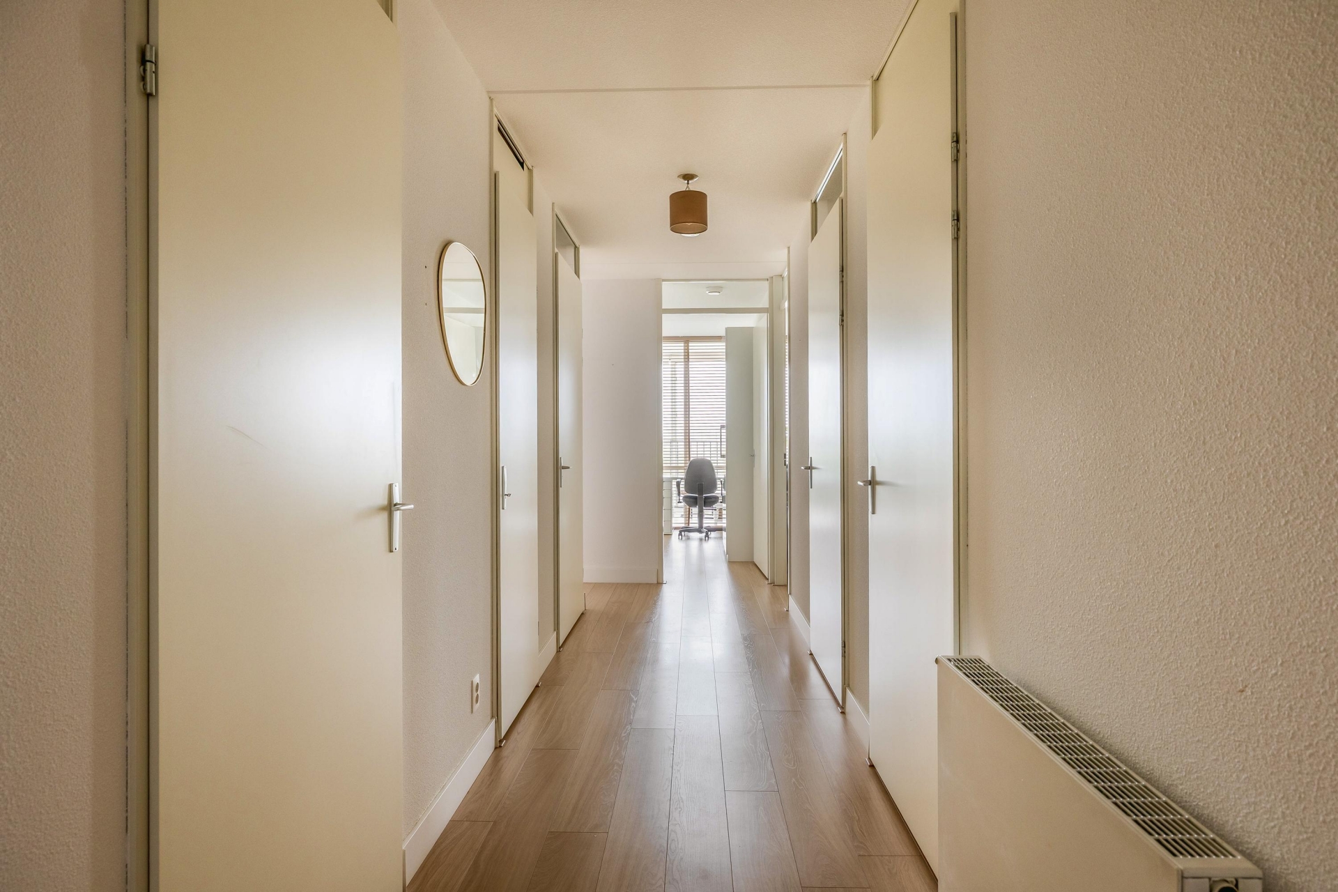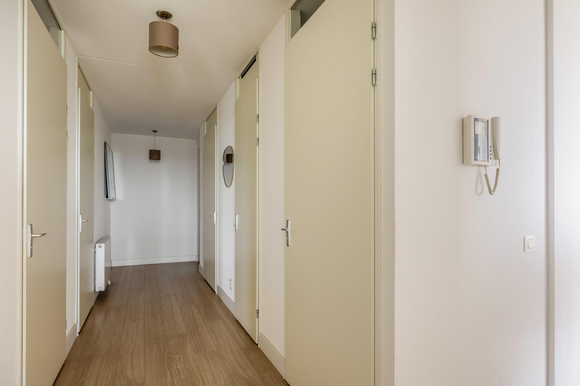 Bij binnenkomst in het appartement geeft de hal toegang tot alle vertrekken: twee slaapkamers, de badkamer, het separate toilet, een technische ruimte en een inpandige berging. Aan het einde van de hal ligt de woonkamer met open keuken. Wat hier direct opvalt, is het indrukwekkende uitzicht.