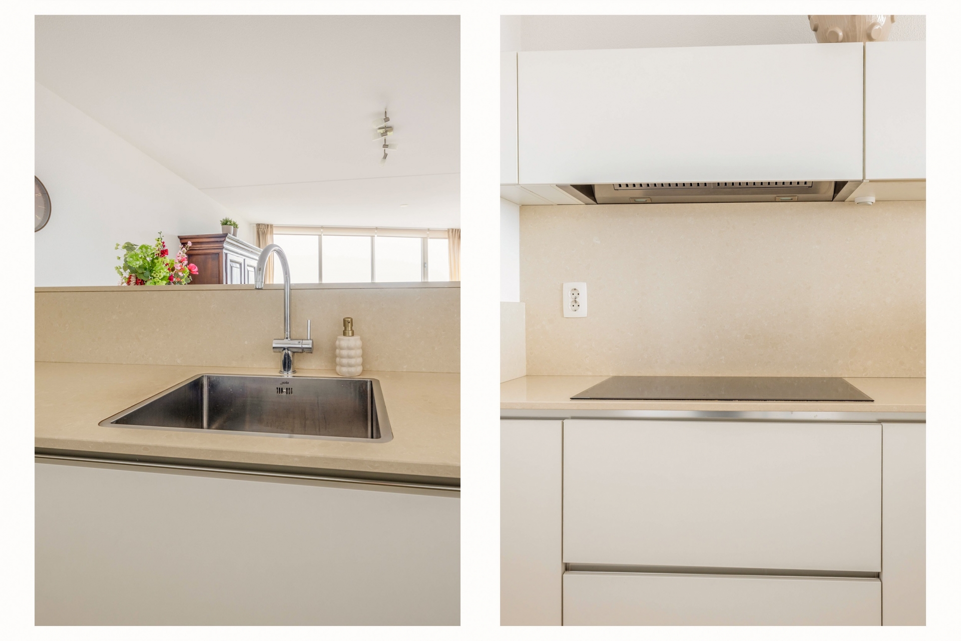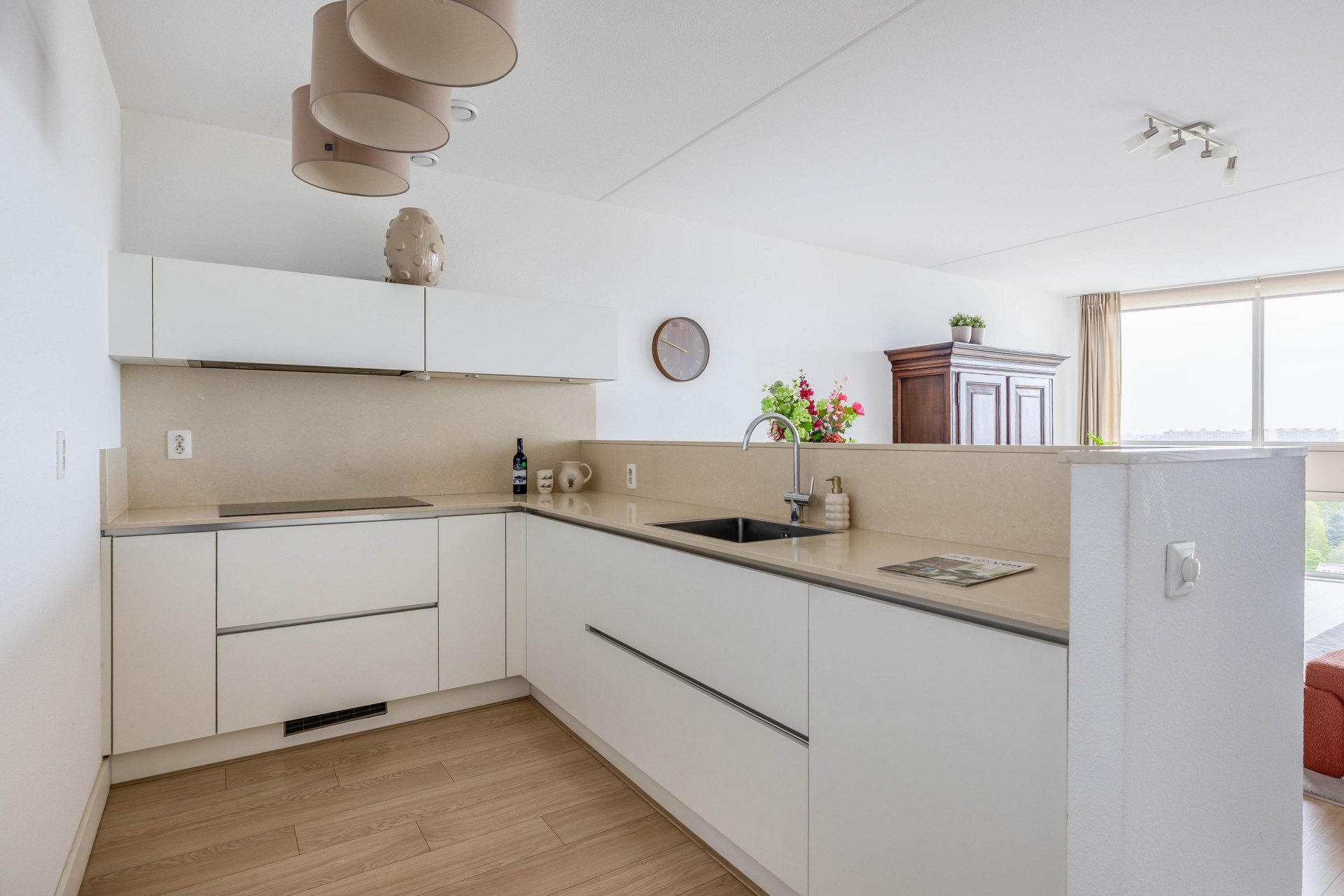 De open keuken is stijlvol uitgevoerd met witte fronten in een praktische L-opstelling en voorzien van alle benodigde inbouwapparatuur. Dankzij de indeling is er volop werkruimte en blijf je in contact met de woonkamer, ideaal tijdens het koken.