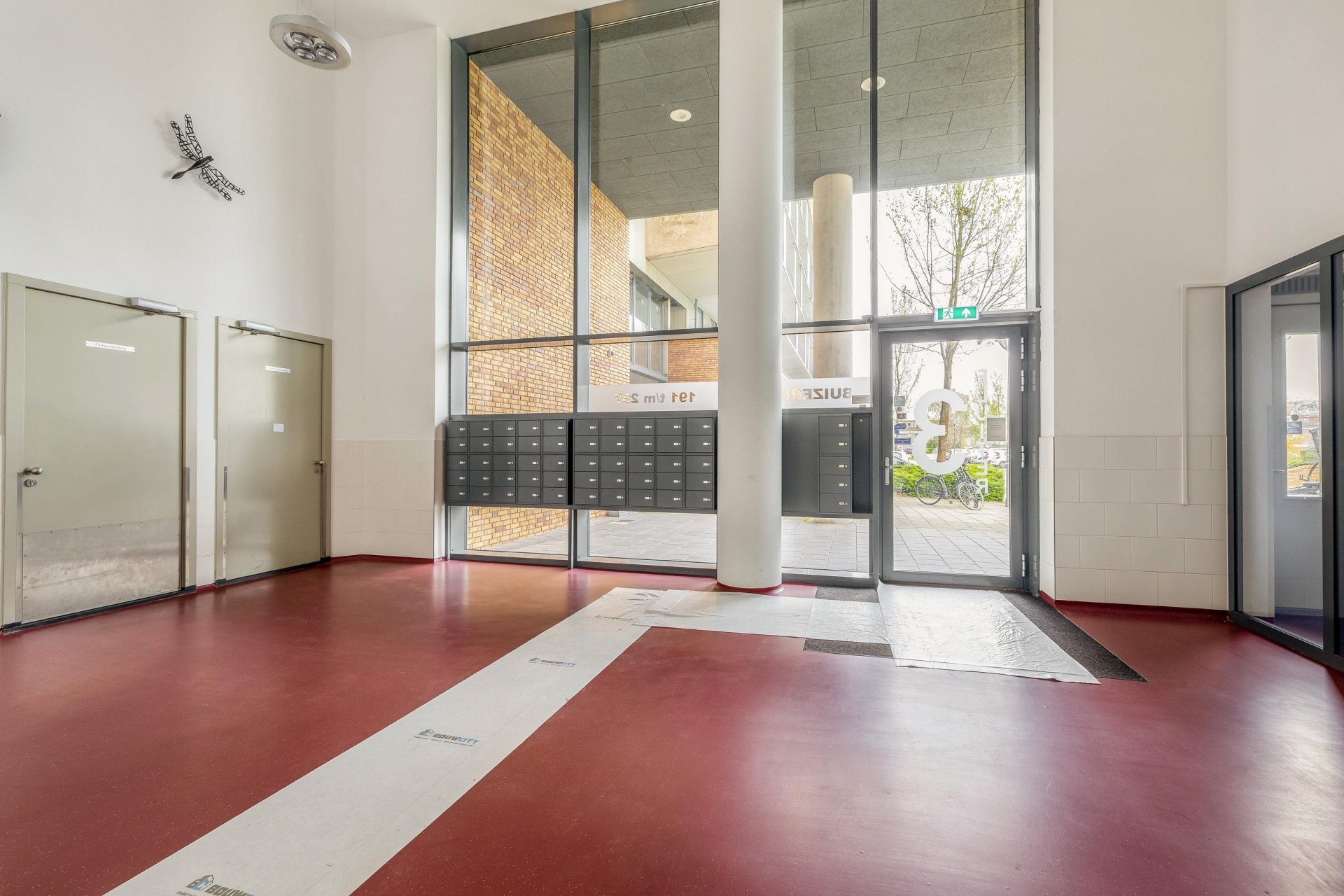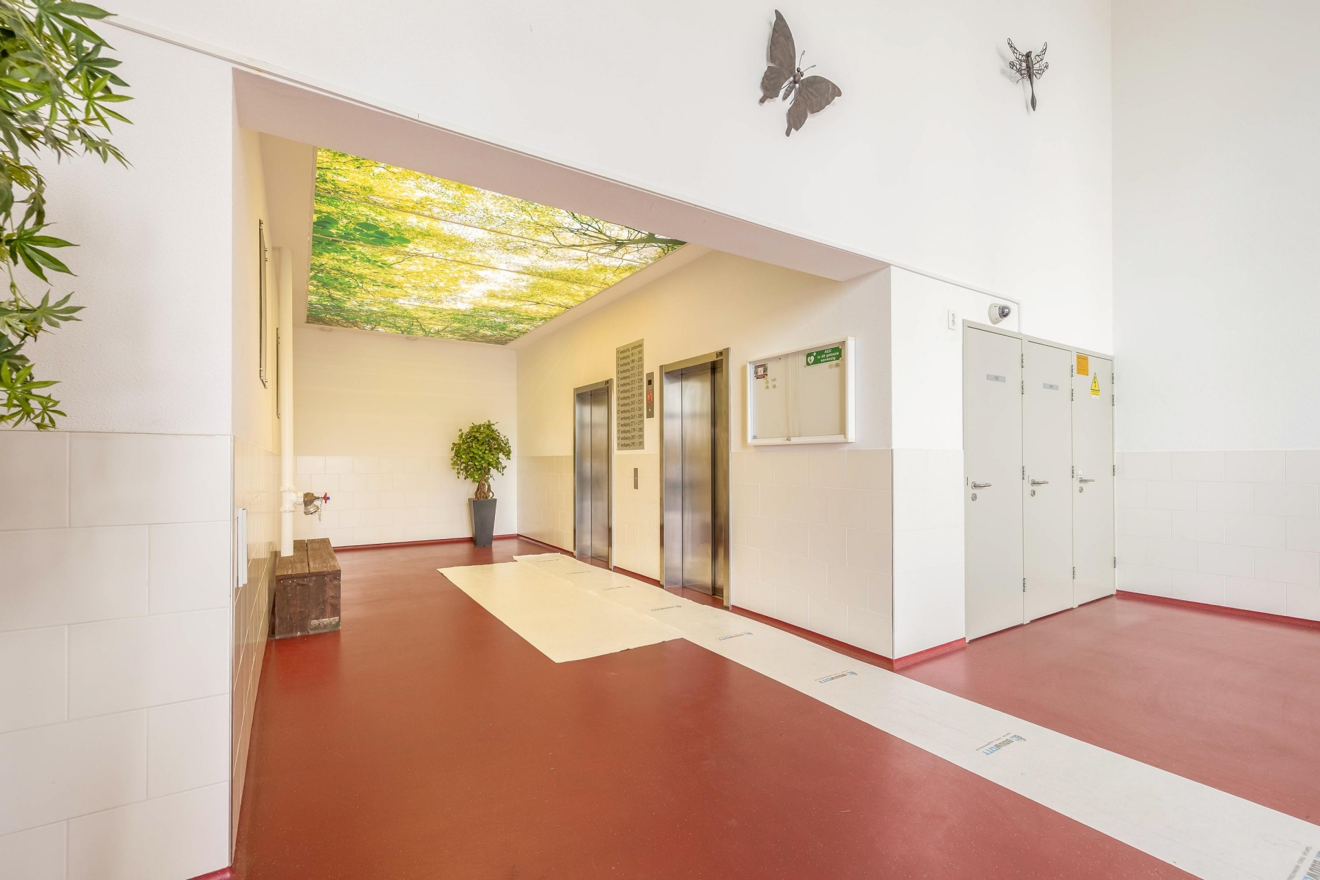 De afgesloten entree is voorzien van een videofooninstallatie en brievenbussen. In de centrale hal bevinden zich dubbele liften, een trappenhuis en toegang tot de gezamenlijke fietsenberging en containerruimte. Met de lift bereik je zowel het parkeerdek op de eerste verdieping als het appartement op de tiende verdieping.