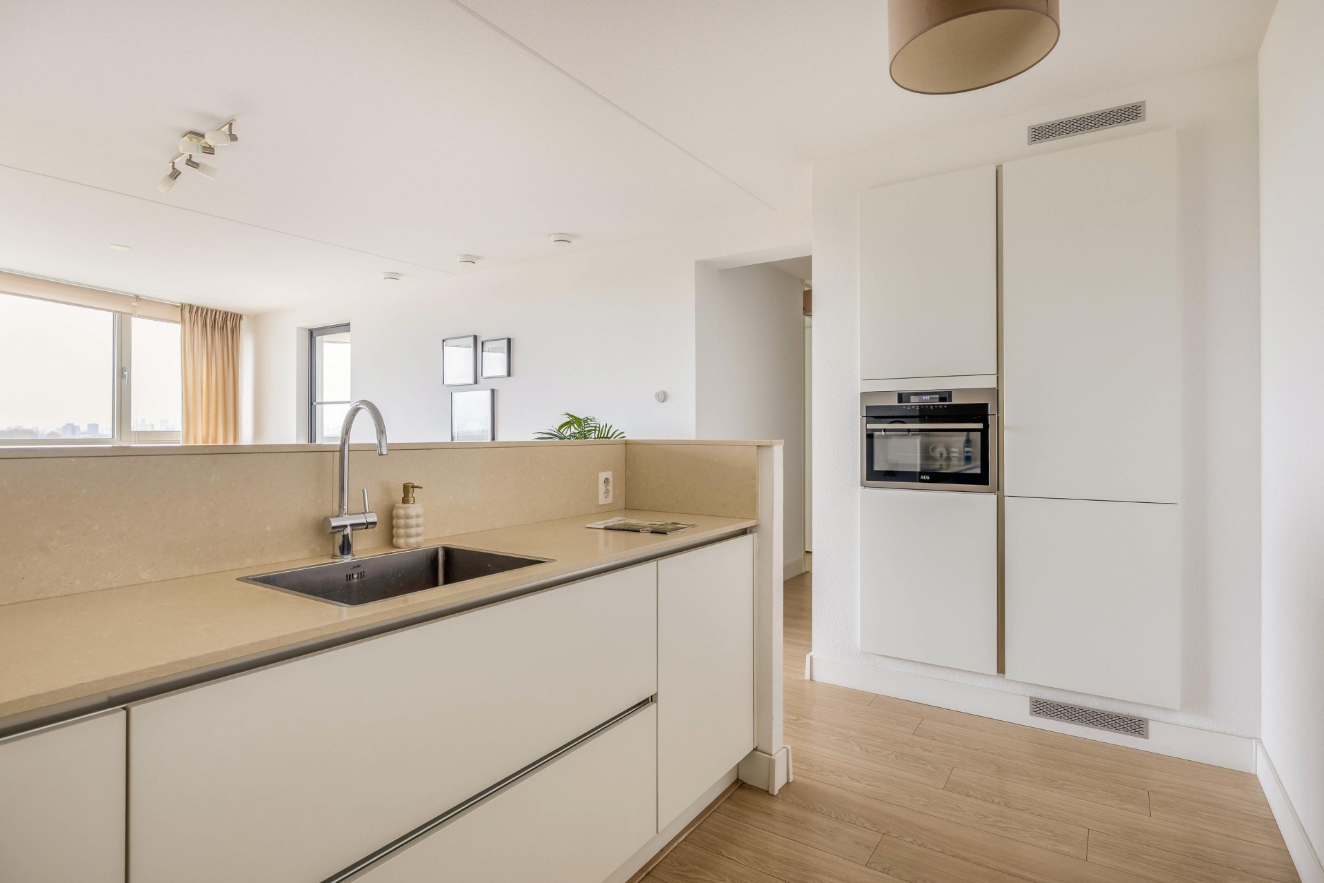 Dit appartement is volledig instapklaar: je hoeft hier werkelijk niets meer aan te doen. De woning wordt aangeboden inclusief de aanwezige inrichting, waardoor je het direct kunt betrekken. De moderne keuken heeft een lichte uitstraling, staat in open verbinding met de woonkamer en is praktisch ingedeeld. Vanuit de woonkamer geniet je van een fraai, vrij uitzicht met zicht op de skyline van Rotterdam.
