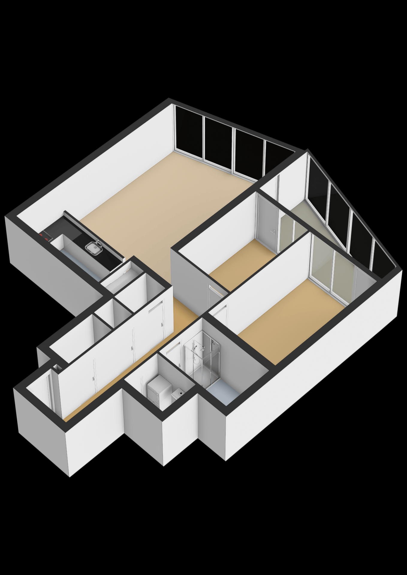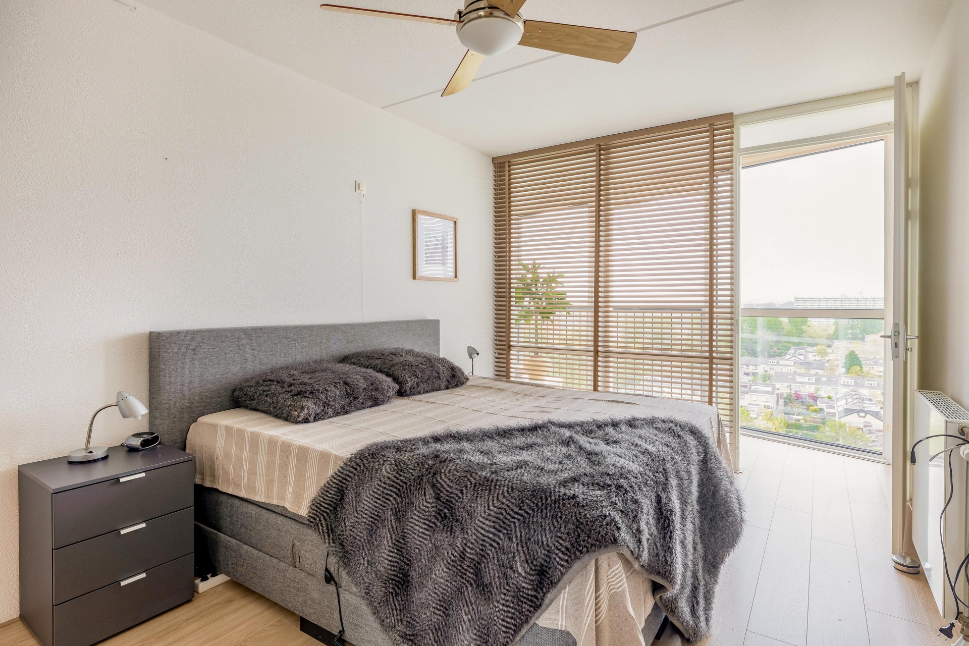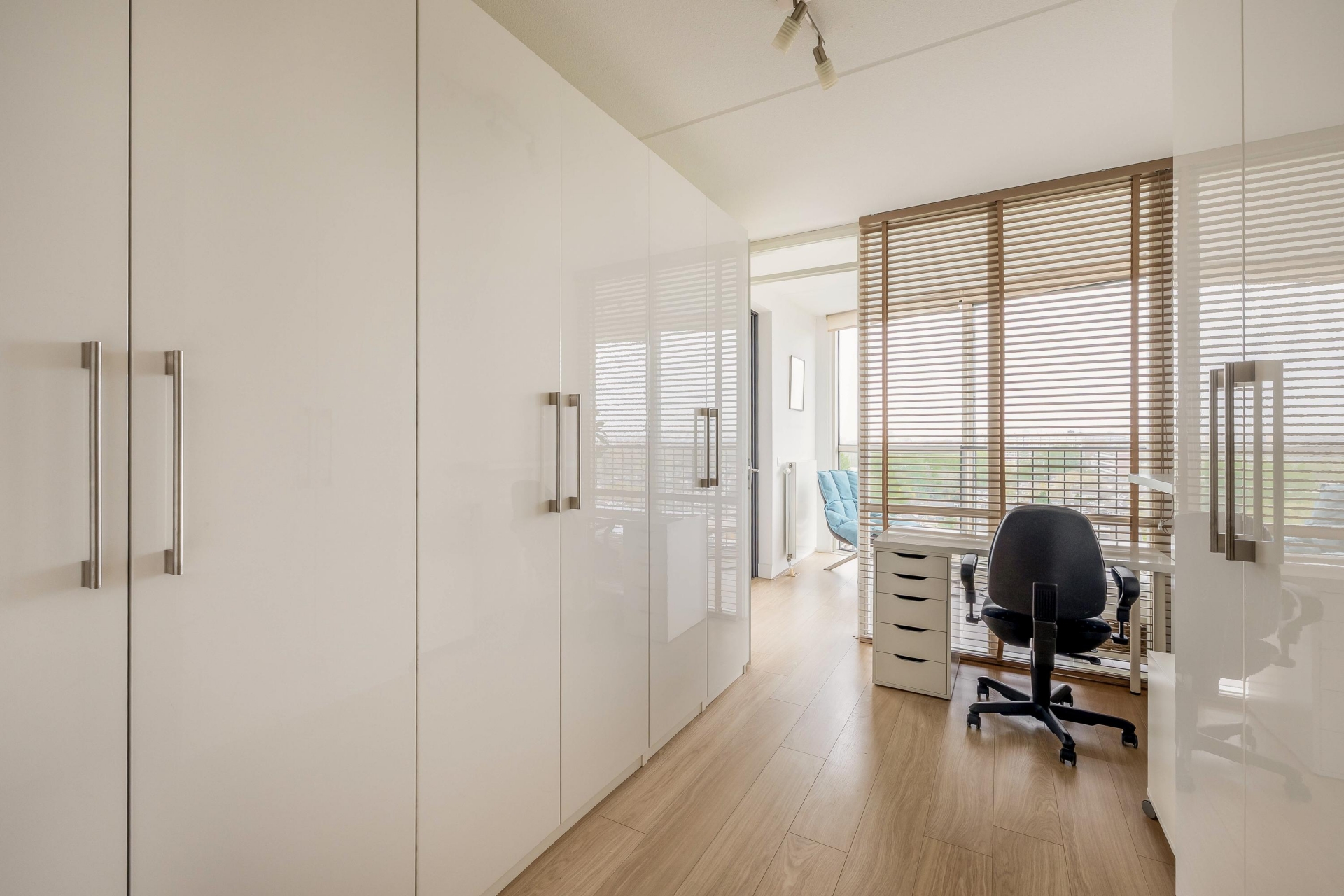 Het appartement beschikt over drie kamers, waarvan twee volwaardige slaapkamers. De ruime hoofdslaapkamer ligt aan de rustige zijde van het appartement en is perfect als master bedroom. De tweede kamer is geschikt als logeer-, werk- of hobbyruimte. Daarnaast is er een extra zitkamer/loggia die flexibel te gebruiken is.