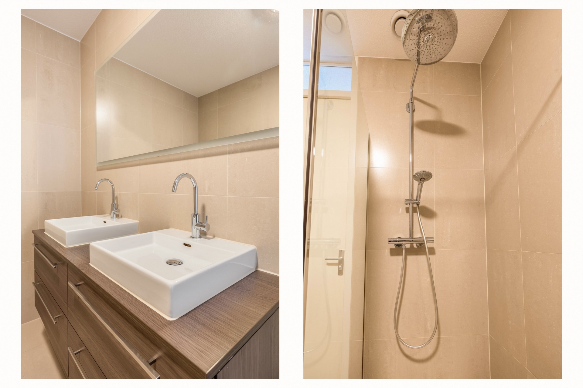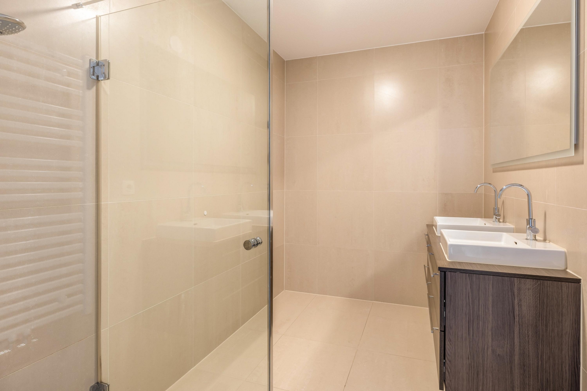 - Ruime badkamer met inloopdouche en dubbele wastafel;