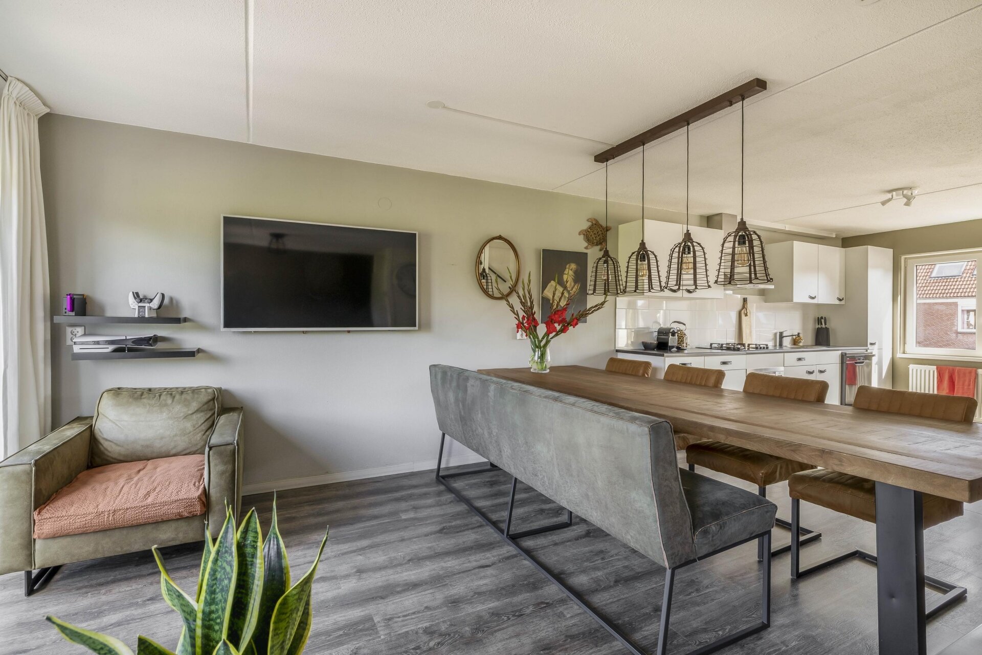 Aangekomen op de eerste verdieping bevindt zich de woonkamer. Deze ruimte is heerlijk licht dankzij grote ramen aan de achterzijde toegang naar een balkon. De ligging met de woonkamer op de eerste verdieping, aan de rand van de wijk zorgt voor een vrij uitzicht op het groen achter het huis, wat direct een gevoel van rust en ruimte geeft.