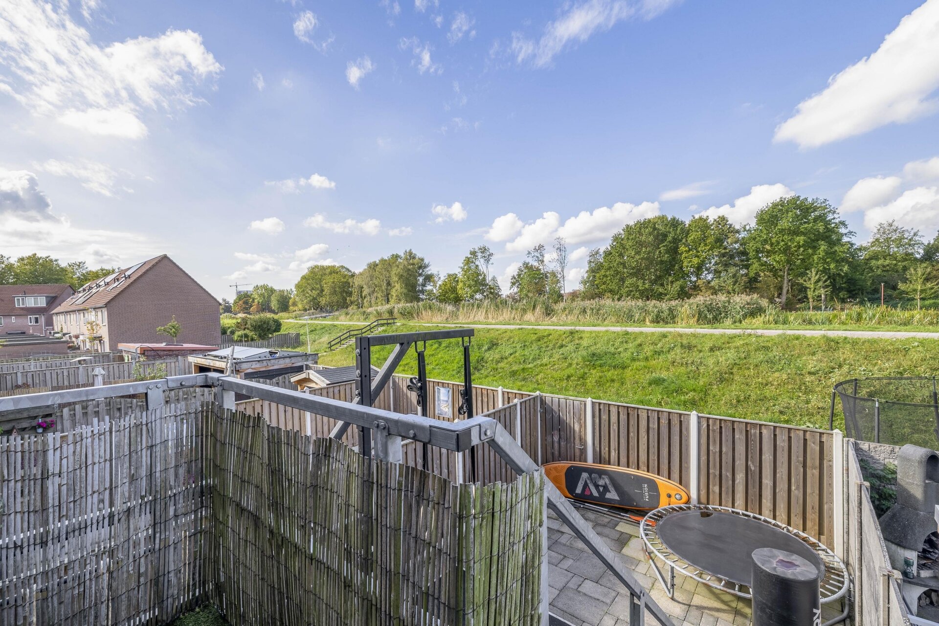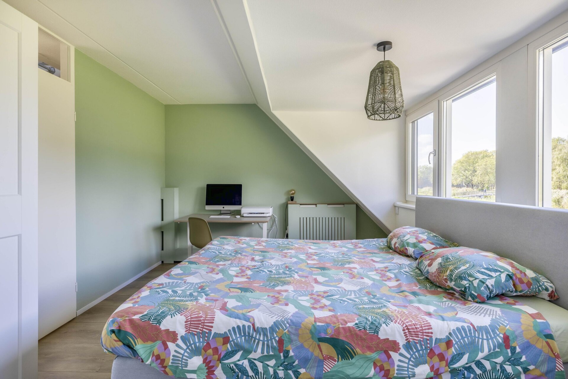 Aan de achterzijde kijk je uit over het water en de dijk, waar de hele dag mensen wandelen, fietsen en genieten van de natuur. Dat uitzicht verveelt nooit.
