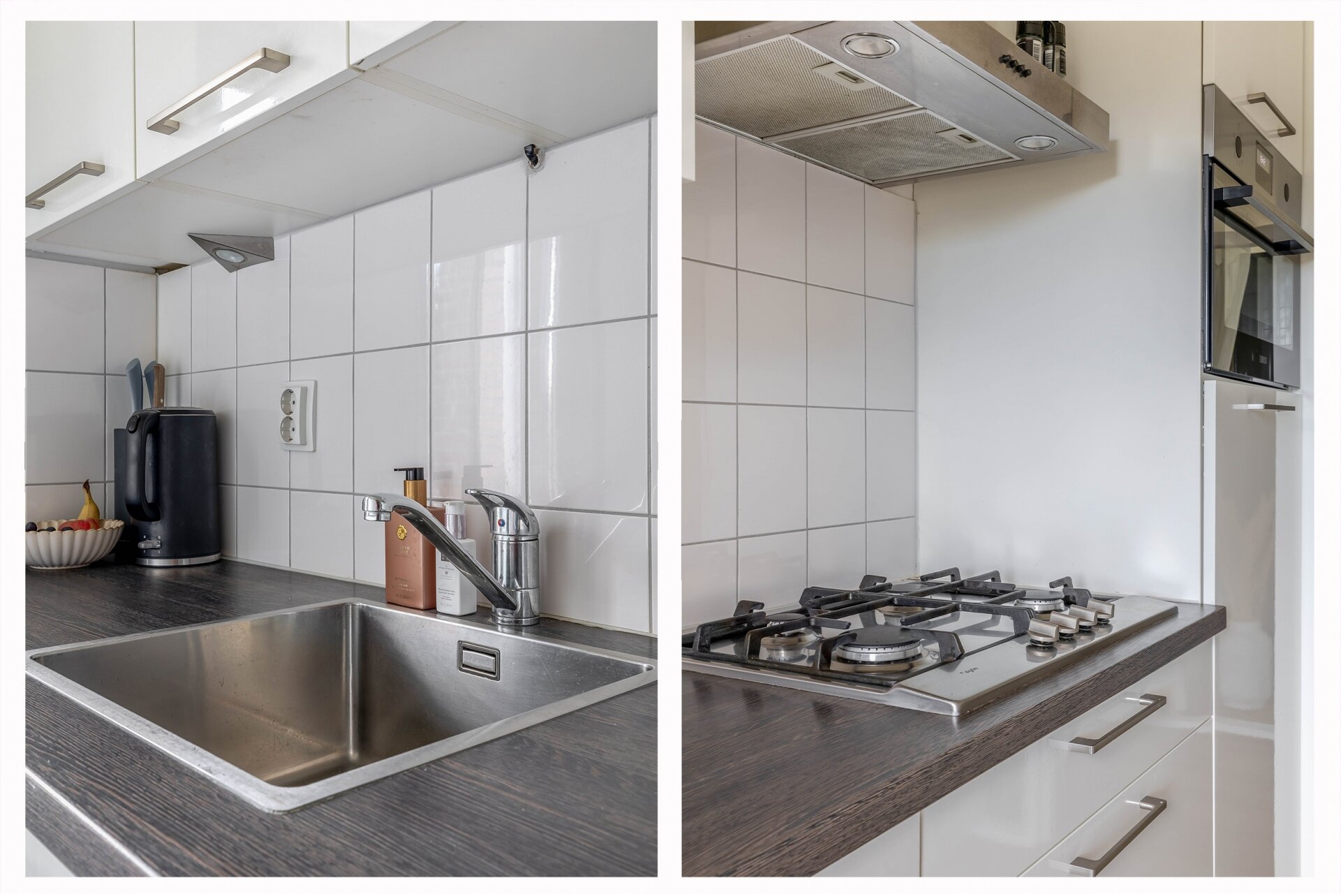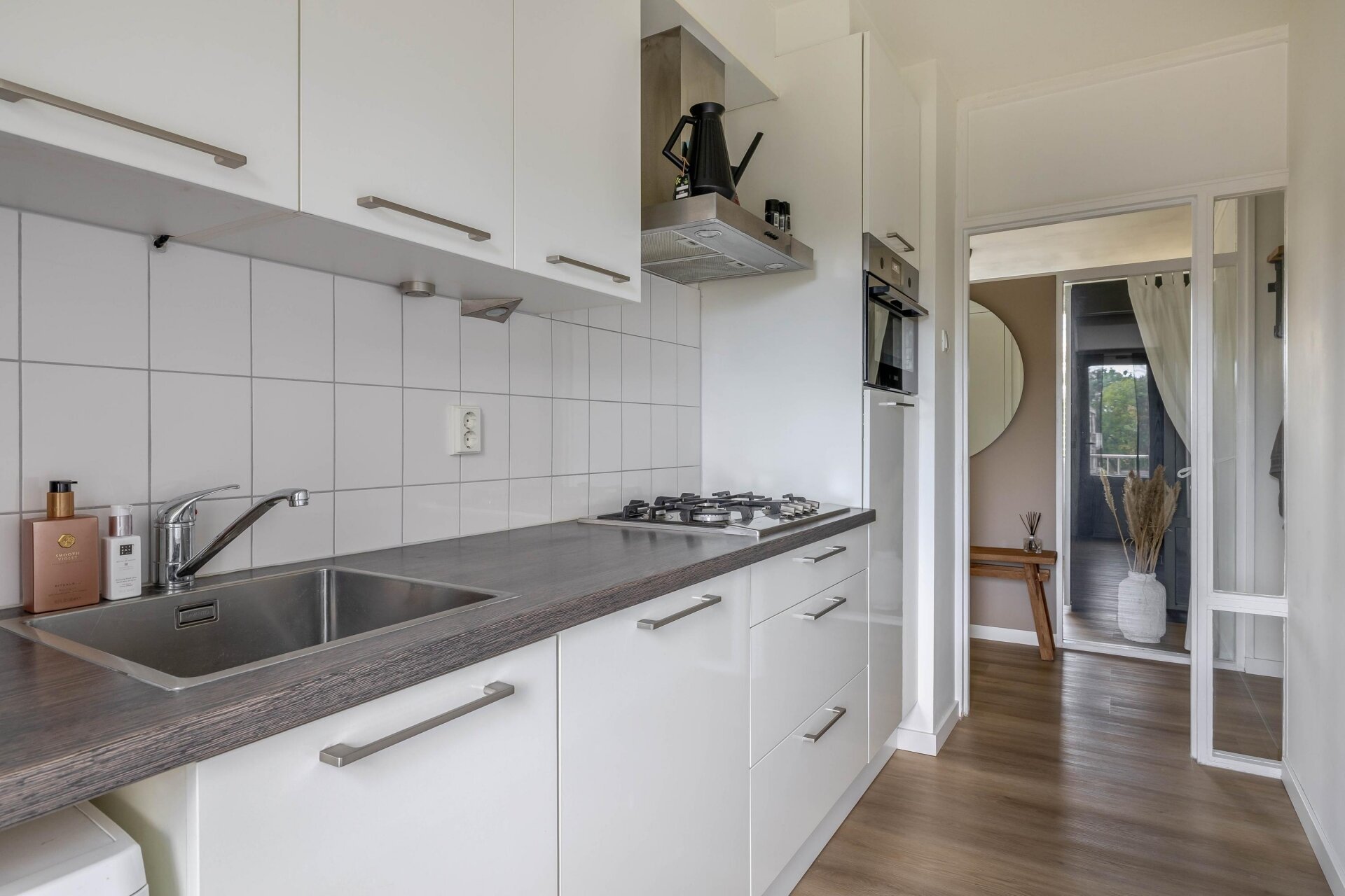 - Keuken: moderne inbouwkeuken met gaskookplaat, combimagnetron, koelkast met vriesvak, vaatwasser en wasmachine-aansluiting. Vanuit de keuken toegang tot het balkon aan de achterzijde.