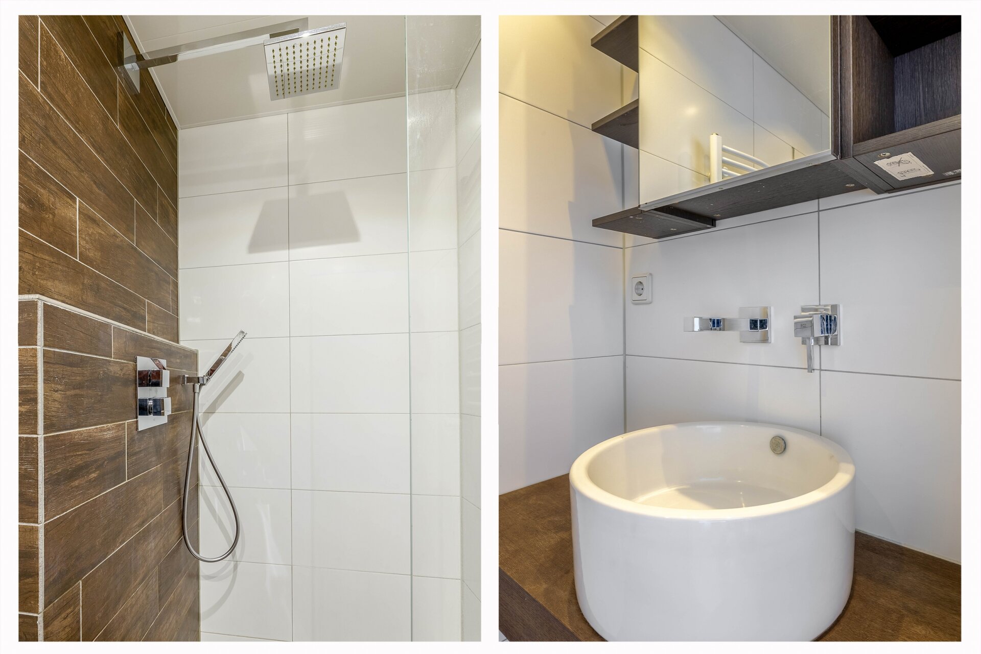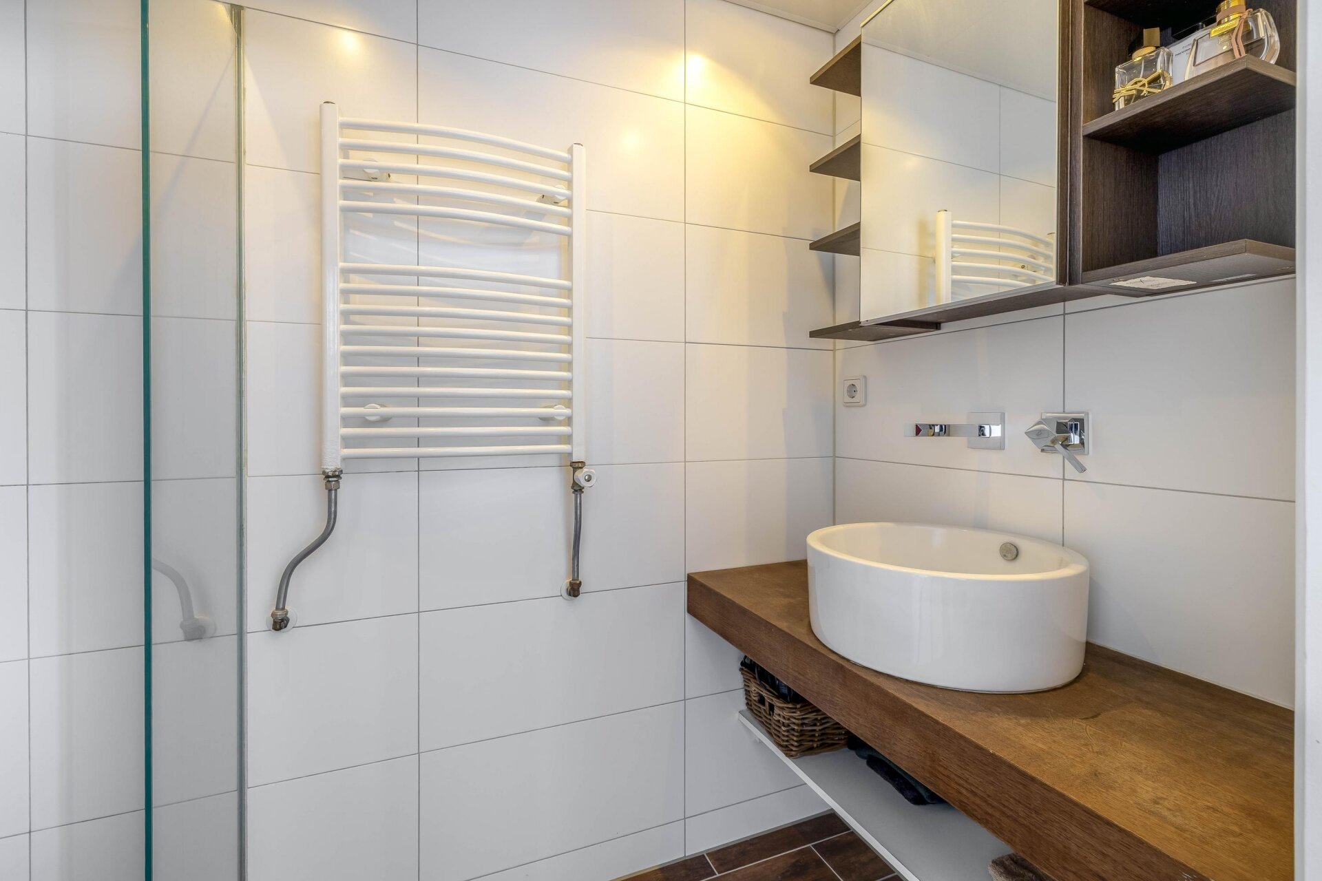 - Luxe badkamer: modern betegeld, met inloopdouche, rainshower, handdouche, wastafelmeubel met waskom en kraan in de wand, inbouwspots, mechanische ventilatie en designradiator.