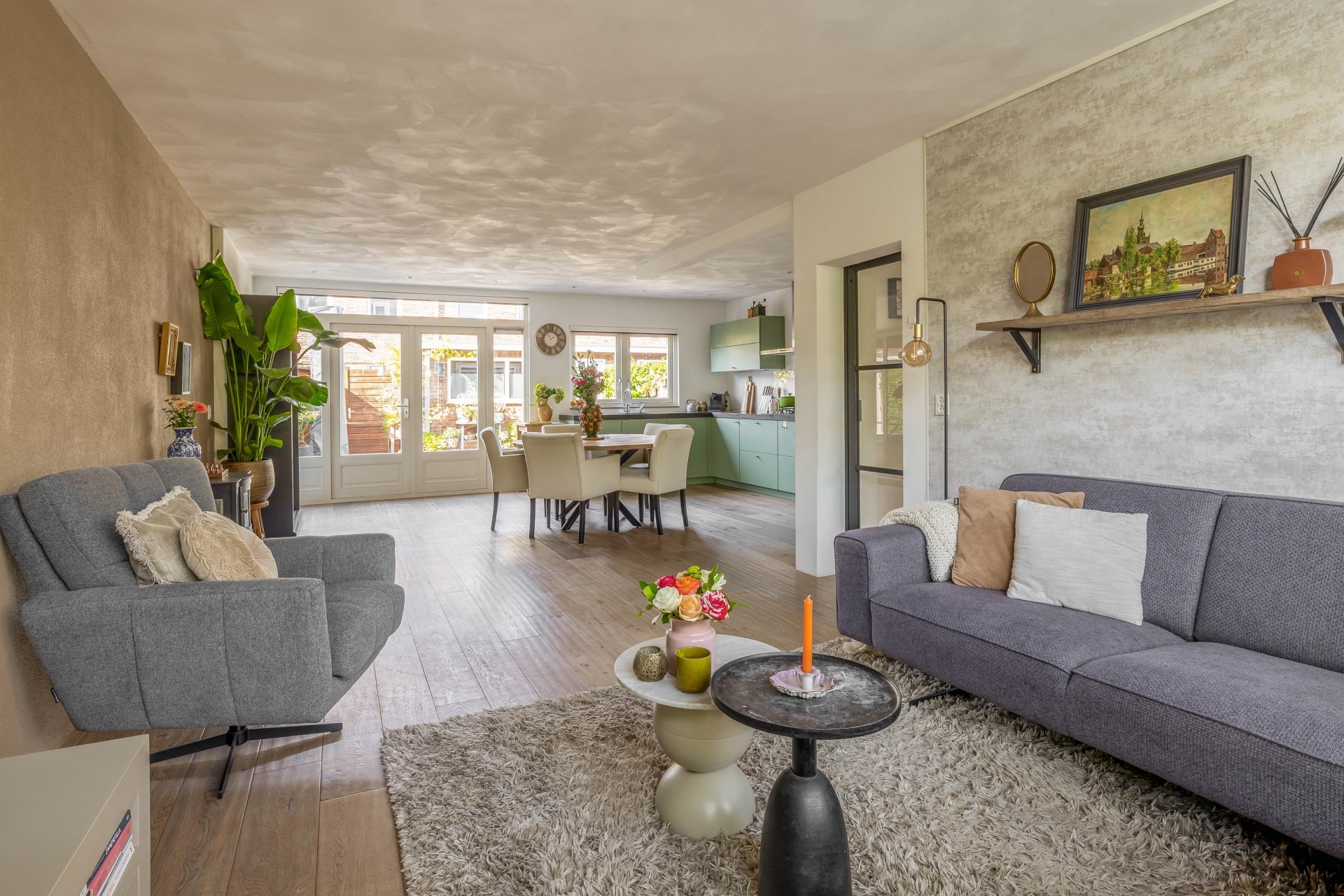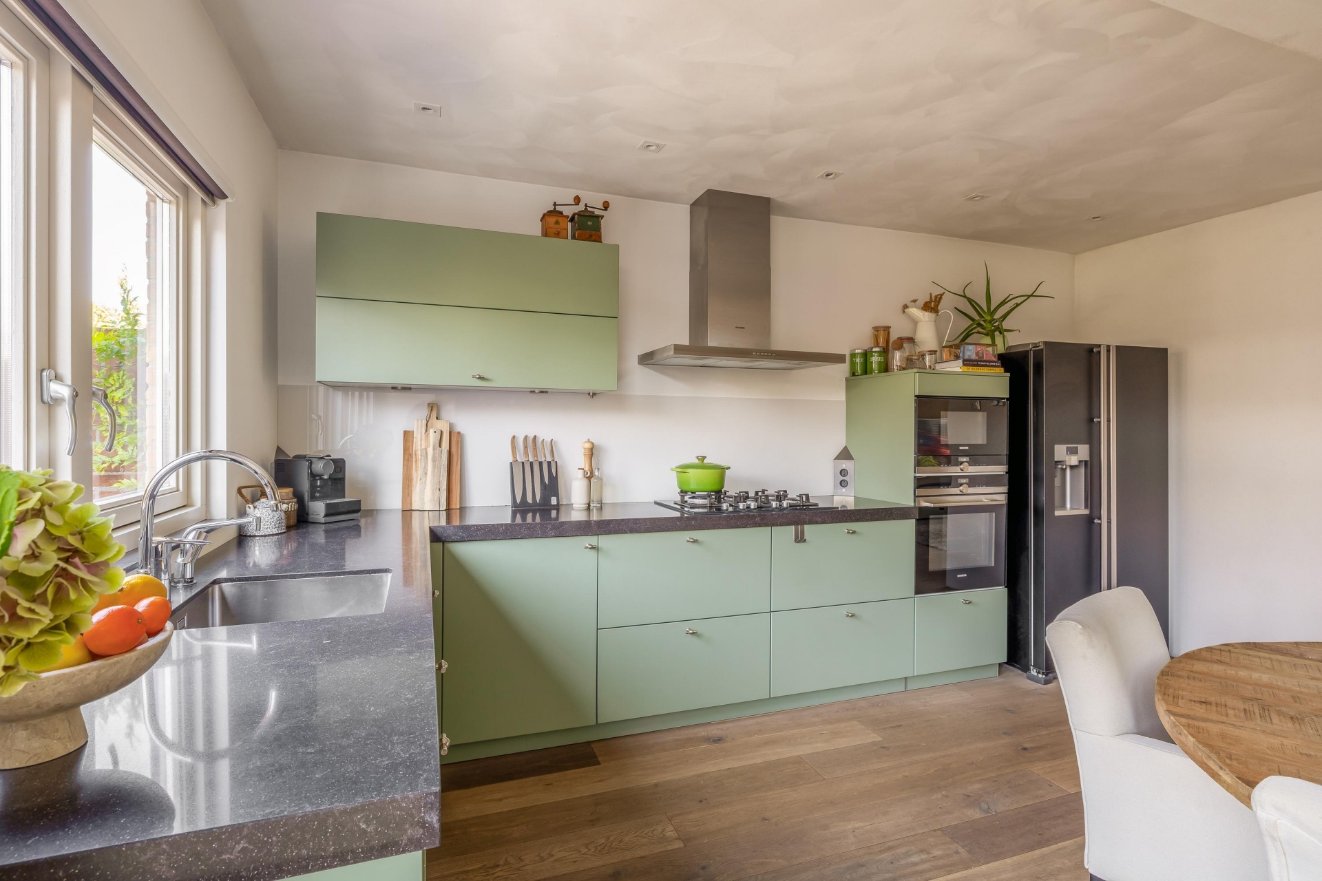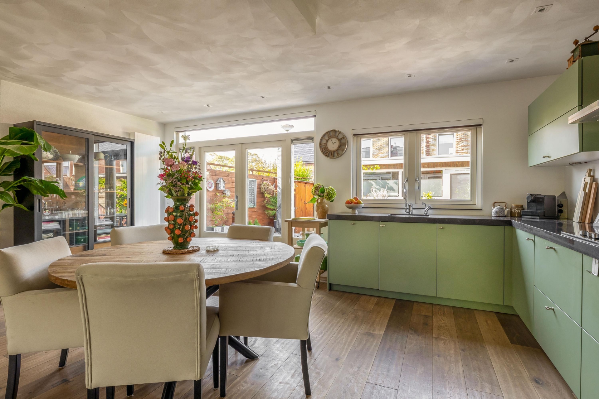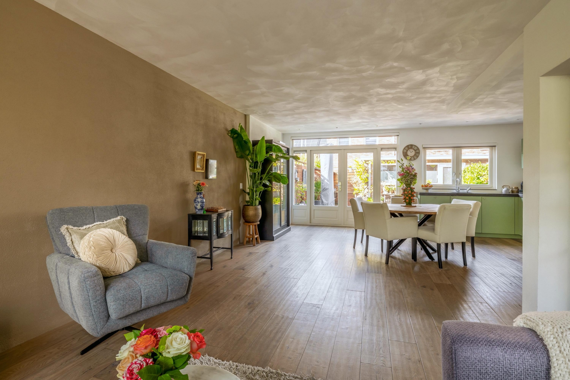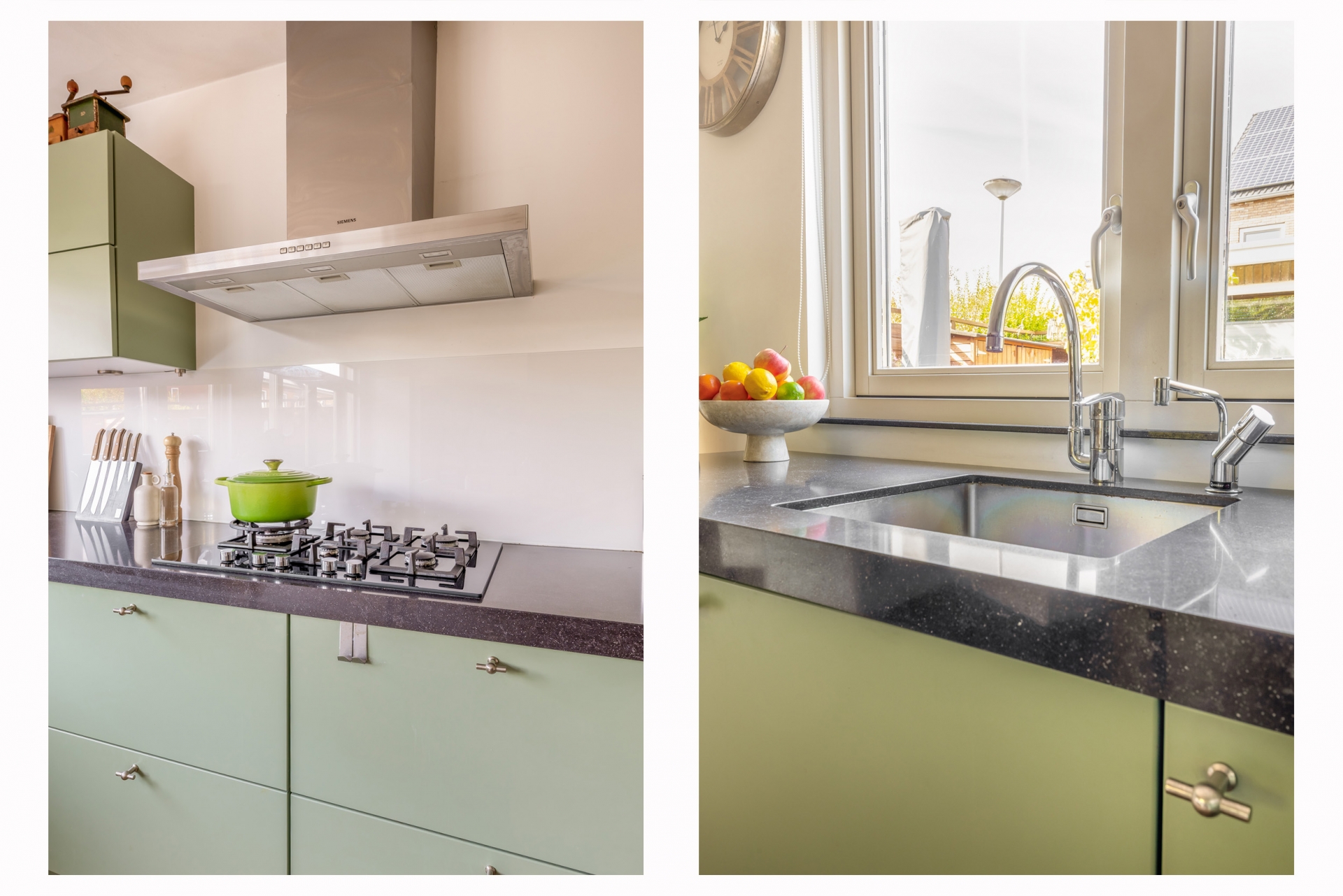 Bij binnenkomst valt direct de uitgebouwde woonkamer op: een heerlijke open ruimte met een warme sfeer, strak gestucte wanden en een natuurlijke lichtinval. De openslaande deuren naar de tuin zorgen voor een fijne verbinding tussen binnen en buiten. De zithoek aan de voorzijde kijkt uit op de rustige straat, terwijl het eetgedeelte aan de tuinzijde perfect aansluit op de moderne woonkeuken. De keuken heeft een frisse en eigentijdse uitstraling met een rustig kleurenpalet en praktische opstelling. Je vindt hier onder meer een vijfpits gasfornuis, een moderne afzuigkap, een combi-oven en een grote Amerikaanse koelkast. Ideaal voor de kookliefhebber die van ruimte én sfeer houdt.