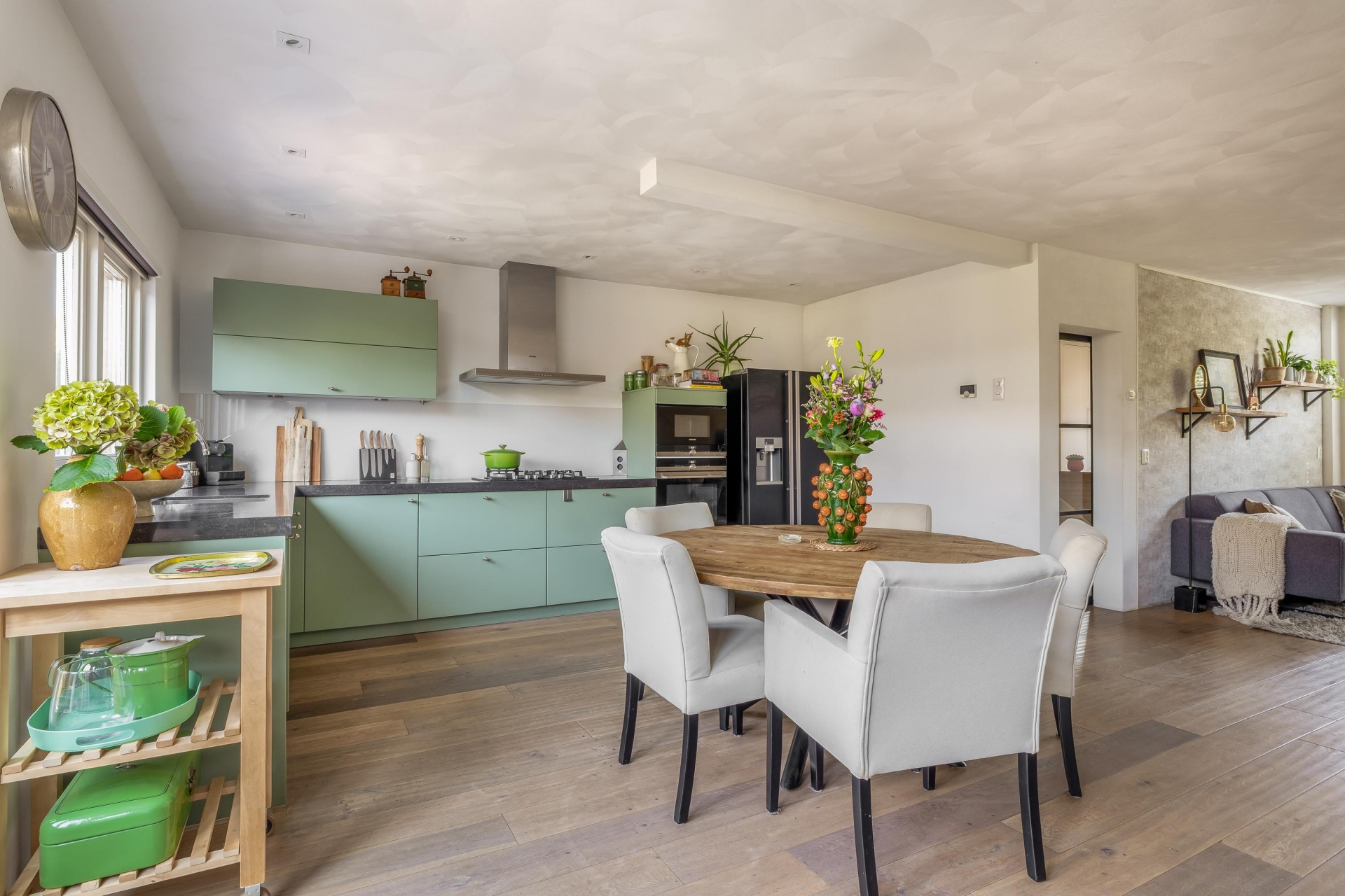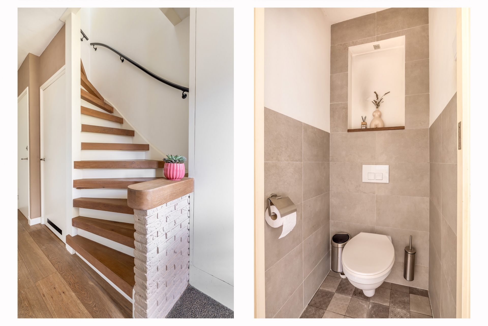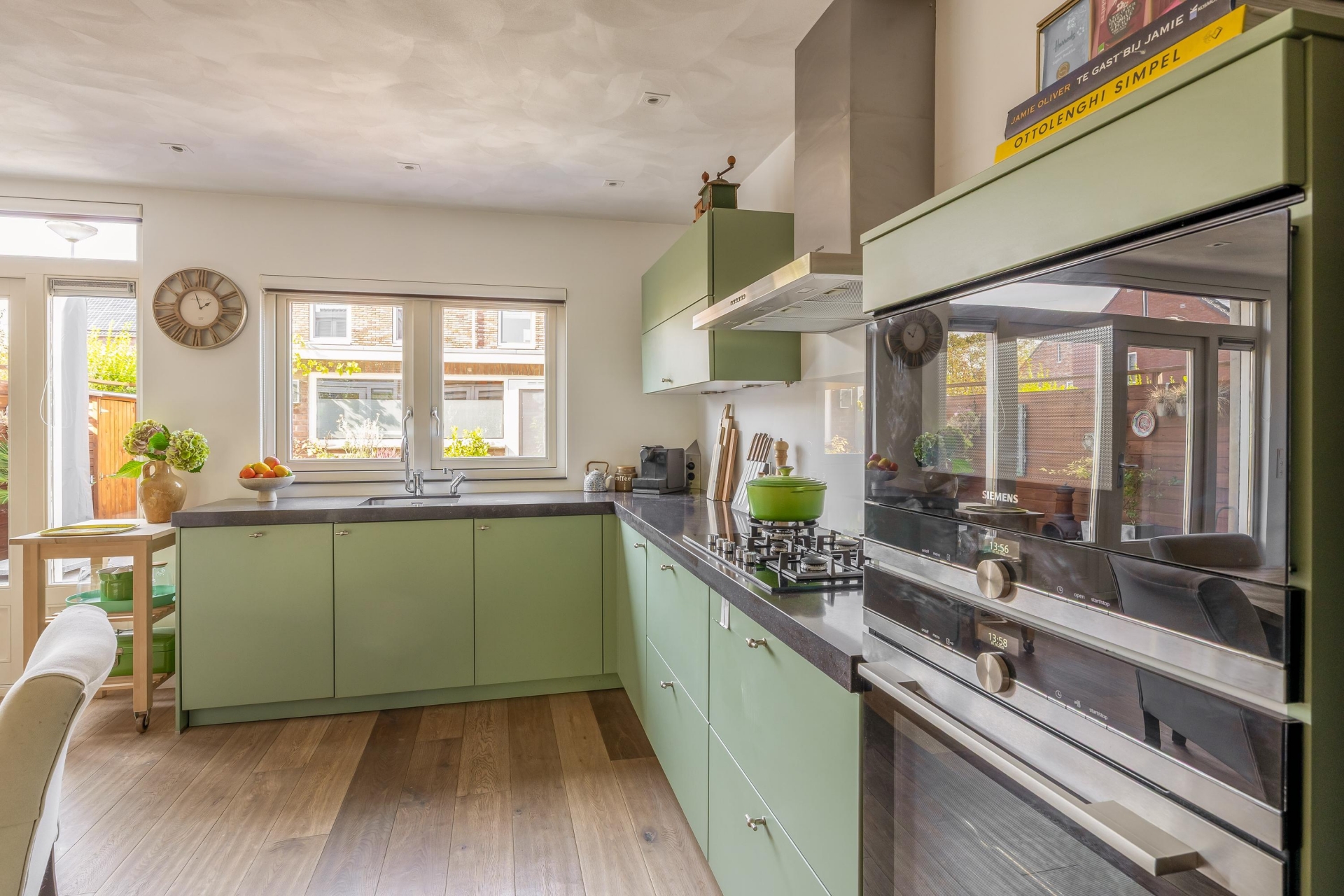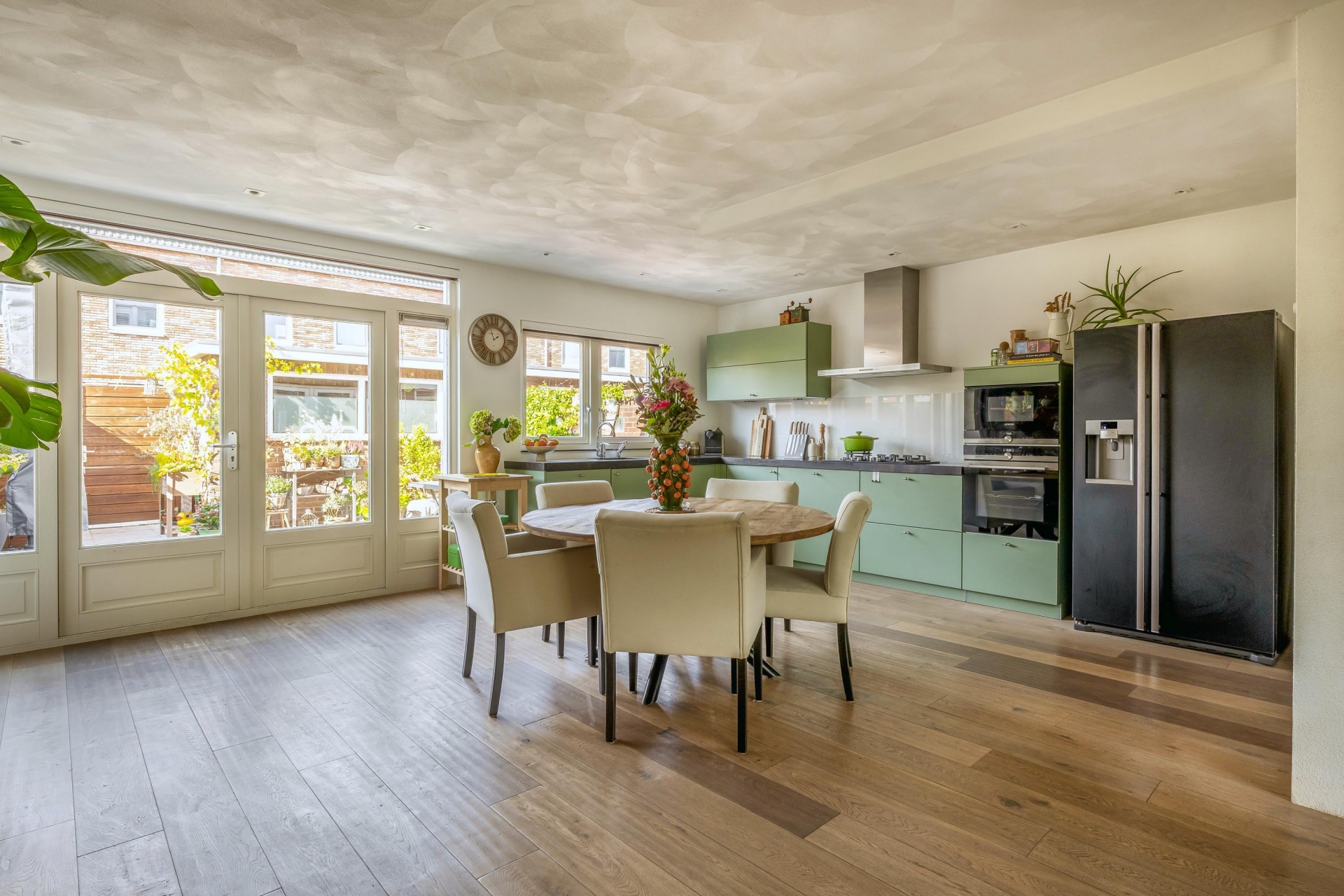 Bij binnenkomst valt direct de uitgebouwde woonkamer op: een heerlijke open ruimte met een warme sfeer, strak gestucte wanden en een natuurlijke lichtinval. De openslaande deuren naar de tuin zorgen voor een fijne verbinding tussen binnen en buiten. De zithoek aan de voorzijde kijkt uit op de rustige straat, terwijl het eetgedeelte aan de tuinzijde perfect aansluit op de moderne woonkeuken. De keuken heeft een frisse en eigentijdse uitstraling met een rustig kleurenpalet en praktische opstelling. Je vindt hier onder meer een vijfpits gasfornuis, een moderne afzuigkap, een combi-oven en een grote Amerikaanse koelkast. Ideaal voor de kookliefhebber die van ruimte én sfeer houdt.